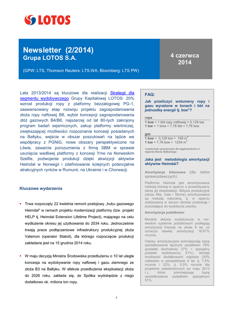 Newsletter (2/2014) 4 czerwca 2014 Grupa LOTOS S.A. (GPW: LTS, Thomson Reuters: LTS.WA, Bloomberg: LTS PW) Lata 2013/2014 są kluczowe dla realizacji Strategii dla segmentu wydobywczego Grupy Kapitałowej LOTOS: 20% wzrost produkcji ropy z platformy bezzałogowej PG-1, zaawansowany etap rozwoju projektu zagospodarowania złoża ropy naftowej B8, wybór koncepcji zagospodarowania złóżKluczowe gazowychwydarzenia B4/B6, najszerzej od lat 80-tych zakrojony program badań sejsmicznych, zakup platformy wiertniczej, zwiększającej możliwości rozpoznania koncesji posiadanych na Bałtyku, wejście w obszar poszukiwań na lądzie we współpracy z PGNiG, nowe obszary perspektywiczne na Litwie, zawarcie porozumienia z firmą SBM w sprawie usunięcia wadliwej platformy z koncesji Yme na Norweskim Szelfie, podwojenie produkcji dzięki akwizycji aktywów Heimdal w Norwegii i zdefiniowanie kolejnych potencjalnie atrakcyjnych rynków w Rumunii, na Ukrainie i w Chorwacji. FAQ: Jak przeliczyć wolumeny ropy i gazu wyrażone w tonach i bbl na jednostkę energii tj. boe*? ropa 1 boe = 1 bbl ropy naftowej = 0,129 toe 1 toe = 1 tona = 7,76 bbl = 7,76 boe gaz 3 1 boe = 0,129 toe = 159 m 3 1 toe = 7,76 boe = 1234 m *przeliczniki uproszczone dla węglowodorów w regionie Morza Bałtyckiego Jaka jest metodologia amortyzacji aktywów Heimdal? Amortyzacja bilansowa (dla celów sprawozdawczych): Kluczowe wydarzenia Trwa rozpoczęty 22 kwietnia remont postojowy „hubu gazowego Heimdal" w ramach projektu modernizacji platformy (tzw. projekt HELP tj. Heimdal Extension Lifetime Project), mającego na celu wydłużenie okresu jej użytkowania do 2034 roku. Jednocześnie trwają prace podłączeniowe infrastruktury produkcyjnej złoża Valemon (operator Statoil), dla którego rozpoczęcie produkcji zakładane jest na 15 grudnia 2014 roku. W maju decyzją Ministra Środowiska przedłużeniu o 10 lat uległa koncesja na wydobywanie ropy naftowej i gazu ziemnego ze złoża B3 na Bałtyku. W efekcie przedłużenia eksploatacji złoża do 2026 roku, zakłada się, że Spółka wydobędzie z niego dodatkowo ok. miliona ton ropy. 1 Platforma Heimdal jest amortyzowana metodą liniową w oparciu o przewidywany okres jej eksploatacji. Aktywa produkcyjne (złoża Atla, Vale i Skirne) amortyzowane są metodą naturalną, tj. w oparciu realizowaną w danym okresie produkcję i pozostające do wydobycia zasoby. Amortyzacja podatkowa: Morskie aktywa wydobywcze w norweskim systemie podatkowym podlegają amortyzacji liniowej na okres 6 lat, co oznacza stawkę amortyzacji 16,67% rocznie. Odpisy amortyzacyjne pomniejszają bazę opodatkowania łącznym podatkiem 78% (podatek dochodowy 27% + specjalny podatek wydobywczy 51%). Istnieje możliwość dodatkowych odpisów (30% nakładów w perspektywie 4 lat, tj. 7,5% rocznie i 22%, tj. 5,5% rocznie dla projektów zatwierdzonych po maju 2013 r.), które pomniejszają bazę opodatkowania podatkiem specjalnym 51%. Segment wydobywczy w ujęciu geograficznym W celu umożliwienia pogłębionej analizy wyniku segmentu wydobywczego Grupy LOTOS i w związku z występowaniem znacznych różnic w uwarunkowaniu prawno-podatkowym oraz kosztach ponoszonych na wydobycie węglowodorów w poszczególnych regionach działania Grupy, prezentujemy geograficzne rozbicie zysku EBITDA wypracowanego w 1 kw 2014 r. w segmencie wydobywczym. region EBITDA w 1 kw. 2014 (tys. PLN) udział w wyniku EBITDA segmentu (%) Polska 51 279 32% Litwa 27 537 17% Norwegia 82 627 51% Razem 161 443 100% Otoczenie rynkowe W maju ceny ropy Brent zwyżkowały do poziomu powyżej 109 USD/bbl. Spread Brent/Ural kształtował się na najwyższym od roku poziomie 1,92 USD/bbl, wspierając marżę rafineryjną Grupy LOTOS. Rentowność przerobu europejskich rafinerii osłabiło majowe tąpnięcie marż z notowań średnich destylatów. USA ograniczyły import benzyny, zwiększając jednocześnie eksport frakcji średnich do Europy. US Energy Information Administration podaje, że średnie wykorzystanie projektowych mocy wytwórczych amerykańskich rafinerii wzrosło w maju do 98,9%, na co nałożyło się zakończenie sezonu postojów remontowych rafinerii. Od początku 2014 r. Unia Europejska zniosła opodatkowanie importu paliwa lotniczego. Dodatkowa pula paliwa lotniczego, która pojawiła się na europejskim rynku z Bliskiego Wschodu i Korei, wpływa na zniżkę marży z notowań tego produktu. Inwestycje rozwojowe w dywersyfikację infrastruktury przesyłowej zapewniły Rosji elastyczność w kierunkach dostaw, strategicznie wzmacniając jej wpływ na kształtowanie ceny surowca (JBC FSU/CEE Insight, 29 maja 2014) i wspierając logistycznie rosnące moce przetwórcze rosyjskich rafinerii. W kwietniu odnotowano rekordowe wolumeny eksportu Diesla przez terminal w Primorsku. Dostawy rosyjskiej ropy stopniowo przekierowywane z zachodu na wschód, głównie do Chin, zostały częściowo zastąpione bardziej opłacalnym eksportem produktów naftowych do Europy (JBC Energy, Russia Focus, maj 2014). Dyferencjał Ural/Brent (USD/bbl) 2 źródło: na podstawie danych Thomson Reuters Średnie wartości w maju 2014* (USD/bbl) Modelowa marża rafineryjna 4,09 Cena ropy Brent Dated FOB 109,52 Ural CIF Rtd. 107,60 Spread Brent/Ural 1,92 Kursy walut EUR/PLN 4,18 USD/PLN 3,04 źródło: na podstawie danych Thomson Reuters Średnia wartość marż z notowań produktów ropopochodnych w maju 2014* (USD/bbl) źródło: na podstawie danych Thomson Reuters Grupa LOTOS na rynku paliw w Polsce* Benzyna 12,9 Krajowa konsumpcja paliw płynnych w kwietniu 2014 r. obniżyła się r/r o Benzyna surowa -2,2 3,3%. Kwietniowy udział marki LOTOS w polskim rynku paliw ogółem Paliwo lotnicze 14,9 Olej napędowy 17,7 wzrósł r/r o 0,6 p.p., tj. do poziomu 33,8%. Udział Grupy LOTOS w rynku detalicznym wyniósł 9,1%, co oznacza wzrost o 0,9 p.p. przy spadającej Lekki olej opałowy 14,5 Ciężki olej opałowy -17,1 o 1,7% r/r detalicznej konsumpcji paliw. źródł