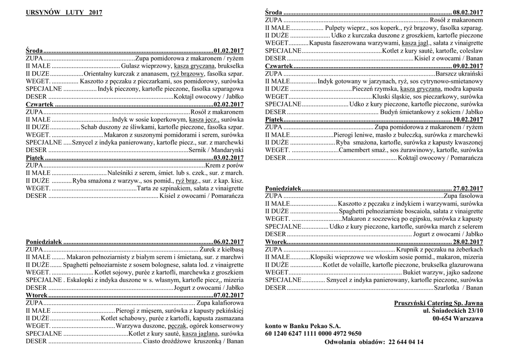 URSYNÓW_ LUTY 2017 Środa ...................................................................................................... 01.02.2017 ZUPA ....................................................... Zupa pomidorowa z makaronem / ryżem II MAŁE ......................................... Gulasz wieprzowy, kasza gryczana, brukselka II DUZE .................... Orientalny kurczak z ananasem, ryż brązowy, fasolka szpar. WEGET. ................ Kaszotto z pęczaku z pieczarkami, sos pomidorowy, surówka SPECJALNE .................... Indyk pieczony, kartofle pieczone, fasolka szparagowa DESER ........................................................................... Koktajl owocowy / Jabłko Czwartek ............................................................................................... 02.02.2017 ZUPA ........................................................................................ Rosół z makaronem II MAŁE .................................... Indyk w sosie koperkowym, kasza jęcz., surówka II DUZE .................. Schab duszony ze śliwkami, kartofle pieczone, fasolka szpar. WEGET. ............................... Makaron z suszonymi pomidorami i serem, surówka SPECJALNE ..... Sznycel z indyka panierowany, kartofle piecz., sur. z marchewki DESER ....................................................................................Sernik / Mandarynki Piątek ..................................................................................................... 03.02.2017 ZUPA .................................................................................................Krem z porów II MAŁE ................................. Naleśniki z serem, śmiet. lub s. czek., sur. z march. II DUŻE ............ Ryba smażona z warzyw., sos pomid., ryż brąz., sur. z kap. kisz. WEGET. ...................................................Tarta ze szpinakiem, sałata z vinaigrette DESER .................................................................. Kisiel z owocami / Pomarańcza Poniedziałek .......................................................................................... 06.02.2017 ZUPA ............................................................................................. Żurek z kiełbasą II MAŁE ........ Makaron pełnoziarnisty z białym serem i śmietaną, sur. z marchwi II DUŻE ....... Spaghetti pełnoziarniste z sosem bolognese, sałata lod. z vinaigrette WEGET. ......................... Kotlet sojowy, purée z kartofli, marchewka z groszkiem SPECJALNE . Eskalopki z indyka duszone w s. własnym, kartofle piecz., mizeria DESER ........................................................................... Jogurt z owocami / Jabłko Wtorek ................................................................................................... 07.02.2017 ZUPA ........................................................................................... Zupa kalafiorowa II MAŁE ...................................... Pierogi z mięsem, surówka z kapusty pekińskiej II DUŻE .............................. Kotlet schabowy, purée z kartofli, kapusta zasmazana WEGET. ...................................... Warzywa duszone, pęczak, ogórek konserwowy SPECJALNE .......................................Kotlet z kury sauté, kasza jaglana, surówka DESER ........................................................ Ciasto drożdżowe kruszonką / Banan Środa ..................................................................................................... 08.02.2017 ZUPA ....................................................................................... Rosół z makaronem II MAŁE .................... Pulpety wieprz., sos koperk., ryż brązowy, fasolka szparag. II DUŻE ........................ Udko z kurczaka duszone z groszkiem, kartofle pieczone WEGET............ Kapusta faszerowana warzywami, kasza jagl., sałata z vinaigrette SPECJALNE ................................................Kotlet z kury sauté, kartofle, coleslaw DESER ............................................................................ Kisiel z owocami / Banan Czwartek ............................................................................................... 09.02.2017 ZUPA ........................................................................................... Barszcz ukraiński II MAŁE ................ Indyk gotowany w jarzynach, ryż, sos cytrynowo-smietanowy II DUZE ..................................... Pieczeń rzymska, kasza gryczana, modra kapusta WEGET.................................................. Kluski śląskie, sos pieczarkowy, surówka SPECJALNE ............................ Udko z kury pieczone, kartofle pieczone, surówka DESER ....................................................... Budyń śmietankowy z sokiem / Jabłko Piątek ..................................................................................................... 10.02.2017 ZUPA ...................................................... Zupa pomidorowa z makaronem / ryżem II MAŁE ..........................Pierogi leniwe, masło z bułeczką, surówka z marchewki II DUŻE ........................... Ryba smażona, kartofle, surówka z kapusty kwaszonej WEGET. ........................... .Camembert smaż., sos żurawinowy, kartofle, surówka DESER .................................................................. Koktajl owocowy / Pomarańcza Poniedziałek .......................................................................................... 27.02.2017 ZUPA ................................................................................................Zupa fasolowa II MAŁE ............................ Kaszotto z pęczaku z indykiem i warzywami, surówka II DUŻE ............................. Spaghetti pełnoziarniste boscaiola, sałata z vinaigrette WEGET. ..............................Makaron z soczewicą po egipsku, surówka z kapusty SPECJALNE ................ Udko z kury pieczone, kartofle, surówka