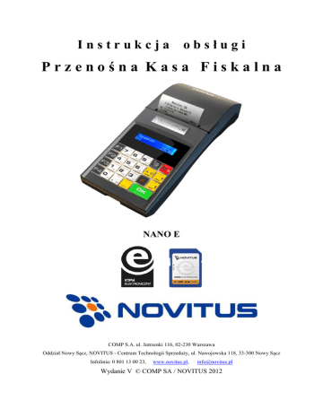 Instrukcja obsługi Przenośna Kasa Fiskalna NANO E COMP S.A. ul. Jutrzenki 116, 02-230 Warszawa Oddział Nowy Sącz, NOVITUS - Centrum Technologii Sprzedaży, ul. Nawojowska 118, 33-300 Nowy Sącz Infolinia: 0 801 13 00 23, www.novitus.pl, [email protected] Wydanie V © COMP SA / NOVITUS 2012 COMP SA, Oddział Nowy Sącz, NOVITUS – Centrum Technologii Sprzedaży NANO E Co powinieneś znać i wiedzieć przed przystąpieniem do pracy z kasą fiskalną NANO E: • • • parametry techniczne kasy (patrz punkt 2.1) warunki gwarancji (karta gwarancyjna) obsługę funkcji fiskalnych dostępnych dla użytkownika Każda nieprawidłowość w pracy kasy NANO E powinna być natychmiast sygnalizowana do autoryzowanego serwisu producenta. Odłączenie kasy od sieci następuje po odłączeniu wtyczki zasilacza od gniazda sieciowego, które powinno być usytuowane w pobliżu kasy i być łatwo dostępne. W kasie NANO E zastosowano drukarkę termiczną. Zaopatrując się w papier należy zażądać od dostawcy papieru certyfikatu, potwierdzającego, że może on być stosowany w urządzeniach fiskalnych, a wydrukowane na nim dokumenty mogą być przechowywane przez czas określony Ordynacją Podatkową. Należy również pamiętać o warunkach, w jakich producent papieru zaleca jego przechowywanie. W przypadku nieprzestrzegania tych wymagań może dojść do utraty danych (raportów), do przechowywania których użytkownik kasy jest zobowiązany. Urządzenie to spełnia wymagania w zakresie dopuszczalnych poziomów emisji zaburzeń elektromagnetycznych dla klasy A. W środowisku mieszkalnym może to powodować powstawanie zakłóceń radioelektrycznych. W takich przypadkach, jego użytkownik zobowiązany jest do zastosowania odpowiednich środków zaradczych. Przed wymianą papieru należy obowiązkowo dotknąć dłońmi uziemionej części metalowej. Zabrania się używania telefonów komórkowych w bezpośrednim sąsiedztwie kasy!!! Usuwanie zużytych urządzeń. Zużytego urządzenia, zgodnie z Art. 22 ust.1 i 2 Ustawy o zużytym sprzęcie elektrycznym i elektronicznym (Dz.U.180 poz. 1495), nie wolno umieszczać, wyrzucać, magazynować wraz z innymi odpadami. Niebezpieczne związki zawarte w sprzęcie elektrycznym i elektronicznym wykazują bardzo niekorzystne oddziaływanie na rośliny, drobnoustroje, a przede wszystkim na człowieka, uszkadzają bowiem jego układ centralny i obwodowy układ nerwowy oraz układ krwionośny i wewnętrzny, a dodatkowo powodują silne reakcje alergiczne. Zużyte urządzenie należy dostarczyć do lokalnego Punktu Zbiórki zużytych urządzeń elektrycznych, który zarejestrowany jest w Głównym Inspektoracie Ochrony Środowiska i prowadzi selektywną zbiórkę odpadów. Zapamiętaj!!!!! Zgodnie z Art. 35 ustawy, użytkownik sprzętu przeznaczonego dla gospodarstw domowych, po zużyciu takiego sprzętu, zobowiązany jest do oddania go zbierającemu zużyty sprzęt elektryczny i elektroniczny. Selektywna zbiórka odpadów pochodzących z gospodarstw domowych oraz ich przetwarzanie przyczynia się do ochrony środowiska, obniża przedostawanie się szkodliwych substancji do atmosfery oraz wód powierzchniowych. Informacje o usuwaniu akumulatorów i baterii z urządzenia zamieszczone w rozdziale: Instrukcja bezpiecznego usunięcia akumulatorów i baterii na końcu instrukcji obsługi. 2 COMP SA, Oddział Nowy Sącz, NOVITUS – Centrum Technologii Sprzedaży NANO E Spis treści: INFORMACJE OGÓLNE ................................................................................... 8 1. 1.1. Przeznaczenie kasy fiskalnej NANO E ................................................................. 8 1.2. Cechy podstawowe kasy........................................................................................ 9 1.3. Ewidencja sprzedaży za pomocą kasy ................................................................. 10 2. OPIS TECHNICZNY KASY NANO E ............................................................. 11 2.1. Parametry techniczne........................................................................................... 11 2.2. Funkcje fiskalne .................................................................................................. 11 2.3. Zasady użytkowania urządzeń zasilanych akumulatorami Litowo-Jonowymi. ... 12 2.4. Kopia elektroniczna – informacje podstawowe ................................................... 12 2.5. Kopia Elektroniczna – zalecenia podstawowe .................................................... 14 2.6. Kopia elektroniczna – zasada działania ............................................................... 17 2.7. Wygląd kasy ........................................................................................................ 20 2.8. Pokrywa drukarki ................................................................................................ 20 2.9. Złącza komunikacyjne i zasilające ...................................................................... 20 2.10. Mechanizm drukujący ......................................................................................... 20 2.11. Karta Kopii Elektronicznej .................................................................................. 21 2.12. Klawiatura - funkcje klawiszy ............................................................................. 21 2.13. Wyświetlacze....................................................................................................... 25 2.14. Znaki specjalne na wyświetlaczu obsługi ............................................................ 25 2.15. Menu kasy ........................................................................................................... 26 3. Włączanie i wyłączanie kasy oraz jej tryby oszczędzania energii ................... 32 3.1. Podłączanie i konfiguracja czytnika kodów kreskowych. ................................... 33 3.2. Podłączanie wagi ...................................