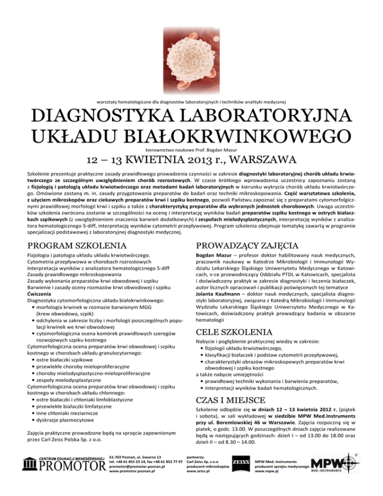warsztaty hematologiczne dla diagnostów laboratoryjnych i techników analityki medycznej DIAGNOSTYKA LABORATORYJNA UKŁADU BIAŁOKRWINKOWEGO kierownictwo naukowe Prof. Bogdan Mazur 12 – 13 KWIETNIA 2013 r., WARSZAWA Szkolenie prezentuje praktyczne zasady prawidłowego prowadzenia czynności w zakresie diagnostyki laboratoryjnej chorób układu krwiotwórczego ze szczególnym uwzględnieniem chorób rozrostowych. W czasie krótkiego wprowadzenia uczestnicy zapoznaniu zostaną z fizjologią i patologią układu krwiotwórczego oraz metodami badań laboratoryjnych w kierunku wykrycia chorób układu krwiotwórczego. Omówione zostaną m. in. zasady przygotowania preparatów do badań oraz techniki mikroskopowania. Część warsztatowa szkolenia, z użyciem mikroskopów oraz ciekawych preparatów krwi i szpiku kostnego, pozwoli Państwu zapoznać się z preparatami cytomorfolgicznymi prawidłowej morfologii krwi i szpiku a także z charakterystyką preparatów dla wybranych jednostek chorobowych. Uwaga uczestników szkolenia zwrócona zostanie w szczególności na ocenę i interpretację wyników badań preparatów szpiku kostnego w ostrych białaczkach szpikowych (z uwzględnieniem znaczenia barwień dodatkowych) i zespołach mielodysplastycznych, interpretację wyników z analizatora hematologicznego 5-diff, interpretację wyników cytometrii przepływowej. Program szkolenia obejmuje tematykę zawartą w programie specjalizacji podstawowej z laboratoryjnej diagnostyki medycznej. PROGRAM SZKOLENIA PROWADZĄCY ZAJĘCIA Fizjologia i patologia układu układu krwiotwórczego. Cytometria przepływowa w chorobach rozrostowych Interpretacja wyników z analizatora hematologicznego 5-diff Zasady prawidłowego mikroskopowania Zasady wykonania preparatów krwi obwodowej i szpiku Barwienie i zasady oceny rozmazów krwi obwodowej i szpiku Ćwiczenia Diagnostyka cytomorfologiczna układu białokrwinkowego: • morfologia krwinek w rozmazie barwionym MGG (krew obwodowa, szpik) • odchylenia w zakresie liczby i morfologii poszczególnych populacji krwinek we krwi obwodowej • cytomorfologiczna ocena komórek prawidłowych szeregów rozwojowych szpiku kostnego Cytomorfologiczna ocena preparatów krwi obwodowej i szpiku kostnego w chorobach układu granulocytarnego: • ostre białaczki szpikowe • przewlekłe choroby mieloproliferacyjne • choroby mielodysplastyczno-mieloproliferacyjne • zespoły mielodysplastyczne Cytomorfologiczna ocena preparatów krwi obwodowej i szpiku kostnego w chorobach układu chłonnego: • ostre białaczki i chłoniaki limfoblastyczne • przewlekłe białaczki limfatyczne • inne chłoniaki nieziarnicze • dyskrazje plazmocytowe Bogdan Mazur – profesor doktor habilitowany nauk medycznych, pracownik naukowy w Katedrze Mikrobiologii i Immunologii Wydziału Lekarskiego Śląskiego Uniwersytetu Medycznego w Katowicach, v-ce przewodniczący Oddziału PTDL w Katowicach, specjalista i doświadczony praktyk w zakresie diagnostyki i leczenia białaczek, autor licznych opracowań i publikacji poświęconych tej tematyce Jolanta Kaufmann – doktor nauk medycznych, specjalista diagnostyki laboratoryjnej, związana z Katedrą Mikrobiologii i Immunologii Wydziału Lekarskiego Śląskiego Uniwersytetu Medycznego w Katowicach, doświadczony praktyk prowadzący badania w obszarze hematologii Zajęcia praktyczne prowadzone będą na sprzęcie zapewnionym przez Carl Zeiss Polska Sp. z o.o. 61-702 Poznań, ul. Gwarna 13 tel. +48 61 855 23 14, fax +48 61 852 77 97 [email protected] www.promotor.poznan.pl CELE SZKOLENIA Nabycie i pogłębienie praktycznej wiedzy w zakresie: • fizjologii układu krwiotwórczego, • klasyfikacji białaczek i podstaw cytometrii przepływowej, • charakterystyki obrazów mikroskopowych preparatów krwi obwodowej i szpiku kostnego a także nabycie umiejętności • prawidłowej techniki wykonania i barwienia preparatów, • interpretacji wyników badań hematologicznych. CZAS I MIEJSCE Szkolenie odbędzie się w dniach 12 – 13 kwietnia 2012 r. (piątek i sobota), w sali wykładowej w siedzibie MPW Med.Instruments przy ul. Boremlowskiej 46 w Warszawie. Zajęcia rozpoczną się w piatek, o godz. 13.00. W poszczególnych dniach zajęcia realizowane będą w następujących godzinach: dzień I – od 13.00 do 18.00 oraz dzień II – od 8.30 – 14.00. partnerzy: Carl Zeiss Sp. z o.o producent mikroskopów www.zeiss.pl MPW Med. Instruments producent sprzętu medycznego www.mpw.pl DIAGNOSTYKA LABORATORYJNA UKŁADU BIAŁOKRWINKOWEGO WARUNKI UCZESTNICTWA Cena uczestnictwa jednej osoby w warsztatach wynosi 550,- zł netto. Cena ta jest dla diagnostów laboratoryjnych ceną brutto (prosimy o podanie w karcie zgłoszenia nr wpisu na listę diagnostów laboratoryjnych). Możliwe jest także zwolnienie z VAT w przypadku finansowania szkolenia ze środków publicznych (np. przez SPZOZ finansowanych przez NFZ). Dla pozostałych osób do ceny szkolenia doliczany jest podatek VAT w wysokości 23%. Cena obejmuje zajęcia warsztatowe, konsultacje, bogate materiały szkoleniowe, przybory do pisania, imienny certyfikat ukończenia szkolenia, poczęstunek, obiady, kolacje. Cena nie obejmuje kosztów zakwaterowania. Istnieje możliwość uzyskania zniżki – prosimy o kontakt w tej sprawie z biurem CEM Promotor. Warunkiem przyjęcia na listę uczestników jest przesłanie do biura CEM Promotor karty zgłoszenia udziału w szkoleniu. Organizator zastrzega sobie prawo do dokonywania zmian w programie wynikających z przyczyn niezależnych od CEM Promotor. Szkolenie zostanie zrealizowane pod warunkiem zebrania minimalnej wymaganej liczby uczestników. Szkolenie umożliwia zdobycie punktów edukacyjnych w ramach doskonalenia zawodowego diagnostów laboratoryjnych. ZGŁOSZENIE UDZIAŁU Zgłoszenia uczestnictwa w warsztatach dokonywane są na podstawie przesłanej do biura CEM Promotor karty zgłoszenia zamieszczonej poniżej. Termin nadsyłania zgłoszeń udziału mija 5 kw