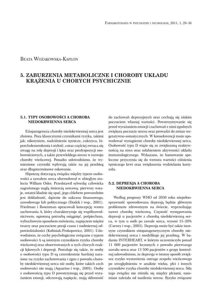 Farmakoterapia w psychiatrii i neurologii, 2011, 1, 29–36 Beata Wożakowska-Kapłon 5. ZABURZENIA METABOLICZNE I CHOROBY UKŁADU KRĄŻENIA U CHORYCH PSYCHICZNIE 5.1. T ypy osobowości a choroba niedokrwienna serca Etiopatogeneza choroby niedokrwiennej serca jest złożona. Poza klasycznymi czynnikami ryzyka, takimi jak: nikotynizm, nadciśnienie tętnicze, cukrzyca, hipercholesterolemia i otyłość, coraz częściej zwraca się uwagę na rolę depresji i lęku oraz predyspozycji osobowościowych, a także przewlekłego stresu w rozwoju choroby wieńcowej. Ponadto udowodniono, że wymienione czynniki wpływają także na jej przebieg oraz długoterminowe rokowanie. Hipotezę dotyczącą związku między typem osobowości a zawałem serca sformułował w ubiegłym stuleciu William Osler. Przedstawił sylwetkę człowieka zagrożonego nagłą śmiercią sercową: pierwszy wstaje, ostatni kładzie się spać, jego chlebem powszednim jest dokładność, dążenie do sukcesu finansowego, zawodowego lub politycznego (Dudek i wsp., 2001). Friedman i Rosenman opracowali koncepcję wzoru zachowania A, który charakteryzuje się współzawodnictwem, ogromną potrzebą osiągnięć, pośpiechem, wybuchowym sposobem mówienia, napięciem mięśni twarzy oraz poczuciem presji czasu i nadmiernej odpowiedzialności (Kubisiak-Prokopowicz, 2001). Udowodniono, że cechy psychologiczne związane z typem osobowości A są istotnym czynnikiem ryzyka choroby wieńcowej oraz obserwowanych u tych chorych reakcji lękowych i depresji. Postuluje się także, że osoby o osobowości typu D są czterokrotnie bardziej narażone na ryzyko zachorowania i zgon z powodu choroby niedokrwiennej serca niż osoby, które takich cech osobowości nie mają (Aquarius i wsp., 2005). Osoby z osobowością typu D powstrzymują się przed wyrażaniem emocji, odczuwają napięcie, mają skłonność do zachowań depresyjnych oraz cechują się niskim poczuciem własnej wartości. Powstrzymywanie się przed wyrażaniem emocji i zachowań z nimi zgodnych zwiększa poczucie stresu oraz prowadzi do zmian wegetatywno-somatycznych. W konsekwencji może spowodować wystąpienie choroby niedokrwiennej serca. Osobowość typu D wiąże się ze zwiększoną reaktywnością na stres oraz osłabieniem aktywności układu immunologicznego. Wykazano, że hamowanie społeczne przyczynia się do wzrostu wartości ciśnienia tętniczego krwi oraz zwiększenia wydzielania kortyzolu. 5.2. Depresja a choroba niedokrwienna serca Według prognozy WHO od 2030 roku niepełnosprawność spowodowana depresją będzie głównym problemem zdrowotnym na świecie, wyprzedzając nawet chorobę wieńcową. Częstość występowania depresji u pacjentów z chorobą niedokrwienną serca, w tym u osób po zawale serca, wynosi 15–20% (Carney i wsp., 2003). Depresja może być także istotnym czynnikiem etiopatogenetycznym choroby niedokrwiennej serca i modyfikuje jej przebieg. W badaniu INTERHEART, w którym uczestniczyło ponad 11 000 pacjentów leczonych z powodu pierwszego zawału serca oraz 13 500 pacjentów z grupy kontrolnej udowodniono, że depresja w istotny sposób zwiększa ryzyko wystawienia ostrego zespołu wieńcowego po uwzględnieniu w analizie wieku, płci i innych czynników ryzyka choroby niedokrwiennej serca. Siła tego związku nie różniła się między płciami, natomiast zależała od nasilenia stresu. Ryzyko związane 30 M. Jarema, J. Rabe-Jabłońska, D. Pupek-Musalik, L. Ostrowska, B. Wożakowska-Kapłon, J. Heitzman z depresją w populacjach, gdzie jej występowanie jest 10-krotnie większe niż w grupach osób zdrowych, jest porównywalne do tego wywoływanego przez klasyczne czynniki ryzyka sercowo-naczyniowego jak nikotynizm, nadciśnienie i cukrzyca (McQueen i wsp., 2008). Wśród mechanizmów odpowiedzialnych za związek między depresją a chorobą wieńcową wymienia się zaburzenia w funkcjonowaniu osi podwzgórze– przysadka–nadnercza (HPA, hypothalamic-pituitary-adrenal axis), zwanej „osią stresu”, zaburzenia równowagi pomiędzy układem współczulnym i przywspółczulnym, nieprawidłowości w układzie krzepnięcia, przewlekły proces zapalny oraz dysfunkcję śródbłonka naczyniowego. Aktywacja osi HPA, prowadząca do wzrostu stężenia adrenaliny i kortyzolu, odgrywa kluczową rolę w odpowiedzi na bodźce stresowe. W przypadku przedłużania się sytuacji stresowej lub upośledzenia działania pętli sprzężeń zwrotnych dochodzi do stresu przewlekłego. Przewlekła hiperkortyzolemia i utrzymująca się aktywacja układu autonomicznego są bardzo niekorzystne dla organizmu, powodują immunosupresję, wzrost wartości stężenia cholesterolu i wartości ciśnienia tętniczego krwi oraz zahamowanie produkcji hormonów płciowych (Matysiakiewicz i wsp., 2005). Zaburzenia depresyjne przebiegają tak, jak przewlekły stres, prowadząc do występowania niekorzystnych dla układu sercowo-naczyniowego procesów patofizjologicznych. Najbardziej prawdopodobnym mechanizmem leżącym u podłoża depresji oraz choroby niedokrwiennej serca jest zaburzona równowaga między układem współczulnym a przywspółczulnym. Zmniejszenie aktywności układu przywspółczulnego przy jednoczesnym zwiększeniu aktywności układu współczulnego prowadzą do zmniejszenia progu niedokrwienia myocardium oraz zwiększenia częstości występowania groźnych dla życia komorowych zaburzeń rytmu serca (Carney i wsp., 2005). Parametrem oceniającym aktywność autonomiczną serca jest zmienność rytmu serca (HRV, heart rate variability). Jego niska wartość świadczy o przewadze układu adrenergicznego i jest czynnikiem ryzyka zgonu u pacjentów z chorobą wieńcową. Zaobserwowano, że niższa wartość HRV wiąże się z obecnością depresji u pacjentów z chorobą wieńcową. Wzrost reaktywności płytek krwi jest kolejnym postulowanym elementem łączącym chorobę niedokrwienną serca z czynnikami psychosocjalnymi. Wykładnikami 