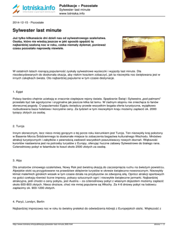 Publikacje » Pozostałe Sylwester last minute www.lotniska.info 2014-12-15 - Pozostałe Sylwester last minute Już tylko kilkanaście dni dzieli nas od sylwestrowego szaleństwa. Osoby, które nie wiedzą jeszcze w jaki sposób spędzić tę najbardziej szaloną noc w roku, czeka niemały dylemat, ponieważ czasu pozostało naprawdę niewiele. W ostatnich latach rosnącą popularność zyskały sylwestrowe wycieczki i wyjazdy last minute. Dla niezdecydowanych do doskonała okazja, aby niskim kosztem zobaczyć, jak ta niezwykła noc świętowana jest w innych zakątkach świata. Oto najbardziej popularne w tym czasie destynacje. 1. Egipt Polacy bardzo chętnie uciekają w znacznie cieplejsze rejony świata. Spędzanie Świąt i Sylwestra „pod palmami” przestało być tak egzotyczne i oryginalne jak jeszcze kilka lat temu. W żadnym stopniu nie zniechęca to fanów słonecznej pogody. O popularności Egiptu świadczy przede wszystkim bogata oferta turystyczna, wyjątkowo rozbudowana baza hotelowa i korzystne ceny. Za tydzień w tym niezwykłym kraju możemy zapłacić ok. 2000 tysięcy złotych za osobę. 2. Turcja Innym słonecznym, lecz nieco mniej gorącym o tej porze roku kierunkiem jest Turcja. Ten niezwykły kraj położony w Basenie Morza Śródziemnego to doskonałe miejsce to zobaczenia bogactwa kulturalnego Wschodu. Mnóstwo atrakcji turystycznych i zabytków z pewnością zadowoli wszystkich poszukiwaczy nowych doznań. Większość kurortów nastawiona jest na potrzeby turystów z Europy, oferując huczne zabawy Sylwestrowe do białego rana. Czterodniowy pobyt w Istambule to koszt około 2500 złotych za osobę. 3. Alpy Dla amatorów zimowego szaleństwa, Nowy Rok jest świetną okazją do zaczerpnięcia ruchu na świeżym powietrzu. Alpejskie stoki są przygotowane na prawdziwe oblężenie turystów w okresie świąteczno-noworocznym. Niezwykły klimat maleńkich górskich wiosek w tym czasie działa na przybyszów ze zdwojoną siłą. Oprócz atrakcji sportowych na gości czekają również liczne imprezy, pokazy sztucznych ogni i niezwykłe świąteczne jarmarki. Najbardziej atrakcyjna, jeśli chodzi o ceny pobytu, jest Austria – za czterodniowy pobyt z własnym dojazdem możemy zapłacić około 600-800 złotych. Nieco droższe, choć nie mniej popularne są Włochy. Za 4-6 dniowy pobyt na lodowcu zapłacimy ok. 900-1200 złotych. 4. Paryż, Londyn, Berlin Najbardziej imprezowa noc w roku to świetny pretekst do odwiedzenia którejś z Europejskich stolic. Większość z http://www.lotniska.info/publikacja,sylwester-last-minute,365.html strona 1 / 2 Publikacje » Pozostałe Sylwester last minute www.lotniska.info nich przygotowało huczne zabawy plenerowe i pokazy fajerwerków. Te najbardziej znane – w Londynie i Paryżu mogą zgromadzić nawet kilka milionów widzów! To doskonała okazja, by połączyć zabawę ze zwiedzaniem. Za nocleg w najpopularniejszych miastach Europy możemy zapłacić nawet o 1/3 ceny mniej niż w sezonie letnim. 5. Czechy i Węgry Praga i Budapeszt od wielu lat cieszą się niesłabnącym zainteresowaniem wśród Polskich turystów. Niewielki koszt podróży i hoteli, a także mnóstwo wyjazdów zorganizowanych sprawia, że to jedne z najtańszych, a jednocześnie najbardziej atrakcyjnych ofert zimowych wyjazdów. Oprócz popularnych zabytków, warto skorzystać z jednej z lokalnych ofert SPA – ceny o tej porze roku są dużo niższe, a wielogodzinne zwiedzanie i zabawa Sylwestrowa wymaga odpowiedniej regeneracji. Zbliżające się dni to ostatni moment na zaplanowanie noworocznego wyjazdu. Wiele biur podróży wciąż przyjmuje rezerwacje last minute na Sylwestra. Niektóre oferty przyciągają korzystnymi cenami. Najlepsze z nich znajdziemy na stronie internetowej Kupon.pl, w zakładce „Podróże”. Strona współpracuje z największymi serwisami rezerwacyjnymi w Polsce i Europie (m.in. Travelist, Iberostar, TUI, Lufthansa czy Booking.com), dzięki czemu oferuje swoim użytkownikom dostęp do najświeższych zniżek i rabatów na noclegi, bilety lotnicze i wycieczki last minute. Kupony rabatowe Lufthansa na Kupon.pl, Tui, Quatar Airways oraz wielu innych lini lotniczych i biur podróży pozwolą nam znacznie zaoszczędzić na wyjeździe, szczególnie tym spontanicznym. http://www.lotniska.info/publikacja,sylwester-last-minute,365.html http://www.lotniska.info/publikacja,sylwester-last-minute,365.html Powered by TCPDF (www.tcpdf.org) strona 2 / 2