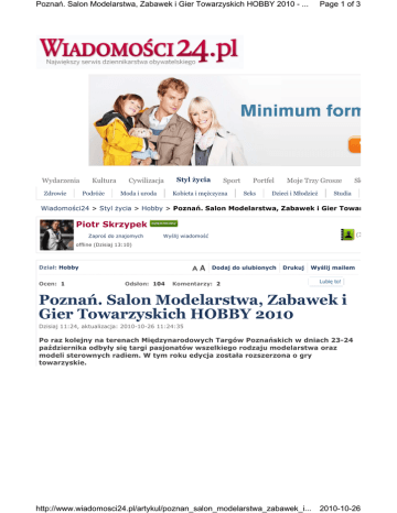 Poznań. Salon Modelarstwa, Zabawek i Gier Towarzyskich HOBBY 2010 - ... Wydarzenia Zdrowie Kultura Podróże Cywilizacja Moda i uroda Styl życia Sport Kobieta i mężczyzna Portfel Seks Page 1 of 3 Moje Trzy Grosze Dzieci i Młodzież Sklepy Studia Wiadomości24 > Styl Ŝycia > Hobby > Poznań. Salon Modelarstwa, Zabawek i Gier Towarzyskich H Piotr Skrzypek Zaproś do znajomych (33) Wyślij wiadomość offline (Dzisiaj 13:10) Dział: Hobby Ocen: 1 Dodaj do ulubionych Odsłon: 104 Drukuj Wyślij mailem Komentarzy: 2 Lubię to! Poznań. Salon Modelarstwa, Zabawek i Gier Towarzyskich HOBBY 2010 Dzisiaj 11:24, aktualizacja: 2010-10-26 11:24:35 Po raz kolejny na terenach Międzynarodowych Targów Poznańskich w dniach 23-24 października odbyły się targi pasjonatów wszelkiego rodzaju modelarstwa oraz modeli sterownych radiem. W tym roku edycja została rozszerzona o gry towarzyskie. http://www.wiadomosci24.pl/artykul/poznan_salon_modelarstwa_zabawek_i... 2010-10-26 Poznań. Salon Modelarstwa, Zabawek i Gier Towarzyskich HOBBY 2010 - ... Page 2 of 3 Tegoroczna edycja targów HOBBY rozszerzona została o gry towarzyskie. Osobiście spodziewałem się typowych gier planszowych, które stają się coraz bardziej popularne, jednak na targach pojawiły się gry oparte na imponujących makietach Fot. Pi Oceń: Lubię to! Dodaj do Powiązane materiały Poznań. Największa atrakcja HOBBY 2010 - makieta kolei Kwiaty umierają stojąc Poznań. Targi Hobby 2010 - kolejna edycja juŜ za dwa tygodnie Chryzantemy - kwiaty jesieni Chwila dla oka i duszy. Zdjęcia kwiatów Reklamy Google Wiadomosci Z Polski Aktualne Wiadomosci Wiadomości Dnia Boks Wiadomosci Wiadomo HOBBY 2010 Salon Modelarstwa targi HOBBY Poznań 2010 symulator kolei samochody na radio samoloty sterowane radiem Materiał sponsorują: http://www.wiadomosci24.pl/artykul/poznan_salon_modelarstwa_zabawek_i... 2010-10-26 Poznań. Salon Modelarstwa, Zabawek i Gier Towarzyskich HOBBY 2010 - ... Page 3 of 3 Zostań sponsorem Komentarze: 2 Jolanta Paczkowska Sortuj komentarze: od najstarszego Dzisiaj 11:48 od najnowszego Ocena: 0 0 Ocena: 0 0 Wspaniałe! Skąd ja to wszystko znam... :)) Piotr Skrzypek Dzisiaj 11:45 Druga część relacji tutaj link Twoje imię i nazwisko odświeŜ Wpisz kod z obrazka Twój komentarz Maksymalnie 4000 znaków. (moŜesz jeszcze wpisać: 4000) Wyślij Copyright 2010 Wiadomosci24.pl Realizacja serwisu: Gratka Technologie Sp. z o.o. Mapa serwisu http://www.wiadomosci24.pl/artykul/poznan_salon_modelarstwa_zabawek_i... O redakcji 2010-10-26