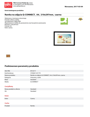PBS Connect Polska Sp. z o.o. ul. Annopol 3, 03-236 Warszawa www.pbspolska.eu Warszawa, 2017-03-04 Karta katalogowa produktu: Ramka na zdjęcia Q-CONNECT, A4, 210x297mm, czarna Wykonana z tworzywa sztucznego Posiada szklaną szybkę Tył wykonany z płyty HDF Wyposażona w nóżkę do postawienia oraz haczyk do zawieszania Rozmiar: 210x297mm Format: A4 Kolor czarny Podstawowe parametry produktu SKU PBS KF16717 Kod kreskowy 5705831167179 Nazwa produktu Ramka na zdjęcia Q-CONNECT, A4, 210x297mm, czarna Kategoria Antyramy, ramki Klasa Standard Marka Q-CONNECT Certyfikaty Nowy produkt w ofercie Standard Hit Standard Kolor Kolor Czarny Cecha Produkt Ramka PBS Connect Polska Sp. z o.o. ul. Annopol 3, 03-236 Warszawa www.pbspolska.eu Karta katalogowa produktu cd. Ramka na zdjęcia Q-CONNECT, A4, 210x297mm, czarna Podstawowe parametry produktu Materiał Tworzywo W ofercie od 2014-08 Wymiary Wymiary (mm) 210x297 Format A4 Wspólny słownik zamówień CPV 39298100-8 Ramki do fotografii Jednostki logistyczne Opakowanie 1 25 szt Opakowanie 2 875 szt Warszawa, 2017-03-04