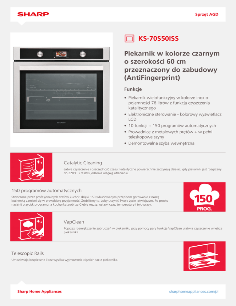 Sprzęt AGD KS-70S50ISS Piekarnik w kolorze czarnym o szerokości 60 cm przeznaczony do zabudowy (AntiFingerprint) Funkcje Piekarnik wielofunkcyjny w kolorze inox o pojemności 78 litrów z funkcją czyszczenia katalitycznego Elektroniczne sterowanie - kolorowy wyświetlacz LCD 10 funkcji + 150 programów automatycznych Prowadnice z metalowych prętów + w pełni teleskopowe szyny Demontowalna szyba wewnętrzna Catalytic Cleaning Łatwe czyszczenie i oszczędność czasu: katalityczne powierzchnie zaczynają działać, gdy piekarnik jest rozgrzany do 220ºC i resztki jedzenia ulegają utlenianiu. 150 programów automatycznych Stworzone przez profesjonalnych szefów kuchni: dzięki 150 wbudowanym przepisom gotowanie z naszą kuchenką zamieni się w prawdziwą przyjemność. Zrobiliśmy to, żeby uczynić Twoje życie łatwiejszym. Po prostu naciśnij przycisk programu, a kuchenka zrobi za Ciebie resztę: ustawi czas, temperaturę i tryb pracy. VapClean Poprzez rozmiękczenie zabrudzeń w piekarniku przy pomocy pary funkcja VapClean ułatwia czyszczenie wnętrza piekarnika. Telescopic Rails Umożliwiają bezpieczne i bez wysiłku wyjmowanie ciężkich tac z piekarnika. Sharp Home Appliances sharphomeappliances.com/pl Sprzęt AGD Kluczowe cechy Sposób czyszczenia Katalityczny Sposób grzania Wielofunkcyjny Typ konstrukcji Typ pokrywy (liczba szklanych pokryw) Całkowicie szklana pokrywa (3) Do zabudowy Demontowalna wewnętrzna szyba pokrywy Tak Kolor Inox (AntiFingerprint) Typ prowadnic Prowadnice z drutu Szerokość (cm) 60cm Liczba poziomów ułożenia blach 5 Klasa efektywności energetycznej A Uchwyt Inox Typ sterowania Elektroniczny Materiał, z którego wykonane jest wnętrze kuchenki Szara emalia + katalityczny panel tylny Kolorowy wyświetlacz LCD Tak Gwarancja (w latach) Dwa lata na części i robociznę Pokrywa piekarnika Pokrywa odchylana do dołu Functions Liczba funkcji 10 System VapClean Tak PowerBoost Tak Programy automatyczne (liczba) Yes (150) Tryby pracy Oświetlenie, rozmrażanie, grzanie od góry + od dołu + termoobieg + termoobieg obwodowy, grzanie od góry + grzanie od dołu, grzanie od góry + grzanie od dołu + termoobieg, pizza, grill + rożen, podwójny grill + rożen, podwójny grill + termoobieg + rożen, c Zakres regulacji temperatury (°C) 50-275 Sharp Home Appliances sharphomeappliances.com/pl Sprzęt AGD Mocy, zużycia i napięcia Moc (W) 3100 Górny element grzejny (W) 1200 Dolny element grzejny (W) Zużycie energii - tryb statyczny (kWh/cykl) 0.99 1100 Zużycie energii - obieg wymuszony (kWh/cykl) 0.93 Grill (W) 1400 Napięcie (V) / częstotliwość (Hz) 220-240V / 50Hz Podwójny grill (W) 1400-2600 Bezpiecznik źródła zasilania/wyłącznik obwodu (A) 13.5 Wentylator (W) 23 Wentylator z pierścieniem (W) 2000 Masa, kg (netto) 36 Masa, kg (brutto) 38.7 Pojemność komory (w litrach) 78 Blokada pokrywy Nie Przełącznik pokrywy Tak Zestaw do pizzy Tak (opcjonalny) Wymiary i waga Wymiary piekarnika, sz. x w. x g. (cm) 595 x 595 x 575 Wymiary opakowania (sz. x w. x g.) mm 680 x 640 x 630 Wymiary komory (sz.) x (wys.) x (gł.) mm 450 x 413 x 392 Wymiary otworu montażowego, sz. x w. x g. (mm) 580 x 590 x 555 Safety Wentylator chłodzący Tak Technologia ActiveCool Nie Wyposażenie Podświetlenie piekarnika Tak (na górze i z boków) Łagodne zamykanie drzwi (SoftClosingDoor) Tak Ruszt (liczba) 1 Prowadnice teleskopowe 1 zestaw pełnych prowadnic teleskopowych Blachy (liczba) 3 (1 płytka, 1 głęboka, 1 mała) Sonda do mięsa RoastPro Tak Przewód zasilający (m) Tak (1,6 m) Rożen RoastPro Tak Sharp Home Appliances sharphomeappliances.com/pl Sprzęt AGD European article number Kod EAN Sharp Home Appliances Powered by TCPDF (www.tcpdf.org) 4974019880587 sharphomeappliances.com/pl