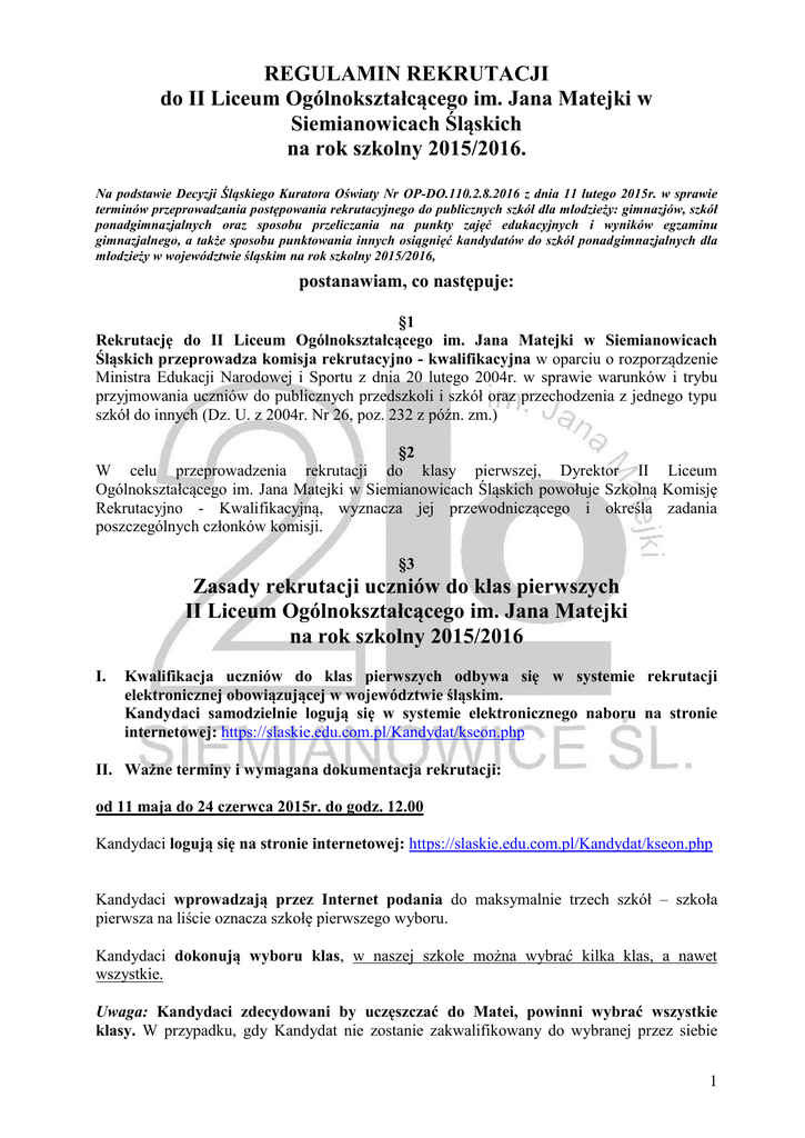 REGULAMIN REKRUTACJI do II Liceum Ogólnokształcącego im. Jana Matejki w Siemianowicach Śląskich na rok szkolny 2015/2016. Na podstawie Decyzji Śląskiego Kuratora Oświaty Nr OP-DO.110.2.8.2016 z dnia 11 lutego 2015r. w sprawie terminów przeprowadzania postępowania rekrutacyjnego do publicznych szkół dla młodzieży: gimnazjów, szkół ponadgimnazjalnych oraz sposobu przeliczania na punkty zajęć edukacyjnych i wyników egzaminu gimnazjalnego, a także sposobu punktowania innych osiągnięć kandydatów do szkół ponadgimnazjalnych dla młodzieży w województwie śląskim na rok szkolny 2015/2016, postanawiam, co następuje: §1 Rekrutację do II Liceum Ogólnokształcącego im. Jana Matejki w Siemianowicach Śląskich przeprowadza komisja rekrutacyjno - kwalifikacyjna w oparciu o rozporządzenie Ministra Edukacji Narodowej i Sportu z dnia 20 lutego 2004r. w sprawie warunków i trybu przyjmowania uczniów do publicznych przedszkoli i szkół oraz przechodzenia z jednego typu szkół do innych (Dz. U. z 2004r. Nr 26, poz. 232 z późn. zm.) §2 W celu przeprowadzenia rekrutacji do klasy pierwszej, Dyrektor II Liceum Ogólnokształcącego im. Jana Matejki w Siemianowicach Śląskich powołuje Szkolną Komisję Rekrutacyjno - Kwalifikacyjną, wyznacza jej przewodniczącego i określa zadania poszczególnych członków komisji. §3 Zasady rekrutacji uczniów do klas pierwszych II Liceum Ogólnokształcącego im. Jana Matejki na rok szkolny 2015/2016 I. Kwalifikacja uczniów do klas pierwszych odbywa się w systemie rekrutacji elektronicznej obowiązującej w województwie śląskim. Kandydaci samodzielnie logują się w systemie elektronicznego naboru na stronie internetowej: https://slaskie.edu.com.pl/Kandydat/kseon.php II. Ważne terminy i wymagana dokumentacja rekrutacji: od 11 maja do 24 czerwca 2015r. do godz. 12.00 Kandydaci logują się na stronie internetowej: https://slaskie.edu.com.pl/Kandydat/kseon.php Kandydaci wprowadzają przez Internet podania do maksymalnie trzech szkół – szkoła pierwsza na liście oznacza szkołę pierwszego wyboru. Kandydaci dokonują wyboru klas, w naszej szkole można wybrać kilka klas, a nawet wszystkie. Uwaga: Kandydaci zdecydowani by uczęszczać do Matei, powinni wybrać wszystkie klasy. W przypadku, gdy Kandydat nie zostanie zakwalifikowany do wybranej przez siebie 1 klasy system przydzieli Go do innej klasy w naszej szkole. Po zakończeniu rekrutacji możliwe będą jeszcze pojedyncze zamiany między klasami. Kandydaci dostarczają do szkoły pierwszego wyboru wygenerowane przez system podanie (podpisane przez Kandydata oraz prawnego opiekuna), Kandydaci dostarczają potwierdzone pieczątką gimnazjum zaświadczenia o osiągnięciach sportowych, artystycznych i itp. oraz inne dokumenty potwierdzające pierwszeństwo w przypadku równej ilości punktów. od 26 czerwca do 30 czerwca 2015r. godz. 1500 – Kandydaci dostarczają do szkoły pierwszego wyboru potwierdzone kopie świadectwa ukończenia gimnazjum i zaświadczenia o szczegółowych wynikach egzaminu gimnazjalnego (kopie oznaczone nr 1), 3 lipca 2015r. do godz. 1000 – dyrektor szkoły ogłasza listę Kandydatów zakwalifikowanych do II Liceum Ogólnokształcącego im. Jana Matejki, od 3 lipca 2015r. godz. 1000 do 7 lipca 2015r. do godz. 1000 – Kandydaci dostarczają: 1. oryginał świadectwa ukończenia gimnazjum, 2. oryginał zaświadczenia o szczegółowych wynikach egzaminu gimnazjalnego, dodatkowo kandydaci dostarczają następujące dokumenty: 3. wypełniony kwestionariusz Kandydata, 4. oświadczenie o wyrażeniu zgody na przetwarzanie danych, 5. oświadczenie o wyrażeniu woli udziału w zajęciach religii lub etyki, 6. 2 zdjęcia legitymacyjne (opisane na odwrocie: imię, nazwisko, data i miejsce urodzenia), 7. kartę zdrowia i bilans zdrowia Kandydata (oryginalne dokumenty w zamkniętej kopercie). Uwaga: Dostarczenie oryginałów świadectwa i zaświadczenia w nieprzekraczalnym terminie do 7.07.2015r. do godz. 10.00 jest warunkiem niezbędnym by Kandydat z listy zakwalifikowanych mógł się znaleźć na liście przyjętych. 8 lipca 2015r. do godz. 900 – dyrektor szkoły ogłasza listę Kandydatów przyjętych do szkoły i podaje informację o wolnych miejscach. od 8 lipca 2015r. godz. 1000 do dnia 31 sierpnia 2015r. – rekrutacja uzupełniająca w przypadku dysponowania wolnymi miejscami w klasach. III. Szczegółowe kryteria przyznawania punktów za oceny uzyskane w gimnazjum oraz osiągnięcia ucznia: Zagadnienie Punktacja szczegółowa Punktacja maksymalna dopuszczający – 0 punktów dostateczny – 9 punktów Język polski dobry – 13 punktów 19 punktów bardzo dobry –16 punktów celujący – 19 punktów Matematyka Język obcy nowożytni jak w przypadku języka polskiego 19 punktów jak w przypadku języka polskiego 19 punktów 2 Zajęcia wybrane przez kandydata: historia, biologia, geografia, jak w przypadku języka polskiego 19 punktów fizyka, WOS lub chemia. Świadectwo ukończenia gimnazjum z wyróżnieniem 5 punktów Uzyskanie tytułu finalisty w wojewódzkim konkursie przedmiotowym organizowanym przez kuratora oświaty: 12 punktów - za jeden tytuł - 10 punktów - za dwa i więcej tytułów – dodatkowo 2 punkty Inne szczególne osiągnięcia – w zawodach wiedzy, artystycznych 5 punktów i sportowych (indywidualne lub zespołowe) lub konkursy inne, co I miejsce lub tytuł laureata – 5 pkt. najmniej na szczeblu powiatowym wymienione na świadectwie II miejsce lub tytuł finalisty – 4 pkt. ukończenia gimnazjum. Kandydat może uzyskać maksymalnie III miejsce lub wyróżnienie - 3 pkt. 5 pkt. Uwaga: W przyznawaniu punktów za szczególne osiągnięcia ucznia przyjmuje się zasadę przyznawania punktów za jedno najwyżej punktowane osiągnięcie. Stałe zaangażowanie w pracę w charakterze wolontariusza. 2 punkty Kandydat uzyskuje dodatkowo liczbę punktów za oceny z języka polskiego i trzech wybranych obowiązkowych zajęć otrzy