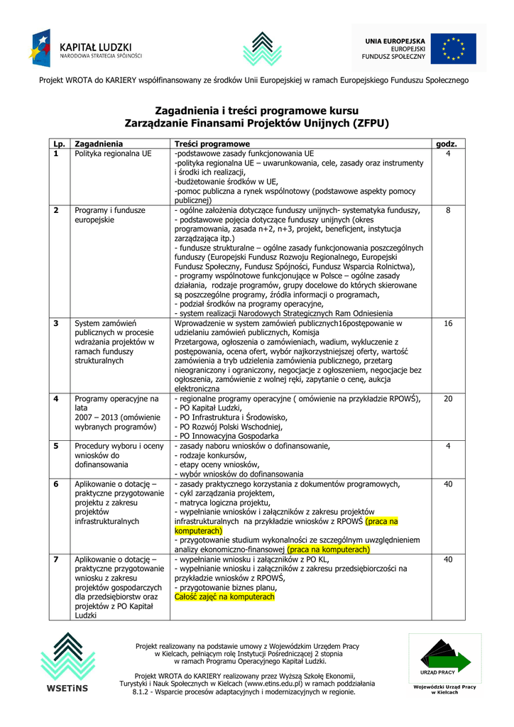 Projekt WROTA do KARIERY współfinansowany ze środków Unii Europejskiej w ramach Europejskiego Funduszu Społecznego Zagadnienia i treści programowe kursu Zarządzanie Finansami Projektów Unijnych (ZFPU) Lp. 1 Zagadnienia Polityka regionalna UE 2 Programy i fundusze europejskie 3 System zamówień publicznych w procesie wdrażania projektów w ramach funduszy strukturalnych 4 Programy operacyjne na lata 2007 – 2013 (omówienie wybranych programów) 5 Procedury wyboru i oceny wniosków do dofinansowania 6 Aplikowanie o dotację – praktyczne przygotowanie projektu z zakresu projektów infrastrukturalnych 7 Aplikowanie o dotację – praktyczne przygotowanie wniosku z zakresu projektów gospodarczych dla przedsiębiorstw oraz projektów z PO Kapitał Ludzki Treści programowe -podstawowe zasady funkcjonowania UE -polityka regionalna UE – uwarunkowania, cele, zasady oraz instrumenty i środki ich realizacji, -budżetowanie środków w UE, -pomoc publiczna a rynek wspólnotowy (podstawowe aspekty pomocy publicznej) - ogólne założenia dotyczące funduszy unijnych- systematyka funduszy, - podstawowe pojęcia dotyczące funduszy unijnych (okres programowania, zasada n+2, n+3, projekt, beneficjent, instytucja zarządzająca itp.) - fundusze strukturalne – ogólne zasady funkcjonowania poszczególnych funduszy (Europejski Fundusz Rozwoju Regionalnego, Europejski Fundusz Społeczny, Fundusz Spójności, Fundusz Wsparcia Rolnictwa), - programy wspólnotowe funkcjonujące w Polsce – ogólne zasady działania, rodzaje programów, grupy docelowe do których skierowane są poszczególne programy, źródła informacji o programach, - podział środków na programy operacyjne, - system realizacji Narodowych Strategicznych Ram Odniesienia Wprowadzenie w system zamówień publicznych16postępowanie w udzielaniu zamówień publicznych, Komisja Przetargowa, ogłoszenia o zamówieniach, wadium, wykluczenie z postępowania, ocena ofert, wybór najkorzystniejszej oferty, wartość zamówienia a tryb udzielenia zamówienia publicznego, przetarg nieograniczony i ograniczony, negocjacje z ogłoszeniem, negocjacje bez ogłoszenia, zamówienie z wolnej ręki, zapytanie o cenę, aukcja elektroniczna - regionalne programy operacyjne ( omówienie na przykładzie RPOWŚ), - PO Kapitał Ludzki, - PO Infrastruktura i Środowisko, - PO Rozwój Polski Wschodniej, - PO Innowacyjna Gospodarka - zasady naboru wniosków o dofinansowanie, - rodzaje konkursów, - etapy oceny wniosków, - wybór wniosków do dofinansowania - zasady praktycznego korzystania z dokumentów programowych, - cykl zarządzania projektem, - matryca logiczna projektu, - wypełnianie wniosków i załączników z zakresu projektów infrastrukturalnych na przykładzie wniosków z RPOWŚ (praca na komputerach) - przygotowanie studium wykonalności ze szczególnym uwzględnieniem analizy ekonomiczno-finansowej (praca na komputerach) - wypełnianie wniosku i załączników z PO KL, - wypełnianie wniosku i załączników z zakresu przedsiębiorczości na przykładzie wniosków z RPOWŚ, - przygotowanie biznes planu, Całość zajęć na komputerach Projekt realizowany na podstawie umowy z Wojewódzkim Urzędem Pracy w Kielcach, pełniącym rolę Instytucji Pośredniczącej 2 stopnia w ramach Programu Operacyjnego Kapitał Ludzki. WSETiNS Projekt WROTA do KARIERY realizowany przez Wyższą Szkołę Ekonomii, Turystyki i Nauk Społecznych w Kielcach (www.etins.edu.pl) w ramach poddziałania 8.1.2 - Wsparcie procesów adaptacyjnych i modernizacyjnych w regionie. godz. 4 8 16 20 4 40 40 Projekt WROTA do KARIERY współfinansowany ze środków Unii Europejskiej w ramach Europejskiego Funduszu Społecznego 8 Zasady finansowania i wspomagania projektów 9 Rozliczenie i monitoring projektu - udział własny podmiotów w projekcie, - pożyczki i kredyty preferencyjne, - prefinansowanie, fundusz poręczeń i inne instrumenty finansowe - partnerzy i podwykonawcy w projekcie, - obieg dokumentów, - zasady przekazywania i rozliczania środków unijnych przez Instytucje Zarządzające (pośredniczące), - sprawozdawczość i monitoring, - praktyczne ćwiczenia z zakresu wypełniania i oceny wniosków o płatność (praca na komputerach), Kielce, 13 sierpnia 2010 r. Projekt realizowany na podstawie umowy z Wojewódzkim Urzędem Pracy w Kielcach, pełniącym rolę Instytucji Pośredniczącej 2 stopnia w ramach Programu Operacyjnego Kapitał Ludzki. WSETiNS Projekt WROTA do KARIERY realizowany przez Wyższą Szkołę Ekonomii, Turystyki i Nauk Społecznych w Kielcach (www.etins.edu.pl) w ramach poddziałania 8.1.2 - Wsparcie procesów adaptacyjnych i modernizacyjnych w regionie. 8 40