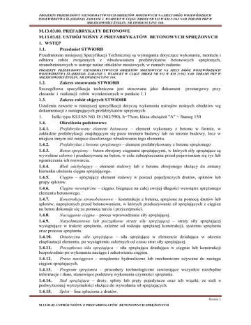 PROJEKTY PRZEBUDOWY NIENORMATYWNYCH OBIEKTÓW MOSTOWYCH NA SIECI DRÓG WOJEWÓDZKICH WOJEWÓDZTWA ŚLĄSKIEGO, ZADANIE 1. WIADUKT W CIĄGU DROGI NR 912 W KM 2+562 NAD TORAMI PKP W MIEJSCOWOŚCI ŻYGLIN, NR EWIDENCYJNY 160. M.13.03.00. PREFABRYKATY BETONOWE M.13.03.02. USTRÓJ NOŚNY Z PREFABRYKATÓW BETONOWYCH SPRĘŻONYCH 1. WSTĘP 1.1. Przedmiot STWiORB Przedmiotem niniejszej Specyfikacji Technicznej są wymagania dotyczące wykonania, montażu i odbioru robót związanych z wbudowaniem prefabrykatów betonowych sprężonych, strunobetonowych w ustroje nośne obiektów mostowych, w ramach zadania: PROJEKTY PRZEBUDOWY NIENORMATYWNYCH OBIEKTÓW MOSTOWYCH NA SIECI DRÓG WOJEWÓDZKICH WOJEWÓDZTWA ŚLĄSKIEGO, ZADANIE 1. WIADUKT W CIĄGU DROGI NR 912 W KM 2+562 NAD TORAMI PKP W MIEJSCOWOŚCI ŻYGLIN, NR EWIDENCYJNY 160. 1.2. Zakres stosowania STWiORB Szczegółowa specyfikacja techniczna jest stosowana jako dokument przetargowy przy zlecaniu i realizacji robót wymienionych w punkcie 1.1 1.3. Zakres robót objętych STWiORB Ustalenia zawarte w niniejszej specyfikacji dotyczą wykonania ustrojów nośnych obiektów wg dokumentacji z następujących prefabrykatów sprężonych: 1. belki typu KUJAN NG 18 (NG/590), h=75cm, klasa obciążeń "A" + Stanag 150 1.4. Określenia podstawowe 1.4.1. Prefabrykowany element betonowy – element wykonany z betonu w formie, w zakładzie prefabrykacji znajdującym się poza terenem budowy lub na terenie budowy, lecz w miejscu innym niż miejsce docelowego wbudowania tego elementu. 1.4.2. Prefabrykat z betonu sprężonego – element prefabrykowany z betonu sprężonego 1.4.3. Beton sprężony – beton zbrojony cięgnami sprężającymi, w których siły sprężające są wywołane celowo i przekazywane na beton, w celu zabezpieczenia przed pojawieniem się rys lub ograniczenia ich rozwarcia. 1.4.4. Blok odchylający – element stalowy lub z betonu zbrojonego służący do zmiany kierunku ułożenia cięgna sprężającego. 1.4.5. Cięgno – sprężający element stalowy w postaci pojedynczych drutów, splotów lub grupy splotów. 1.4.6. Cięgno wewnętrzne – cięgno, biegnące na całej swojej długości wewnątrz sprężonego elementu betonowego. 1.4.7. Konstrukcje strunobetonowe – konstrukcje z betonu, sprężone za pomocą drutów lub splotów, naprężonych przed betonowaniem, w których przekazywanie sił sprężających z cięgien na beton dokonuje się za pomocą tarcia i przyczepności. 1.4.8. Naciąganie cięgna – proces wprowadzania siły sprężającej. 1.4.9. Natychmiastowe lub początkowe straty siły sprężającej – straty siły sprężającej występujące w trakcie sprężania, zależne od rodzaju sprężanej konstrukcji, systemu sprężania oraz procesu sprężania. 1.4.10. Ostateczna siła sprężająca – siła sprężająca w elemencie działająca w okresie eksploatacji elementu, po wystąpieniu zależnych od czasu strat siły sprężającej. 1.4.11. Początkowa siła sprężająca – siła sprężająca działająca w cięgnie lub konstrukcji bezpośrednio po wykonaniu naciągu i zakotwieniu cięgien. 1.4.12. Prasa naciągowa – urządzenie hydrauliczne lub mechaniczne używane do naciągu cięgien sprężających. 1.4.13. Program sprężania – procedury technologiczne zawierające wszystkie niezbędne informacje i dane, stanowiące podstawę wykonania czynności sprężania. 1.4.14. Stal sprężająca – druty, sploty lub pręty pojedyncze oraz ich wiązki, ze stali o podwyższonej wytrzymałości służące do wywołania sił sprężających. 1.4.15. Splot – lina spleciona z drutów. Strona 1 M.13.03.02. USTRÓJ NOŚNY Z PREFABRYKATÓW BETONOWYCH SPRĘŻONYCH PROJEKTY PRZEBUDOWY NIENORMATYWNYCH OBIEKTÓW MOSTOWYCH NA SIECI DRÓG WOJEWÓDZKICH WOJEWÓDZTWA ŚLĄSKIEGO, ZADANIE 1. WIADUKT W CIĄGU DROGI NR 912 W KM 2+562 NAD TORAMI PKP W MIEJSCOWOŚCI ŻYGLIN, NR EWIDENCYJNY 160. 1.4.16. Tymczasowa siła sprężająca – siła w cięgnie lub konstrukcji występująca w czasie sprężania do momentu zakotwienia cięgna. 1.4.17. Zakotwienie bierne – zakotwienie umieszczone na tym końcu cięgna do którego nie przykłada się siły sprężającej przy użyciu prasy naciągowej. 1.4.18. Zakotwienie bierne pętlowe – zakotwienie bierne wykonane z zatopionych w betonie pętli cięgien (drutów, splotów). 1.4.19. Zakotwienie cięgna – urządzenie mechaniczne na końcu cięgna, służące do przenoszenia sił z cięgna na sprężany element. 1.4.20. Zakotwienie czynne – zakotwienie umieszczane na tym końcu cięgna, do którego przykłada się siłę sprężającą przy użyciu prasy naciągowej. 1.4.21. Zależne od czasu (reologiczne) straty siły sprężającej – opóźnione w czasie straty siły sprężającej powstające w wyniku takich zjawisk jak: pełzanie betonu, skurcz betonu oraz relaksacja stali sprężającej. 1.4.22. Pozostałe określenia podane w niniejszej specyfikacji są zgodne z obowiązującymi odpowiednimi normami oraz określeniami stosowanymi lub użytymi w STWiORB DM.00.00.00 „Wymagania ogólne” [1] pkt 1.4 oraz STWiORB M.13.01.00 1.5. Ogólne wymagania dotyczące robót. Ogólne wymagania dotyczące robót podano w STWiORB DM.00.00.00 „Wymagania ogólne” [1], pkt 1.5. Wykonawca robót jest odpowiedzialny za jakość ich wykonania oraz za zgodność z Dokumentacją Projektową, Specyfikacją Techniczną i poleceniami Inżyniera. Wykonywane roboty podlegają nadzorowi ze strony Inżyniera w zakresie stosowania właściwych materiałów i wyrobów, nie przekraczania dopuszczalnych odchyłek i tolerancji oraz przestrzegania szczegółowych wymagań technicznych podanych w niniejszej Specyfikacji. Przekazywanie wykonanych robót do użytku powinno być poprzedzone badaniami i odbiorem technicznym przy udziale Inżyniera. 2. MATERIAŁY 2.1 Ogólne wymagania dotyczące materiałów Ogólne wymagania dotyczące materiałów, ich pozyskiwania i składowania, podano w STWiORB DM.00.00.00
