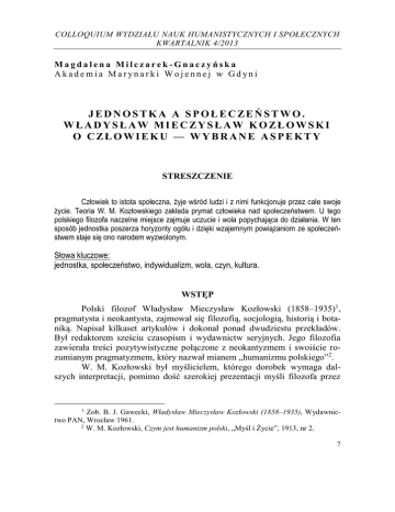 COLLOQUIUM WYDZIAŁU NAUK HUMANISTYCZNYCH I SPOŁECZNYCH KWARTALNIK 4/2013 Magdalena Milczarek-Gnaczyńska Akademia Marynarki Wojennej w Gdyni JEDNOSTKA A SPOŁECZEŃSTWO. WŁADYSŁAW MIECZYSŁAW KOZŁOWSKI O CZŁOWIEKU — WYBRANE ASPEKTY STRESZCZENIE Człowiek to istota społeczna, żyje wśród ludzi i z nimi funkcjonuje przez całe swoje życie. Teoria W. M. Kozłowskiego zakłada prymat człowieka nad społeczeństwem. U tego polskiego filozofa naczelne miejsce zajmuje uczucie i wola popychająca do działania. W ten sposób jednostka poszerza horyzonty ogółu i dzięki wzajemnym powiązaniom ze społeczeństwem staje się ono narodem wyzwolonym. Słowa kluczowe: jednostka, społeczeństwo, indywidualizm, wola, czyn, kultura. WSTĘP Polski filozof Władysław Mieczysław Kozłowski (1858–1935)1, pragmatysta i neokantysta, zajmował się filozofią, socjologią, historią i botaniką. Napisał kilkaset artykułów i dokonał ponad dwudziestu przekładów. Był redaktorem sześciu czasopism i wydawnictw seryjnych. Jego filozofia zawierała treści pozytywistyczne połączone z neokantyzmem i swoiście rozumianym pragmatyzmem, który nazwał mianem „humanizmu polskiego”2. W. M. Kozłowski był myślicielem, którego dorobek wymaga dalszych interpretacji, pomimo dość szerokiej prezentacji myśli filozofa przez Zob. B. J. Gawecki, Władysław Mieczysław Kozłowski (1858–1935), Wydawnictwo PAN, Wrocław 1961. 2 W. M. Kozłowski, Czym jest humanizm polski, „Myśl i Życie”, 1913, nr 2. 1 7 Magdalena Milczarek-Gnaczyńska Bolesława Andrzejewskiego3. Sam Kozłowski jawi się jako postać, która tak w swoim życiu, jak i na kartach dzieł, dążyła do połączenia teorii i praktyki, myśli i życia oraz nieodłącznej roli uczucia i czynu. Przemiany kulturowe dokonujące się na początku XXI wieku stanowią recepcję problematyki wieków poprzednich. Zagadnienia, którymi zajmują się myśliciele kultury, stanowią reinterpretację rzeczywistości. Czołowe pytania nurtujące nauki społeczne to pytania o egzystencję człowieka, jego los, kondycję. Od odpowiedzi na te pytania zależy pozycja jednostki w świecie i w społeczeństwie. Jednak, tak jak nieustannie zmienia się otaczający świat, zmienia się sama jednostka. Podlegają analizie pytania o jestestwo, bycie w świecie osoby, odmienne stają się także na nie odpowiedzi. Niezmienny pozostaje tylko fakt, iż człowiek to istota społeczna. Człowiek żyje w społeczeństwie, żyje wśród innych ludzi i z nimi obcuje. Wraz z intensywnością i częstotliwością kontaktów międzyludzkich człowiek w aspekcie psychicznym uświadamia sobie poczucie indywidualizmu. Z rozwojem samego siebie rejestruje zmianę w patrzeniu na świat i na innych ludzi. Kozłowski to myśliciel, który zajmował się zarówno jednostką, jak i społeczeństwem. Co jest główną powinnością człowieka? Jakie są główne obowiązki względem społeczności, w której żyje i z którą się utożsamia? Co powoduje, że jest ona istotna dla społeczeństwa i analogicznie — dana społeczność dla niej? Te pytania stanowią podwaliny refleksji polskiego myśliciela odnoszącego się do ludzkiego poznania i działania. Sądzi on, że są podstawą bycia człowieka w społeczeństwie. Poznanie, zdaniem Kozłowskiego, wynika z pragnienia wiedzy, sądy wartościowe dają ocenę, one zaś z kolei normy postępowania. Stąd istota ludzka wie, jak działać i funkcjonować, rozumiejąc, co się wokół niej dzieje. Autor Przyrodoznawstwa i filozofii pytał, czym jest pogląd na świat i dlaczego jest nam potrzebny. Wyjaśniając, stwierdził, że „wrodzone jest człowiekowi pragnienie wiedzieć o wszystkim, co go otacza, z czym w jakikolwiek sposób ma styczność”4, a nawet jeśli nie ma styczności — konstatował dalej — to wyobraża sobie i wierzy w rzeczy, które zdarzyć się powinny. „Tak 3 Profesor B. Andrzejewski jest autorem monografii Poglądy filozoficzne Władysława M. Kozłowskiego, WAM, Poznań 1979. Jej treścią jest recepcja i swoiste pojęcie pragmatyzmu w oparciu o kantyzm, który stanowił dla W. M. Kozłowskiego fundament teoriopoznawczy. B. Andrzejewski jest także redaktorem pracy zbiorowej Myśl i Życie. O humanizmie polskim Władysława M. Kozłowskiego, WAM, Poznań 1985, a także licznych publikacji przybliżających poglądy twórcy „humanizmu polskiego”. 4 W. M. Kozłowski, Czym jest pogląd na świat i na co potrzebny, „Pogląd na świat”, Kraków 1900, s. 145. 8 COLLOQUIUM WNHiS Jednostka a społeczeństwo. Władysław Mieczysław Kozłowski o człowieku — wybrane … wierzymy na przykład, że dobre powinno zwyciężyć złe i ta wiara wpływa również na postępowanie nasze”5. Myśliciel dokonując analizy procesu poznania, odwoływał się do poglądów J. Locke’a, do jego teorii postrzeżeń. Podkreślał, że angielski filozof mówił o percepcjach, rzeczach zmysłowych i refleksjach, które wytwarza nasz umysł6. Kozłowskiemu chodziło o to, żeby poznanie tworzyło całościowy obraz świata. Pisał: „Cały ten zakres poznania nazywamy światem; całość zaś wiadomości, sądów i wierzeń, dotyczących owego świata — a więc wszystkiego, co przystępne naszemu poznaniu — nazywamy poglądem na świat”7. Zdaniem Kozłowskiego pogląd na świat dotyczy wszystkich władz naszego umysłu: rozumu, uczucia i woli. Dzięki tym władzom jednostka ma szanse, aby wyjść ze zbiorowiska innych osób, stać się istotą autonomiczną, która na podstawie własnego rozumu i sądu samodzielnie podejmuje decyzje. Władze te poszukują następnie pojęć, aby precyzyjnie móc się wypowiedzieć, wtedy to człowiek „(…) zaczyna gorliwie pracować nad wyrobieniem sobie własnego poglądu na świat”8. Kozłowskiemu nie chodziło o to, aby człowiek naśladując innych, kształtował swój światopogląd. Jego zdaniem takie postępowanie nie jest rozumne, bowiem ktoś, kto taki