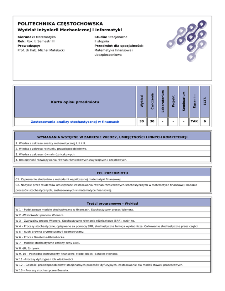 POLITECHNIKA CZĘSTOCHOWSKA Wydział Inżynierii Mechanicznej i Informatyki Kierunek: Matematyka Studia: Stacjonarne Rok: Rok II, Semestr III II stopnia Prowadzący: Przedmiot dla specjalności: Prof. dr hab. Michał Matałycki Matematyka finansowa i Karta opisu przedmiotu Wykład Ćwiczenia Laboratorium Projekt Seminarium Egzamin ECTS ubezpieczeniowa Zastosowania analizy stochastycznej w finansach 30 30 - - - TAK 6 WYMAGANIA WSTĘPNE W ZAKRESIE WIEDZY, UMIEJĘTNOŚCI I INNYCH KOMPETENCJI 1. Wiedza z zakresu analizy matematycznej I, II i III. 2. Wiedza z zakresu rachunku prawdopodobieństwa. 3. Wiedza z zakresu równań różniczkowych. 4. Umiejętność rozwiązywania równań różniczkowych zwyczajnych i cząstkowych. CEL PRZEDMIOTU C1. Zapoznanie studentów z metodami współczesnej matematyki finansowej. C2. Nabycie przez studentów umiejętności zastosowania równań różniczkowych stochastycznych w matematyce finansowej; badania procesów stochastycznych, zastosowanych w matematyce finansowej. Treści programowe - Wykład W 1 – Podstawowe modele stochastyczne w finansach. Stochastyczny proces Wienera. W 2 –Właściwości procesu Wienera. W 3 – Zwyczajny proces Wienera. Stochastyczne równania różniczkowe (SRR), wzór Ito. W 4 – Procesy stochastyczne, opisywane za pomocą SRR, stochastyczna funkcja wykładnicza. Całkowanie stochastyczne przez części. W 5 – Ruch Browna arytmetyczny i geometryczny. W 6 – Proces Ornsteina-Uhlenbecka. W 7 – Modele stochastyczne zmiany ceny akcji. W 8 –(B, S)-rynek. W 9, 10 – Pochodne instrumenty finansowe. Model Black –Scholes-Mertona. W 11 –Procesy dyfuzyjne i ich właściwości. W 12 – Gęstości prawdopodobieństw stacjonarnych procesów dyfuzyjnych, zastosowanie dla modeli stawek procentowych. W 13 – Procesy stochastyczne Bessela. W 14 –Właściwości procesów stochastycznych Coxa-Ingersolla-Rossa. W 15 – Analiza względna modeli stochastycznych nieliniowych dla stawek procentowych. Treści programowe - Ćwiczenia C 1,2 – Właściwości procesu Wienera. C 3,4 – Rozwiązanie równań różniczkowych stochastycznych w analizie finansowej. C 5,6,7 – Badania modeli stochastycznych dla stawek procentowych. C 8 – Modelowanie symulacyjne zmiennych losowych typu ciągłego. C 9 – Modelowanie symulacyjne procesu Wienera. C 10 – Badania modeli Wasiczeka dynamiki stawki procentowej. C 11 – Model Blacka-Karasińskiego dynamiki stawki procentowej. C 12– Model Coxa-Ingersolla-Rossa. C 13 – Model Longstaffa. C 14 – Model Ana-Gao. C 15 – Analiza względna modeli stawek procentowych. LITERATURA PODSTAWOWA I UZUPEŁNIAJĄCA 1. M.Matałycki, O. Tikhonenko Procesy stochastyczne. Akademicka Oficyna Wydawnicza EXIT, Warszawa, 2011 2. G. Medvedev. Diffusion models in financial analysis. BSU, Minsk, 2011 3. C. Gardiner. Handbook of stochastic methods. Springer-Verlag, Berlin, 1997 4. V. Solovjev. Modele stochastyczne matematyki finansowej, Moskwa, 2001