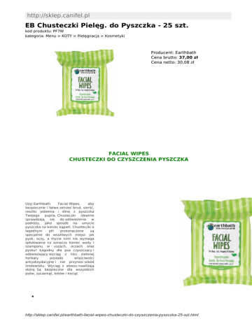 http://sklep.canifel.pl EB Chusteczki Pielęg. do Pyszczka - 25 szt. kod produktu: PF7W kategoria: Menu > KOTY > Pielęgnacja > Kosmetyki Producent: Earthbath Cena brutto: 37,00 zł Cena netto: 30,08 zł FACIAL WIPES CHUSTECZKI DO CZYSZCZENIA PYSZCZKA Użyj Earthbath Facial Wipes, aby bezpiecznie i łatwo zetrzeć brud, sierść, resztki jedzenia i ślinę z pyszczka Twojego pupila. Chusteczki idealnie sprawdzają się do odświeżenia w podróży, jako sposób na umycie pyszczka na koniec kąpieli. Chusteczki o łagodnym pH przeznaczone są specjalnie do wrażliwych miejsc jak pysk, oczy, a mycie nimi nie wymaga spłukiwania co oznacza koniec wody i szamponu w uszach, oczach oraz pysku! Łagodny dla psa czyszczący i odświeżający wyciąg z liści zielonej herbaty posiada wlaściwości antyoksydacyjne i nie przynosi szkód środowisku. Wyciąg z aloesu nawilżają skórę. Są bezpieczne dla wszystkich psów, szczeniąt, kotów i kociąt. http://sklep.canifel.pl/earthbath-facial-wipes-chusteczki-do-czyszczenia-pyszczka-25-szt.html Składniki którymi są nasączone doskonałe usuwają wszelkie zabrudzenia z pyska pupila Eliminują nieprzyjemne zapachy Środki działające zmiękczająco zawarte w chusteczkach pozostawiają sierść czystą i lśniącą Wyciąg z aloesu nawilża skórę W przypadku przedostania się do dróg pokarmowych składniki zawarte w chusteczkach nie wywołają podrażnienia żołądka i jelit Nie zawierają alkoholu Wyrównują poziom pH Opakowanie zawiera 28 chusteczek Produkty EarthBath nie zawierają niczego co mogłoby zaszkodzić zwierzęciu i środowisku. Produkt nie zawiera: parabenów, fosforanów, DEA, sztucznych barwników lub zapachów. Zalety: produkt na bazie naturalnych składników ulega biodegradacji wyrównuje poziom pH Zastosowanie chusteczek EarthBath: W celu usunięcia zanieczyszczeń Dla zwierząt nieznoszących kąpieli Niezastąpione w czasie podróży, zabaw na dworze i spacerów Do czyszczenia uszu i pyszczka Do szybkiego odświeżenia zwierząt przed przybyciem gości Regulują wydzielanie nieprzyjemnych zapachów Instrukcja użycia: Odkleić specjalne zamknięcie znajdujące się na opakowaniu Wyjąć chusteczkę Wytrzeć pysk zwierzęcia Zakleić dokładnie zamknięcie http://sklep.canifel.pl/earthbath-facial-wipes-chusteczki-do-czyszczenia-pyszczka-25-szt.html Zużytą chusteczkę wyrzucić do kosza na śmieci, nie wrzucać do toalety http://sklep.canifel.pl/earthbath-facial-wipes-chusteczki-do-czyszczenia-pyszczka-25-szt.html