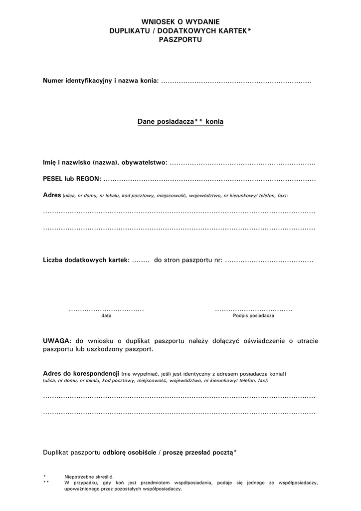 WNIOSEK O WYDANIE DUPLIKATU / DODATKOWYCH KARTEK* PASZPORTU Numer identyfikacyjny i nazwa konia: ………………………………………………………….. Dane posiadacza** konia Imię i nazwisko (nazwa), obywatelstwo: ………………………………………………………… PESEL lub REGON: …………………………………………………………………….…………….. Adres (ulica, nr domu, nr lokalu, kod pocztowy, miejscowość, województwo, nr kierunkowy/ telefon, fax): …………………………………………………………………………………………………………… …………………………………………………………………………………………………………… Liczba dodatkowych kartek: …..… do stron paszportu nr: …………………………….…… ……………………………. ………..…………………… data Podpis posiadacza UWAGA: do wniosku o duplikat paszportu należy dołączyć oświadczenie o utracie paszportu lub uszkodzony paszport. Adres do korespondencji (nie wypełniać, jeśli jest identyczny z adresem posiadacza konia!) (ulica, nr domu, nr lokalu, kod pocztowy, miejscowość, województwo, nr kierunkowy/ telefon, fax): …………………………………………………………………………………………………………… …………………………………………………………………………………………………………… Duplikat paszportu odbiorę osobiście / proszę przesłać pocztą* * ** Niepotrzebne skreślić. W przypadku, gdy koń jest przedmiotem współposiadania, podaje się jednego ze współposiadaczy, upoważnionego przez pozostałych współposiadaczy.