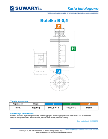 Butelka B-0,5 Tabela wymiarów: Pojemność: Waga: S H Z 0,5 L 47g/55g Ø77,6 +/- 1 160,6 +/-2 Ø38M Informacje dodatkowe: Butelka posiada wymienną wstawkę pozwalającą na produkcję opakowań bez znaku lub ze znakiem dotyku. Na opakowaniu umieszczona jest na stałe skala poziomu cieczy. Data modyfikacji: 22.10.2013 Data modyfikacji: 2013-10-24 07:37:00 A10/P10
