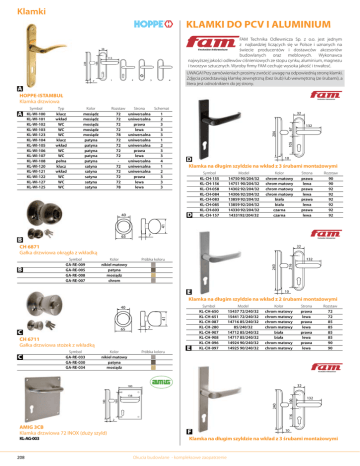 Klamki KLAMKI DO PCV I ALUMINIUM FAM Technika Odlewnicza Sp. z o.o. jest jednym z najbardziej liczących się w Polsce i uznanych na świecie producentów i dostawców akcesoriów budowlanych oraz meblowych. Wykonawca najwyższej jakości odlewów ciśnieniowych ze stopu cynku, aluminium, magnezu i tworzyw sztucznych. Wyroby firmy FAM cechuje wysoka jakość i trwałosć. 38 228 194 113 2 1 7 3 4 A UWAGA! Przy zamówieniach prosimy zwrócić uwagę na odpowiednią stronę klamki. Zdjęcia przedstawiają klamkę zewnętrzną (bez śrub) lub wewnętrzną (ze śrubami), a litera jest odnośnikiem do jej strony. HOPPE-ISTAMBUŁ Klamka drzwiowa Kolor mosiądz mosiądz mosiądz mosiądz mosiądz patyna patyna patyna patyna patyna satyna satyna satyna satyna satyna Rozstaw 72 72 72 72 78 72 72 72 72 72 72 72 72 78 Strona Schemat uniwersalna 1 uniwersalna 2 prawa 3 lewa 3 uniwersalna 3 uniwersalna 1 uniwersalna 2 prawa 3 lewa 3 uniwersalna 4 uniwersalna 1 uniwersalna 2 prawa 3 lewa 3 lewa 3 32 D 10 Klamka na długim szyldzie na wkład z 3 śrubami montażowymi D Symbol KL-CH-155 KL-CH-156 KL-CH-058 KL-CH-084 KL-CH-083 KL-CH-085 KL-CH-603 KL-CH-157 Model 14750 90/204/32 14751 90/204/32 14302 92/204/32 14306 92/204/32 13859 92/204/32 13859 92/204/32 14330 92/204/32 1433192/204/32 Kolor chrom matowy chrom matowy chrom matowy chrom matowy biała biała czarna czarna Strona prawa lewa prawa lewa prawa lewa prawa lewa Rozstaw 90 90 92 92 92 92 92 92 41 40 132 67 Typ klucz wkład WC WC WC klucz wkład WC WC pełna klucz wkład WC WC WC 105 Symbol KL-WI-100 KL-WI-101 KL-WI-102 KL-WI-103 KL-WI-123 KL-WI-104 KL-WI-105 KL-WI-106 KL-WI-107 KL-WI-108 KL-WI-120 KL-WI-121 KL-WI-122 KL-WI-127 KL-WI-125 204 A 7 65 B CH 6871 Gałka drzwiowa okrągła z wkładką 132 Próbka koloru E 216 Kolor nikiel matowy patyna mosiądz chrom 240 B Symbol GA-RE-009 GA-RE-005 GA-RE-008 GA-RE-007 32 10 Klamka na długim szyldzie na wkład z 2 śrubami montażowymi 41 40 7 65 C CH 6711 Gałka drzwiowa stożek z wkładką C Symbol GA-RE-033 GA-RE-030 GA-RE-034 Kolor nikiel matowy patyna mosiądz Próbka koloru E Symbol KL-CH-650 KL-CH-651 KL-CH-087 KL-CH-280 KL-CH-907 KL-CH-908 KL-CH-096 KL-CH-097 Model 15437 72/240/32 15441 72/240/32 14716 85/240/32 85/240/32 14712 85/240/32 14717 85/240/32 14924 90/240/32 14925 90/240/32 Kolor chrom matowy chrom matowy chrom matowy chrom matowy biała biała chrom matowy chrom matowy 2 208 100 132 116 240 180 160 138 KL-AG-003 Rozstaw 72 72 85 85 85 85 90 90 32 180 AMIG 3CB Klamka drzwiowa 72 INOX (duży szyld) Strona prawa lewa prawa lewa prawa lewa prawa lewa F 10 Klamka na długim szyldzie na wkład z 3 śrubami montażowymi Okucia budowlane - kompleksowe zaopatrzenie Klamki Rozstaw 72 72 90 90 92 92 92 92 92 92 92 92 92 92 32 132 50 Strona prawa lewa prawa lewa prawa lewa prawa lewa prawa lewa prawa lewa prawa lewa 100 Kolor stal nierdzewna stal nierdzewna stal nierdzewna stal nierdzewna stal nierdzewna stal nierdzewna chrom matowy chrom matowy biała biała brąz brąz brąz czekoladowy brąz czekoladowy 116 Model 16668 72/240/32 16669 72/240/32 15802 90/240/32 15803 90/240/32 15802 92/240/32 15803 92/240/32 14159 92/240/32 14163 92/240/32 13904/14829 92/240/32 13906/14831 92/240/32 13971 92/240/32 13972 92/240/32 14111 92/240/32 14114 92/240/32 240 F Symbol KL-CH-657 KL-CH-658 KL-CH-655 KL-CH-656 KL-CH-659 KL-CH-660 KL-CH-164 KL-CH-165 KL-CH-162 KL-CH-163 KL-CH-161 KL-CH-160 KL-CH-021 KL-CH-020 I 10 Klamka z pochwytem na długim szyldzie na wkład z 3 śrubami montażowymi Symbol KL-CH-123 KL-CH-240 KL-CH-111 KL-CH-110 KL-CH-222 KL-CH-223 I Model 14505 72/240/32 14503 72/240/32 14333 92/240/32 14334 92/240/32 13973 92/240/32 13974 92/240/32 Kolor chrom matowy chrom matowy chrom matowy chrom matowy brąz brąz Strona lewa prawa prawa lewa prawa lewa Rozstaw 72 72 92 92 92 92 32 204 67 132 10 Kolor chrom matowy chrom matowy chrom matowy chrom matowy chrom matowy chrom matowy brąz brąz Strona prawa lewa prawa lewa prawa lewa prawa lewa Rozstaw 72 72 90 90 92 92 92 92 J 10 Pochwyt na długim szyldzie na wkład, uniwersalna J Symbol KL-CH-188 KL-CH-190 KL-CH-195 Model Kolor 02009 72/240/32 chrom matowy 02004 90/240/32 chrom matowy 02005 92/204/32 chrom matowy A 240 240 204 Rozstaw 72 90 92 Ilość śrub 3 2 3 55,5 37 G Model 14145 72/204/32 14151 72/204/32 14147 90/204/32 14153 90/204/32 14149 92/204/32 14155 92/204/32 92/204/32 13976 92/204/32 116 Klamka z pochwytem na długim szyldzie na wkład z 3 śrubami montażowymi Symbol KL-CH-100 KL-CH-105 KL-CH-121 KL-CH-122 KL-CH-103 KL-CH-102 KL-CH-208 KL-CH-107 50 A G 100 105 50 32 10 K Tarczka prostokątna na wkład (odpowiednia do wszystkich klamek FAM) Symbol TA-CH-102 TA-CH-100 TA-CH-101 TA-CH-099 TA-CH-106 32 K 50 216 240 132 H INFORMACJA 10 H Model 15445 72/240/32 15447 72/240/32 14724 85/240/32 14727 85/240/32 14791 85/240/32 14793 85/240/32 14723 85/240/32 14726 85/240/32 15119 90/240/32 15120 90/240/32 15268 92/240/32 15271 92/240/32 Kolor chrom matowy chrom matowy chrom matowy chrom matowy brąz brąz czarna czarna chrom matowy chrom matowy biała biała Strona prawa lewa prawa lewa prawa lewa prawa lewa prawa lewa prawa lewa Próbka koloru STRONA KLAMEK DRZWI LEWE Klamka z pochwytem na długim szyldzie na wkład z 2 śrubami montażowymi Symbol KL-CH-152 KL-CH-151 KL-CH-109 KL-CH-108 KL-CH-124 KL-CH-142 KL-CH-176 KL-CH-175 KL-CH-180 KL-CH-181 KL-CH-220 KL-CH-221 Kolor chrom matowy biała brąz czarna stal nierdzewna Rozstaw 72 72 85 85 85 85 85 85 90 90 92 92 KLAMKA LEWA DRZWI PRAWE KLAMKA PRAWA Większość klamek do drzwi wewnętrznych jest uniwersalna. Stronę klamek należy określić dla: klamek do drzwi zewnętrznych, klamko-pochwytów, niektórych klamek z długim szyldem do WC. www.sparta.com.pl 209 Klamki 32 30 D 8 A A Kolor biała brązowa srebro złoto stare złoto 60 99 10 SATURN Pochwyt-klamka na długim szyldzie na wkład HOPPE LONDON Klamka na długim szyldzie na wkład, rozstaw 92; 113P/2246 Symbol KL-WI-305 KL-WI-306 KL