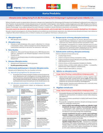 Karta Produktu Ubezpieczenia Spłaty Karty PLUS dla Posiadaczy Kart Kredytowych wydawanych przez mBanku S.A. W Karcie Produktu zawarte są najważniejsze informacje o ubezpieczeniu Spłaty Karty Plus oferowanego dla Posiadaczy kart kredytowych wydawanych przez mBankS.A. Karta Produktu nie jest elementem Umowy Ubezpieczenia ani materiałem marketingowym. Karta Produktu została przygotowana przez BRE Ubezpieczenia TUiR S.A. we współpracy z mBank S.A. na podstawie Rekomendacji U z dnia 24 czerwca 2014 r dotyczącej dobrych praktyk w zakresie bancassurance wydanej przez Komisję Nadzoru Finansowego i ma za zadanie pokazać kluczowe informacje o produkcie i pomóc klientowi w zrozumieniu cech produktu. Przeczytaj uważnie ten dokument, abyś wiedział jakie są cechy produktu, jakie korzyści daje Ci to ubezpieczenie oraz jakie obowiązki są z nim związane. Decyzję o zawarciu/przystąpieniu do Umowy Ubezpieczenia podejmij po wcześniejszym zapoznaniu się z dokumentacją ubezpieczeniową, w tym zwłaszcza z Ogólnymi Warunkami Ubezpieczenia, w których znajdują się szczegółowe informacje o ubezpieczeniu. 1. Ubezpieczyciel: • 6. Rozpoczęcie ochrony ubezpieczeniowej: BRE Ubezpieczenia TUiR S.A. • W przypadku przystąpienia do Umowy Ubezpieczenia w dniu zawarcia Umowy o korzystanie z karty ochrona ubezpieczeniowa rozpoczyna się z dniem zawarcia Umowy o korzystanie z karty. • W przypadku przystąpienia do Umowy Ubezpieczenia po dniu zawarcia Umowy o korzystanie z karty, ochrona ubezpieczeniowa rozpoczyna się z pierwszym dniem następującym po dniu złożenia oświadczenia woli o przystąpieniu do Umowy Ubezpieczenia. 2. Ubezpieczony: • Posiadacza Karty kredytowej, który zawarł z mBankiem S.A. Umowę o korzystanie z karty, a także przystąpił do Umowy Ubezpieczenia i jednocześnie ukończył 18. roku życia i nie ukończył 70. roku życia. 3. Rola Banku: • • mBank S.A., który zawarł Umowę Ubezpieczenia z BRE Ubezpieczenia TUiR S.A. i występuje w roli Ubezpieczającego w ramach tej Umowy Ubezpieczenia. 7. Zakończenie ochrony ubezpieczeniowej: Ochrona ubezpieczeniowa kończy się: • z chwilą Twojej śmierci, • z dniem rozwiązania Umowy o korzystanie z karty, • z dniem rozwiązania Umowy Ubezpieczenia pomiędzy mBankiem S.A. a BRE Ubezpieczenia TUiR S.A., Ubezpieczenie oferowane w formie grupowej. • z końcem okresu za który przypadała niezapłacona składka, Nr polisy generalnej 9000085. • z końcem okresu, za który została zapłacona składka – w przypadku, złożenia przez Ciebie rezygnacji z ubezpieczenia, • z dniem w którym ukończyłeś 70. rok życia. mBankS.A. jako Ubezpieczający nie pobiera wynagrodzenia od Zakładu Ubezpieczeń. 4. Umowa Ubezpieczenia: • • 5. Informacje podstawowe o Umowie Ubezpieczenia: Ubezpieczenie Spłaty Karty Plus ma charakter ochronny. a) Warunki przystąpienia do ubezpieczenia: • Doubezpieczeniamożeszprzystąpićwkażdymmomenciepoprzezzłożenie oświadczenie woli o przystąpieniu do Umowy Ubezpieczenia wformiepisemnej,ustnejprzeztelefonlubwformieelektronicznej,oile Bankudostępnitakafunkcjonalność.Dodatkowo,abyprzystąpićdoUmowyUbezpieczeniamusiszmiećukończone18.latinieukończone70.lat. b) Cel ubezpieczenia/zakres i suma ubezpieczenia: • Zakresem ubezpieczenia objęte są następujące zdarzenia ubezpieczeniowe Śmierć w wyniku nieszczęśliwego wypadku Całkowita i trwała niezdolność do pracy w wyniku nieszczęśliwego wypadku Czasowa niezdolność do pracy spowodowana pobytem w szpitalu w wyniku nieszczęśliwego wypadku UWAGA! Za nieszczęśliwy wypadek nie uznaje się zawału serca, udaru mózgu i innych chorób, nawet występujących nagle. Przez Całkowitą i Trwałą Niezdolność do Pracy w Wyniku Nieszczęśliego Wypadek rozumie się: całkowita i trwała niezdolność do świadczenia jakiejkolwiek pracy na podstawie stosunku pracy, umowy cywilnoprawnej, wykonywania wolnego zawodu lub do prowadzenia działalności gospodarczej, potwierdzona wydaniem orzeczenia przez lekarza orzecznika ZUS określającego stan zdrowia Ubezpieczonego jako trwała i całkowita niezdolność do pracy. Przez Czasową Niezdolność do Pracy Spowodowaną Pobytem w Szpitalu w Wyniku Nieszczęśliwego Wypadku rozumie się: Niezdolność do pracy Ubezpieczonego spowodowana pobytem w szpitalu w wyniku nieszczęśliwego wypadku, potwierdzona dokumentacją leczenia szpitalnego, trwającego nieprzerwanie co najmniej 14 dni. SUMA UBEZPIECZENIA: Saldo zadłużenia pozostające do spłaty w dniu zajścia zdarzenia ubezpieczeniowego, nie więcej niż 105% przyznanego limitu kredytowego. SUMA UBEZPIECZENIA: Saldo zadłużenia pozostające do spłaty w dniu zajścia zdarzenia ubezpieczeniowego, nie więcej niż 105% przyznanego limitu kredytowego. SUMA UBEZPIECZENIA: 12 minimalnych kwot spłaty należnych z tytułu Umowy o korzystanie z karty w okresie ubezpieczenia, po dni zajścia zdarzenia, nie więcej niż 60% przyznanego limitu kredytowego Jeżeli nastąpiła w okresie 180 dni kalendarzowych od daty nieszczęśliwego wypadku Przez Nieszczęśliwy Wypadek rozumie się: nagłe zdarzenie spowodowane przyczyna zewnętrzna, niezalene od woli Ubezpieczonego. 8. Opłata za ubezpieczenie: Uwaga. Ważne! Prosimy o uważną lekturę niniejszego punktu. • Opłata tytułem ubezpieczenia jest płatna co miesiąc i zgodnie z obowiązującą taryfą opłat i prowizji banku wynosi 0,35% od kwoty salda zadłużenia na ostatni dzień danego cyklu rozliczeniowego. Do salda zadłużenia nie są wliczane transakcje niezaksięgowane. • Opłata tytułem ubezpieczenia pobierana jest z rachunku karty w dniu wygenerowania wyciągu. 9. Wypłata świadczeń: Uwaga. Ważne! Prosimy o uważną lekturę niniejszego punktu. • W przypadku Ubezpieczenia Spłaty Karty Plus, uprawnionym do odbioru świadczenia, pod warunkiem, że zostanie on przez Ciebie wskazany, jest mBank S.A. • Masz prawo do zmiany uposażonych w każdej chwili trwania 
