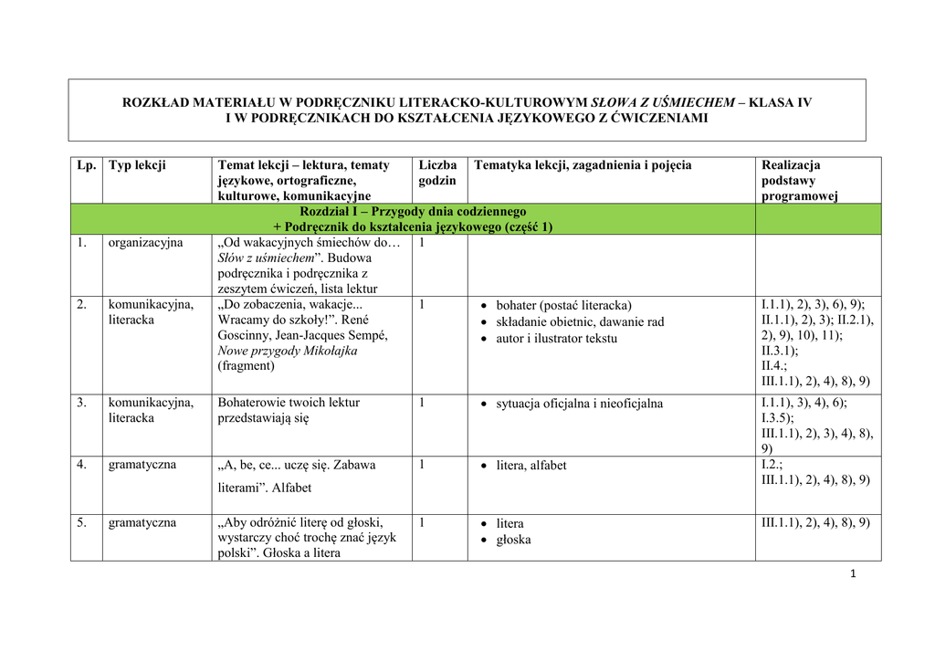 ROZKŁAD MATERIAŁU W PODRĘCZNIKU LITERACKO-KULTUROWYM SŁOWA Z UŚMIECHEM – KLASA IV I W PODRĘCZNIKACH DO KSZTAŁCENIA JĘZYKOWEGO Z ĆWICZENIAMI Lp. Typ lekcji Temat lekcji – lektura, tematy Liczba Tematyka lekcji, zagadnienia i pojęcia językowe, ortograficzne, godzin kulturowe, komunikacyjne Rozdział I – Przygody dnia codziennego + Podręcznik do kształcenia językowego (część 1) „Od wakacyjnych śmiechów do… 1 Słów z uśmiechem”. Budowa podręcznika i podręcznika z zeszytem ćwiczeń, lista lektur „Do zobaczenia, wakacje... 1 bohater (postać literacka) Wracamy do szkoły!”. René składanie obietnic, dawanie rad Goscinny, Jean-Jacques Sempé, autor i ilustrator tekstu Nowe przygody Mikołajka (fragment) 1. organizacyjna 2. komunikacyjna, literacka 3. komunikacyjna, literacka Bohaterowie twoich lektur przedstawiają się 1 sytuacja oficjalna i nieoficjalna 4. gramatyczna „A, be, ce... uczę się. Zabawa 1 litera, alfabet 1 litera głoska literami”. Alfabet 5. gramatyczna „Aby odróżnić literę od głoski, wystarczy choć trochę znać język polski”. Głoska a litera Realizacja podstawy programowej I.1.1), 2), 3), 6), 9); II.1.1), 2), 3); II.2.1), 2), 9), 10), 11); II.3.1); II.4.; III.1.1), 2), 4), 8), 9) I.1.1), 3), 4), 6); I.3.5); III.1.1), 2), 3), 4), 8), 9) I.2.; III.1.1), 2), 4), 8), 9) III.1.1), 2), 4), 8), 9) 1 6. gramatyczna 7. literacka 8. ortograficzna 9. stylistyczna, literacka 10. gramatyczna 11. gramatyczna 12. powtórzeniowa 13. powtórzeniowa 14. literacka 15. ortograficzna „Nasze fonetyczne troski…”. Samogłoski i spółgłoski „Co się może zdarzyć, gdy głowa pełna marzeń?”. Joanna Kulmowa, Marzenia 1 różnice między samogłoską i spółgłoską III.1.1), 2), 4), 8), 9) 1 odczytywanie znaczeń ukrytych ćwiczenia kreatywnego myślenia trening wyobraźni I.1.1), 2), 3), 7), 8), 9) „Pierwsza pomoc w szkolnych wypadkach”. Słownik ortograficzny „Dzieci listy piszą... zabawne potyczki z epistolografią”. List – rady dla piszących Grzegorz Kasdepke, List (fragment) „I kłopoty sprawić może, lecz ćwiczenie ci pomoże”. O różnych funkcjach głoski i „Pa – lu –szek i głów – ka to szkol – na wy – mów – ka”. O sylabach To już znamy, powtarzamy: litery i głoski Pół żartem, pół serio – gra powtórzeniowa Wiem, umiem, rozumiem – sprawdzian dotyczący liter i głosek „Awantury i wybryki”. Joanna Olech, Gdzie diabeł mówi... do usług (fragment) 1 budowa słownika zasady ortograficzne II.1.1), II.2.1), 2), 11) 1 list tradycyjny i e-mail II.3.1); II.4. 1 znak samogłoski oznaczanie miękkości III.1.1), 2), 4), 8), 9), 10) 1 sylaby I.2. 1 alfabet, litery, głoski, sylaby III.1.1), 2), 4), 8), 9) 1 alfabet, litery, głoski, sylaby 1 opis dialog I.1.1), 2), 3), 5), 6), 7), 10) II.1.1), 2), 3); II.2.1), 2), 9), 10), 11); II.3.1); II.4. III.1.1), 2), 4), 5), 6), „Igrzyska ortograficzne”. Pisownia 1 2 16. gramatyczna, ortograficzna 17. gramatyczna 18. literacka 19. stylistyczna, literacka 20. ortograficzna 21. literacka 22. gramatyczna, ortograficzna 23. kulturowa, literacka 24. gramatyczna, ortograficzna wyrazów z rz „Co by tu jeszcze zrobić, koledzy, co by tu zrobić?”. Czasownik i jego znaczenia „O ekscentrykach przy okazji bezokolicznika”. Formy osobowe i nieosobowe czasownika „Kłopotliwa wizyta z myszą w tle”. Małgorzata Musierowicz, Szósta klepka (fragment) Napisać plan ramowy? Z Pippi to frajda nie z tej ziemi! Plan ramowy – rady dla piszących Astrid Lindgren, Pippi Pończoszanka (fragment) „Dobry żart tynfa wart”. Pisownia wyrazów z ż Kto ma pilota, ten ma władzę. Maciej Wojtyszko, Bolek i Lolek. Straszne skutki oglądania telewizji (fragment) – rady dla czytających „Tańczę, śpiewam i maluję, czyli jak się relaksuję”. Czas teraźniejszy czasowników „Nie dajmy się zaczarować telewizorom”. Stanisław Grochowiak, Telewizor „Wehikułem czasu w…”. Czas przeszły czasowników 8), 9) I.2. 1 znaczenie odmiana przez osoby, liczby 1 bezokolicznik i formy osobowe III.1.1), 2), 4), 8), 9) 1 zdarzenia, plan zdarzeń I.2. 1 plan wydarzeń (ramowy) III.1.1), 2), 4), 8), 9) 1 I.2. 1 prośba poprawne czytanie III.1.1), 2), 4), 8), 9) 1 czas teraźniejszy zakończenia I.2. 1 III.1.1), 2), 4), 8), 9) 1 program telewizyjny korzystanie ze źródeł informacji ankieta czas przeszły formy rodzajowe czasownika pisownia nie z czasownikami I.1.1), 2), 3), 4), 6), 7), 9) 3 25. literacka „Tajemnica goni tajemnicę”. Liliana Bardijewska, Dom ośmiu tajemnic (fragment) 1 narrator, narracja 26. gramatyczna 1 czas przyszły – różne formy 27. stylistyczna, literacka 1 świat przedstawiony i fikcja literacka I.2. 28. literacka 1 komiks III.1.1), 2), 4), 5), 6), 8), 9) 29. stylistyczna, komunikacyjna 1 opowiadanie jako forma wypowiedzi zasady barwnego opowiadania I.3.3), 4) 30. ortograficzna 31. literacka 32. lekcja dodatkowa 33. lekcja dodatkowa „Czy wróżka prawdę ci powie?”. Czas przyszły czasowników „Zobaczyć ducha”. Anna Onichimowska, Duch starej kamienicy (fragment) „Narysowany świat Papcia Chmiela”. Henryk Jerzy Chmielewski, Tytus, Romek i A’Tomek (fragment) „Przygody są po to, by o nich opowiadać”. Opowiadanie odtwórcze – rady dla piszących „Przyjemnie i pożytecznie, czyli jak mądrze i ciekawie spędzać wolny czas”. Pisownia wyrazów z rz i ż René Goscinny, Jean-Jacques Sempé*, Mikołajek (lektura czytana w całości) A może to cię zainteresuje? „Od pierwszego wejrzenia…”. Ida Pierelotkin, Ala Betka (fragment) Wszyscy to czytali „Mistrzowie szkolnej ortografii”. Hanna Ożogowska, Tajemnica zielonej pieczęci (fragment) II.1. 1), 2), 3); II.2.1), 2), 3), 9), 10), 11); II.3.1); II.4. III.1.1), 2), 4), 8), 9) 1 5 1 1 III.1.1), 2), 4), 5), 6), 8), 9) świat przestawiony podstawowe pojęcia z zakresu epiki – powtórzenie świat przedstawiony, podstawowe pojęcia z zakresu epiki 