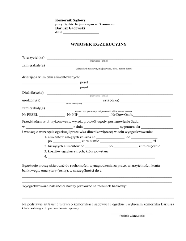 Komornik Sądowy przy Sądzie Rejonowym w Sosnowcu Dariusz Gadowski dnia ___________________ WNIOSEK EGZEKUCYJNY Wierzyciel(ka) ___________________________________________________________________ (nazwisko i imię) zamieszkały(a) ___________________________________________________________________ (adres: kod pocztowy, miejscowość, ulica, numer domu) działająca w imieniu alimentowanych: ______________________________ pesel _______________________ ______________________________ pesel _______________________ Dłużnik(czka) ___________________________________________________________________ (nazwisko i imię) urodzony(a) ______________________________ syn(córka) ____________________________ (data i miejsce) zamieszkały(a) ____________________________________________________________________ (adres: kod pocztowy, miejscowość, ulica, numer domu) Nr PESEL ______________ Nr NIP ________________ , Nr Dow.Osob.____________________ Przedkładam tytuł wykonawczy: wyrok, protokół ugody, postanowienie Sądu w _________________________ z dnia ___________________ sygnatura akt _________________ i wnoszę o wszczęcie egzekucji przeciwko dłużnikowi(czce) w celu wyegzekwowania: 1. alimentów zaległych za czas od _______________. do ______________ po _______________ zł, w sumie ____________________________ zł 2. bieżących alimentów od ____________ po _____________ zł miesięcznie 3. kosztów egzekucyjnych, które powstaną 4. _________________________________________________________ Egzekucję proszę skierować do ruchomości, wynagrodzenia za pracę, wierzytelności, konta bankowego, emerytury (renty), w szczególności do :. ________________________________________________________________________________ ________________________________________________________________________________ Wyegzekwowane należności należy przekazać na rachunek bankowy: _________________________________________________________________________________ Na podstawie art.8 ust.5 ustawy o komornikach sądowych i egzekucji wybieram komornika Dariusza Gadowskiego do prowadzenia sprawy. ______________________ (podpis wierzyciela)