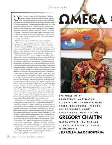 Matematyka ,c O kolice Yorktown Heights to kraina paradoksów. Oddalona o zaledwie godzinę jazdy pociągiem od piekielnego Manhattanu, przywodzi na myśl norweskie fiordy. Tu inżynierskimi umiejętnościami błysnął Tadeusz Kościuszko, fortyfikując obozy wojskowe Armii Kontynentalnej i zakładając legendarną twierdzę West Point, by potem w jej zaciszu oddać się... hodowli kwiatów. Wysokie brzegi szerokiej na setki metrów rzeki Hudson są obsypane białymi domkami, skupionymi tu i ówdzie w idylliczne miasteczka. Ale niech nie zwiodą was pozory. – Przedmieścia to więzienie – piękne, ale więzienie, zwierzę skazane na zagładę. Bez samochodu nie istniejesz – mówi Gregory Chaitin. – Może kiedy ta cywilizacja zniknie, uda się zacząć od nowa – i wszystko urządzić lepiej. Kilkadziesiąt lat temu, w czasach zimnej wojny, kiedy Chaitin (ur. 1947 r.) rozpoczął pracę w położonym na jednym z okolicznych wzgórz Thomas J. Watson Research Center, etat w tym najważniejszym z ośrodków naukowych IBM był marzeniem wielu matematyków i pionierów nowej dziedziny wiedzy – informatyki. To tutaj w bezpiecznej odległości od miasta (poza polem rażenia ewentualnego ataku jądrowego na Nowy Jork) obmyślano nowatorskie teorie i konstrukcje komputerów. Chaitin trafił tu w 1975 r. owiany sławą genialnego dziecka. Jako kilkunastolatek (niemal równolegle do rosyjskiego matematyka Andrieja Kołmogorowa) opracował i rozwinął algorytmiczną teorię informacji, która ujmuje w ramy ilościowe pojęcia prostoty i złożoności, używając idei komputera do badania granic i struktury ludzkiej wiedzy. Wyróżniony tytułem doktora honoris causa University of Maine i honorowym tytułem profesorskim Universidad de Buenos Aires nie ukończył studiów i do dziś nie posiada żadnego zwyczajnego tytułu naukowego (co chętnie podkreśla). Z czasem stał się ewangelistą nowego rodzaju matematyki. Nawiązując do osiągnięć Kurta Gödla i Alana Turinga (patrz ramka) Chaitin sugeruje, że matematyka to nauka na wpół eksperymentalna. Twierdzi, że fakty matematyczne są prawdziwe bez przyczyny. I porzućcie wszelką nadzieję ci, którzy szukacie prawdy absolutnej, zdaje się mówić. Jeśli matematyka ma się rozwijać, dodaje, wymyślajcie nowe metody i aksjomaty, których kryterium prawdziwości powinna być przydatność w rozwiązywaniu otwartych dotąd problemów. Te i inne tezy spisał w „Meta Math!: The Quest for Omega”, wydanym w 2005 r. peanie na cześć kreatywności i wyobraźni w matematyce. Książka ta jest także portretem pewnej zadziwiającej, niepokojącej liczby Ω (omega), w której skupia się, zdaniem Chaitina, zaskakująca złożoność i przypadkowość matematyki (patrz ramka). Ω można zdefiniować, ale nie można obliczyć. Paradoksalna Ω jest, a zarazem jej nie ma. Mimo upływu lat Chaitin pozostał chłopcem – krnąbrnym, impulsywnym dzieckiem matematyki, który w środowisku powściągliwych i raczej konserwatywnych kolegów wzbudza kontrowersje zarówno swoimi pomysłami, jak i emocjonalnym sposobem ich prezentacji. Mówi się, że popada w dogmatyzm, o który oskarża swych adwersarzy. Nikt nie podważa jego znaczących osiągnięć matematycznych, ale celem wściekłych niemal ataków stają się filozoficzne wnioski, które zdaje się z nich wyciągać. Chaitin pyta bowiem o pochodzenie idei, o istotę myśli i o to, czy świat zbudowany jest z materii, czy z informacji. Szkicuje też zarys teorii obejmującej ewolucję matematyki, idei, organizmów żywych i Wszechświata. Tak – jednej wszechobejmującej, bezczelnej teorii! – Sam niewiele z tego rozumiem – przyznaje – ale czasem, w chwilach intelektualnego wyżu, wszystko wydaje się jasne. Czy kiedy wszystko stanie się jasne, można będzie zacząć od nowa – i wszystko urządzić lepiej? Borges i jego abstrakcyjne konstrukcje myślowe, Kafka i jego bohaterowie szukający drogi do Zamku – nie bez przyczyny książki tych autorów stanęły na półkach w salonie Chaitina. u 24 N I E Z B Ę D N I K I N T E L I G E N T A P O L I T Y K A NR 8 (2693), 21 LUTEGO 2009 Być może ś w i at pr aw dzi w ej m atem at y k i to t ylko mit z a mieszkiwany pr ze z jed no rożce i peg a z y, ale to bardzo ładny i uż y tec zn y ś w i at – mów i Gregory Chaitin m atem at y k z IBM Thomas J. Wat son R ese a rch Center , w rozmowie z Karolem Jałochowskim