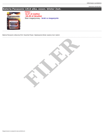 Informacje o produkcie Utworzono 04-03-2017 Bateria Panasonic LR14 alka. essen. blister 2szt. Cena : 8,37 zł (netto) 10,30 zł (brutto) Stan magazynowy : brak w magazynie FI LE R Bateria Panasonic alkaiczna R14 Essential Power. Opakowanie blister zawiera 2szt. baterii. Wygenerowano w programie www.oscGold.com