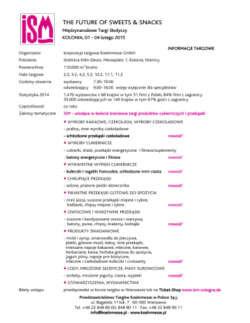 THE FUTURE OF SWEETS & SNACKS Międzynarodowe Targi Słodyczy KOLONIA, 01 - 04 lutego 2015 2015 INFORMACJE TARGOWE Organizator korporacja targowa Koelnmesse GmbH Położenie dzielnica Köln-Deutz, Messeplatz 1, Kolonia, Niemcy Powierzchnia 110.000 m2 brutto Hale targowe 2.2, 3.2, 4.2, 5.2, 10.2, 11.1, 11.2 Godziny otwarcia wystawcy odwiedzający Statystyka 2014 1.476 wystawców z 68 krajów w tym 51 firm z Polski, 84% firm z zagranicy 35.000 odwiedzających ze 140 krajów w tym 67% gości z zagranicy Częstotliwość co roku Zakresy tematyczne ISM - wiodące w świecie branżowe targi produktów cukierniczych i przekąsek 7.30-19.00 9.00-18.00 wstęp wyłącznie dla specjalistów WYROBY KAKAOWE, CZEKOLADA, WYROBY CZEKOLADOWE - praliny, inne wyroby czekoladowe - schłodzone przekąski przekąski czekoladowe nowość WYROBY CUKIERNICZE - cukierki, draże, przekąski energetyczne i fitness/suplementy - batony energetyczne i fitness nowość WYKWINTNE WYPIEKI CUKIERNICZE - bułeczki i rogaliki francuskie, schłodzone mini ciasta nowośćć nowoś CHRUPIĄCE PRZEKĄSKI - solone, prażone pestki słonecznika nowość PIKANTNE PRZEKĄSKI GOTOWE DO SPOŻYCIA - mini pizza, suszone przekąski mięsne i rybne, kiełbaski, chipsy mięsne i rybne nowość OWOCOWE I WARZYWNE PRZEKĄSKI - suszone i kandyzowane owoce i warzywa, batony, puree, chipsy, krakersy, koktajle nowość PRODUKTY ŚNIADANIOWE - miód i syrop, smarowidła do pieczywa, płatki, gotowe musli, keksy, inne przekąski, mieszane napoje kakaowe, mleczne, kawowe, herbaciane, kawa, herbata gotowa do spożycia, jogurt pitny, napoje pro-biotyczne, mleczne i czekoladowe bułeczki i croissanty nowość LODY, MROŻONE SŁODYCZE, MASY SUROWCOWE - sorbety, mrożone jogurty, ciasta, wypieki nowość STOWARZYSZENIA, WYDAWNICTWA Bilety wstępu przedsprzedaż w biurze targów w Warszawie lub na TicketTicket-Shop www.ismwww.ism-cologne.de cologne.de Przedstawicielstwo Targów Koelnmesse w Polsce Sp.j. ul. Bagatela 11 lok. 7 · 00-585 Warszawa Tel. +48 22 848 80 00, 848 80 11 · Fax: +48 22 848 90 11 [email protected] · www.koelnmesse.pl