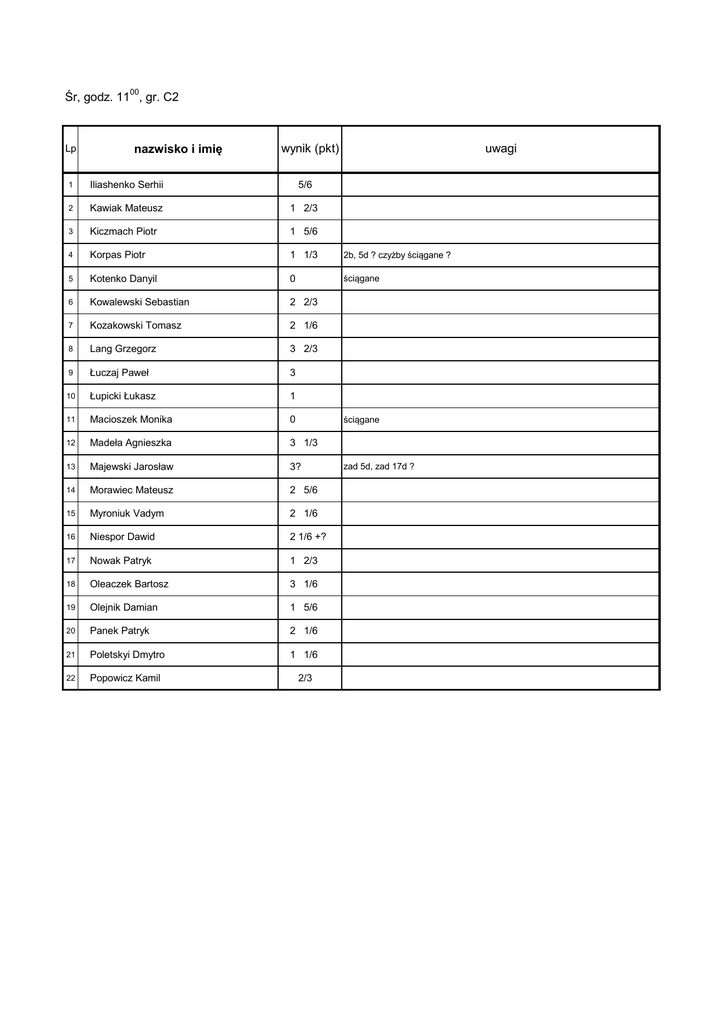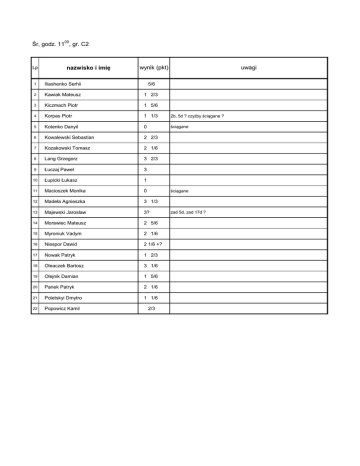 Śr, godz. 1100, gr. C2 Lp nazwisko i imię wynik (pkt) uwagi 1 Iliashenko Serhii 5/6 2 Kawiak Mateusz 1 2/3 3 Kiczmach Piotr 1 5/6 4 Korpas Piotr 1 1/3 2b, 5d ? czyżby ściągane ? 5 Kotenko Danyil 0 ściągane 6 Kowalewski Sebastian 2 2/3 7 Kozakowski Tomasz 2 1/6 8 Lang Grzegorz 3 2/3 9 Łuczaj Paweł 3 10 Łupicki Łukasz 1 11 Macioszek Monika 0 12 Madeła Agnieszka 3 1/3 13 Majewski Jarosław 3? 14 Morawiec Mateusz 2 5/6 15 Myroniuk Vadym 2 1/6 16 Niespor Dawid 2 1/6 +? 17 Nowak Patryk 1 2/3 18 Oleaczek Bartosz 3 1/6 19 Olejnik Damian 1 5/6 20 Panek Patryk 2 1/6 21 Poletskyi Dmytro 1 1/6 22 Popowicz Kamil 2/3 ściągane zad 5d, zad 17d ?