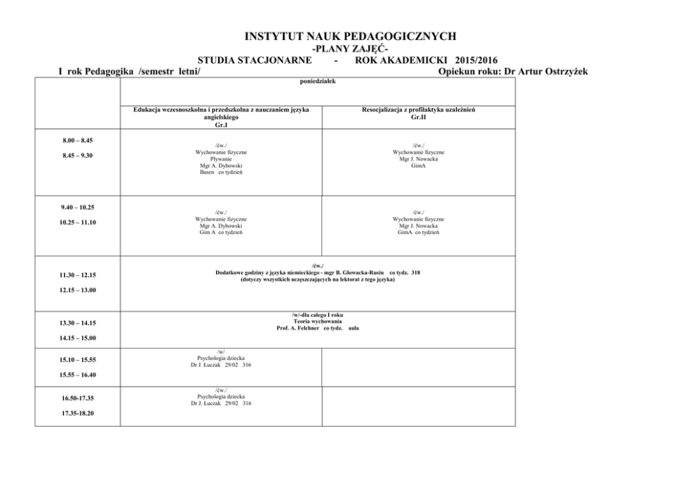 INSTYTUT NAUK PEDAGOGICZNYCH -PLANY ZAJĘĆSTUDIA STACJONARNE ROK AKADEMICKI 2015/2016 I rok Pedagogika /semestr letni/ Opiekun roku: Dr Artur Ostrzyżek poniedziałek 8.00 – 8.45 8.45 – 9.30 9.40 – 10.25 10.25 – 11.10 11.30 – 12.15 Edukacja wczesnoszkolna i przedszkolna z nauczaniem języka angielskiego Gr.I Resocjalizacja z profilaktyka uzależnień Gr.II /ćw./ Wychowanie fizyczne Pływanie Mgr A. Dybowski Basen co tydzień /ćw./ Wychowanie fizyczne Mgr J. Nowacka GimA /ćw./ Wychowanie fizyczne Mgr A. Dybowski Gim A co tydzień /ćw./ Wychowanie fizyczne Mgr J. Nowacka GimA co tydzień /ćw./ Dodatkowe godziny z języka niemieckiego - mgr B. Głowacka-Rusin co tydz. 318 (dotyczy wszystkich uczęszczających na lektorat z tego języka) 12.15 – 13.00 /w/-dla całego I roku Teoria wychowania Prof. A. Felchner co tydz. aula 13.30 – 14.15 14.15 – 15.00 15.10 – 15.55 /w/ Psychologia dziecka Dr J. Łuczak 29/02 316 15.55 – 16.40 16.50-17.35 17.35-18.20 /ćw./ Psychologia dziecka Dr J. Łuczak 29/02 316 wtorek 8.00 – 8.45 Edukacja wczesnoszkolna i przedszkolna z nauczaniem języka angielskiego Gr.I Resocjalizacja z profilaktyka uzależnień Gr.II /ćw./ Warsztaty muzyczne Dr A. Wilczkowska 23/02 33 /ćw./ Dydaktyka ogólna Dr K. Gal Co tydzień 207 /ćw./ Dydaktyka ogólna Dr K. Gal Co tydzień 207 /ćw./ Warsztaty muzyczne Dr A. Wilczkowska 23/02 33 /ćw./ Pedagogika resocjalizacyjna Dr K. Kopczyński 1/03 206 8.45 – 9.30 9.40 – 10.25 10.25 – 11.10 11.30-13.00 /w/-dla całego I roku /w/ Pedagogika ogólna Prof. W. Pasicznik 1/03 45 11.30 – 12.15 11.30-13.00 /w/ Pedagogika resocjalizacyjna Dr K. Kopczyński 23/02 206 12.15 – 13.00 /w/ Readaptacja społeczna Dr S. Leszto 1/03 203 13.30 – 14.15 14.15 – 15.00 15.10 – 15.55 15.55 – 16.40 16.50-17.35 17.35-18.20 /ćw./ Pedagogika przedszkolna Mgr K. Kluf 1/03 1 04 środa Edukacja wczesnoszkolna i przedszkolna z nauczaniem języka angielskiego Gr.I 8.00 – 8.45 8.45 – 9.30 9.40 – 10.25 Resocjalizacja z profilaktyka uzależnień Gr.II /ćw./ Wychowanie fizyczne Pływanie Mgr A. Dybowski Basen co tydzień Lektorat języka obcego-Język angielski – mgr W. Paraszewski 206 Lektorat języka obcego-Język niemiecki- mgr B. Głowacka-Rusin 207 10.25 – 11.10 11.30 – 12.15 Gr. 1 /ćw./ Warsztaty plastyczne Dr M. Olszewska 2/03 116B2 12.15 – 13.00 13.30 – 14.15 14.15 – 15.00 15.10 – 15.55 15.55 – 16.40 Gr.3 /ćw./ Warsztaty plastyczne Dr M. Olszewska Od 30 III 116B2 (11 godz.) /ćw./ Wychowanie fizyczne Mgr J. Nowacka GimB co tydzień /ćw./ Wychowanie fizyczne Mg r H. Nowacki GimB co tydzień czwartek Edukacja wczesnoszkolna i przedszkolna z nauczaniem języka angielskiego Gr.I 8.00 – 8.45 Resocjalizacja z profilaktyka uzależnień Gr.II /w/ Pedagogika przedszkolna Prof. H. Marzec co tydzień 104 8.45 – 9.30 9.40 – 10.25 /ćw./ Praktyczna nauka języka angielskiego Dr D. Gonigroszek co tydzień 203 /ćw/ Biomedyczne podstawy rozwoju i wychowania Dr M. Łabęcka 25/02 206 Gr. 4/ćw./ Warsztaty plastyczne Dr M. Olszewska Od 31III 116B2 (co 2 tyg.) (11 godz.) 10.25 – 11.10 /w/-dla całego I roku /w/ Dydaktyka ogólna Dr K. Gal co tydzień 45 11.30 – 12.15 12.15 – 13.00 13.30 – 14.15 /ćw/ Biomedyczne podstawy rozwoju i wychowania Dr M. Łabęcka 25/02 206 /w/ Readaptacja społeczna Dr S. Leszto 3/03 206 gr.2/ćw./ Warsztaty plastyczne Dr M. Olszewska Od 25II 116B2 (co 2 tyg.) 14.15 – 15.00 15.10 – 15.55 /w/-dla całego I roku /w/ Filozofia Dr A. Piekarski 3/03 45 15.55 – 16.40 /w/-dla całego I roku /w/ Pojęcia i systemy pedagogiczne Prof. J. Majchrzyk-Mikuła 25/02 45 16.50-17.35 17.35-18.20 16.50-18.20 co tydzień /ćw./ Lektorat z języka obcego-Język rosyjski dr J. Harazińska 305 piątek 8.00 – 8.45 Edukacja wczesnoszkolna i przedszkolna z nauczaniem języka angielskiego Gr.I Resocjalizacja z profilaktyka uzależnień Gr.II 8.00-11.10 /ćw./ Teoria wychowania Dr J. Tomiło 26/02 204 11.30-15.00 /ćw./ Teoria wychowania Dr J. Tomiło 26/02 204 9.40-11.10 /ćw./ Filozofia Mgr M. Stolarczyk 4/03 306 8.00-9.30 /ćw./ Pedagogika ogólna Dr K. Szymczyk 4/03 104 9.40-11.10 /ćw./ Pojęcia i systemy pedagogiczne Dr K. Szymczyk 4/03 104 11.30-13.00 /ćw./ Pojęcia i systemy pedagogiczne Dr K. Szymczyk 4/03 104 11.30-13.00 /ćw./ Filozofia Mgr M. Stolarczyk 4/03 306 8.45 – 9.30 9.40 – 10.25 10.25 – 11.10 11.30 – 12.15 12.15 – 13.00 13.30-14.15 14.15-15.00 13.30-15.00 /ćw./ Pedagogika ogólna Dr K. Szymczyk 4/03 104