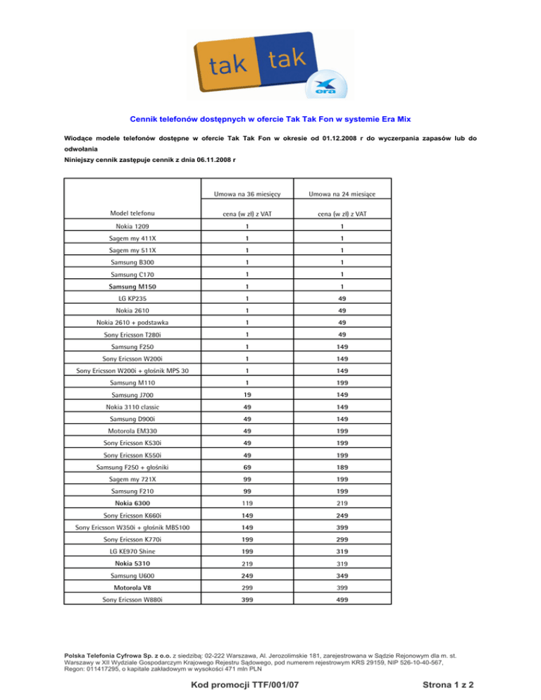Cennik telefonów dostępnych w ofercie Tak Tak Fon w systemie Era Mix Wiodące modele telefonów dostępne w ofercie Tak Tak Fon w okresie od 01.12.2008 r do wyczerpania zapasów lub do odwołania Niniejszy cennik zastępuje cennik z dnia 06.11.2008 r Umowa na 36 miesięcy Umowa na 24 miesiące Model telefonu cena (w zł) z VAT cena (w zł) z VAT Nokia 1209 1 1 Sagem my 411X 1 1 Sagem my 511X 1 1 Samsung B300 1 1 Samsung C170 1 1 Samsung M150 1 1 LG KP235 1 49 Nokia 2610 1 49 Nokia 2610 + podstawka 1 49 Sony Ericsson T280i 1 49 Samsung F250 1 149 Sony Ericsson W200i 1 149 Sony Ericsson W200i + głośnik MPS 30 1 149 Samsung M110 1 199 Samsung J700 19 149 Nokia 3110 classic 49 149 Samsung D900i 49 149 Motorola EM330 49 199 Sony Ericsson K530i 49 199 Sony Ericsson K550i 49 199 Samsung F250 + głośniki 69 189 Sagem my 721X 99 199 Samsung F210 99 199 Nokia 6300 119 219 Sony Ericsson K660i 149 249 Sony Ericsson W350i + głośnik MBS100 149 399 Sony Ericsson K770i 199 299 LG KE970 Shine 199 319 Nokia 5310 219 319 Samsung U600 249 349 Motorola V8 299 399 Sony Ericsson W880i 399 499 Polska Telefonia Cyfrowa Sp. z o.o. z siedzibą: 02-222 Warszawa, Al. Jerozolimskie 181, zarejestrowana w Sądzie Rejonowym dla m. st. Warszawy w XII Wydziale Gospodarczym Krajowego Rejestru Sądowego, pod numerem rejestrowym KRS 29159, NIP 526-10-40-567, Regon: 011417295, o kapitale zakładowym w wysokości 471 mln PLN Kod promocji TTF/001/07 Strona 1 z 2 Sony Ericsson W580i 499 599 iPhone 3G 8GB 1299 1399 iPhone 3G 16GB 1599 1699 Umowa na 36 miesięcy Umowa na 24 miesiące Model telefonu cena (w zł) z VAT cena (w zł) z VAT Modele telefonów o ograniczonej dostępności: LG B2050 1 1 LG KG 275 1 1 LG KG130 1 1 Motorola W375 1 1 Nokia 1208 1 1 Nokia 1600 1 1 Sagem my 200C 1 1 Sagem my 220X 1 1 Sagem my 401C 1 1 Samsung C140 1 1 Samsung C260 1 1 Nokia 6103 1 49 Samsung E250 1 49 Sony Ericsson K510i 1 49 Nokia 2630 1 99 Nokia 6070 1 99 Nokia 3109 classic 49 149 Sony Ericsson K750i 49 149 Nokia 5300 49 199 Nokia 6131 49 199 Samsung J600E 69 199 Sony Ericsson W300i 79 149 Polska Telefonia Cyfrowa Sp. z o.o. z siedzibą: 02-222 Warszawa, Al. Jerozolimskie 181, zarejestrowana w Sądzie Rejonowym dla m. st. Warszawy w XII Wydziale Gospodarczym Krajowego Rejestru Sądowego, pod numerem rejestrowym KRS 29159, NIP 526-10-40-567, Regon: 011417295, o kapitale zakładowym w wysokości 471 mln PLN Kod promocji TTF/001/07 Strona 2 z 2