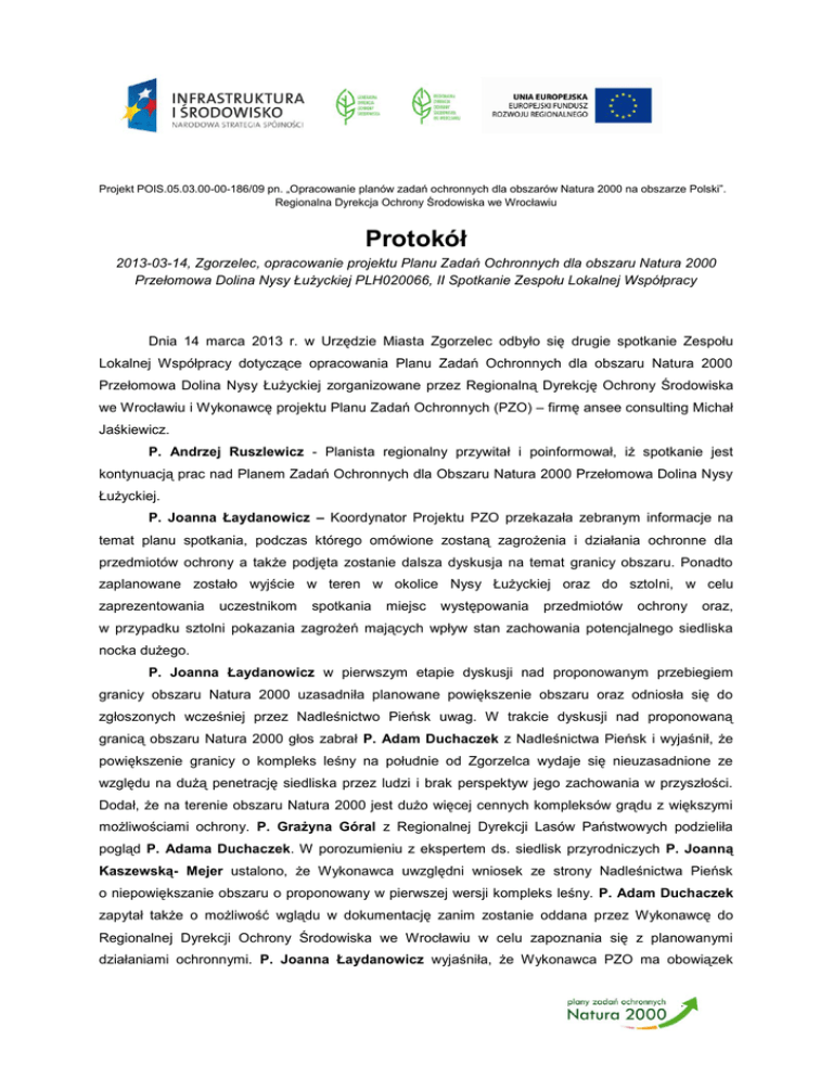 Projekt POIS.05.03.00-00-186/09 pn. „Opracowanie planów zadań ochronnych dla obszarów Natura 2000 na obszarze Polski”. Regionalna Dyrekcja Ochrony Środowiska we Wrocławiu Protokół 2013-03-14, Zgorzelec, opracowanie projektu Planu Zadań Ochronnych dla obszaru Natura 2000 Przełomowa Dolina Nysy Łużyckiej PLH020066, II Spotkanie Zespołu Lokalnej Współpracy Dnia 14 marca 2013 r. w Urzędzie Miasta Zgorzelec odbyło się drugie spotkanie Zespołu Lokalnej Współpracy dotyczące opracowania Planu Zadań Ochronnych dla obszaru Natura 2000 Przełomowa Dolina Nysy Łużyckiej zorganizowane przez Regionalną Dyrekcję Ochrony Środowiska we Wrocławiu i Wykonawcę projektu Planu Zadań Ochronnych (PZO) – firmę ansee consulting Michał Jaśkiewicz. P. Andrzej Ruszlewicz - Planista regionalny przywitał i poinformował, iż spotkanie jest kontynuacją prac nad Planem Zadań Ochronnych dla Obszaru Natura 2000 Przełomowa Dolina Nysy Łużyckiej. P. Joanna Łaydanowicz – Koordynator Projektu PZO przekazała zebranym informacje na temat planu spotkania, podczas którego omówione zostaną zagrożenia i działania ochronne dla przedmiotów ochrony a także podjęta zostanie dalsza dyskusja na temat granicy obszaru. Ponadto zaplanowane zostało wyjście w teren w okolice Nysy Łużyckiej oraz do sztolni, w celu zaprezentowania uczestnikom spotkania miejsc występowania przedmiotów ochrony oraz, w przypadku sztolni pokazania zagrożeń mających wpływ stan zachowania potencjalnego siedliska nocka dużego. P. Joanna Łaydanowicz w pierwszym etapie dyskusji nad proponowanym przebiegiem granicy obszaru Natura 2000 uzasadniła planowane powiększenie obszaru oraz odniosła się do zgłoszonych wcześniej przez Nadleśnictwo Pieńsk uwag. W trakcie dyskusji nad proponowaną granicą obszaru Natura 2000 głos zabrał P. Adam Duchaczek z Nadleśnictwa Pieńsk i wyjaśnił, że powiększenie granicy o kompleks leśny na południe od Zgorzelca wydaje się nieuzasadnione ze względu na dużą penetrację siedliska przez ludzi i brak perspektyw jego zachowania w przyszłości. Dodał, że na terenie obszaru Natura 2000 jest dużo więcej cennych kompleksów grądu z większymi możliwościami ochrony. P. Grażyna Góral z Regionalnej Dyrekcji Lasów Państwowych podzieliła pogląd P. Adama Duchaczek. W porozumieniu z ekspertem ds. siedlisk przyrodniczych P. Joanną Kaszewską- Mejer ustalono, że Wykonawca uwzględni wniosek ze strony Nadleśnictwa Pieńsk o niepowiększanie obszaru o proponowany w pierwszej wersji kompleks leśny. P. Adam Duchaczek zapytał także o możliwość wglądu w dokumentację zanim zostanie oddana przez Wykonawcę do Regionalnej Dyrekcji Ochrony Środowiska we Wrocławiu w celu zapoznania się z planowanymi działaniami ochronnymi. P. Joanna Łaydanowicz wyjaśniła, że Wykonawca PZO ma obowiązek . złożyć dokumentację w określonym umową terminie a dostęp do zapisów będzie możliwy na Platformie Informacyjno-Komunikacyjnej. P. Andrzej Ruszlewicz dodał, że termin oddania dokumentacji Planu przez Wykonawcę nie jest tożsamy z realizacją jego zapisów, ale że najpierw zostanie przeanalizowany przez pracowników Regionalnej Dyrekcji Ochrony Środowiska we Wrocławiu, a także udostępniony pracownikom Regionalnej Dyrekcji Lasów Państwowych. Fot. 1. P. Adam Duchaczek podczas dyskusji nad Planem Zadań Ochronnych dla obszaru Natura 2000 Przełomowa Dolina Nysy Łużyckiej. P. Piotr Konwiński, zastępca Burmistrza Zgorzelca podzielił poglądy P. Adama Duchaczek i zapytał jaki jest cel tworzenia Natury 2000 w takich miejscach, które rodzą problemy i nie są aż tak cenne przyrodniczo. P. Joanna Kaszewska-Mejer wyjaśniła, że pomimo tego, iż siedlisko to jest w dużym stopniu zmienione to nadal jest siedliskiem przyrodniczym. Dodała, że to była tylko propozycja i że spotkania Zespołu Lokalnej Współpracy mają właśnie na celu dyskusję na temat stanu przedmiotów ochrony i propozycji granicy. P. Andrzej Ruszlewicz zaproponował, aby temat północnej części obszaru przedyskutować po spotkaniu z przedstawicielami Miasta Zgorzelec i Nadleśnictwa Pieńsk. P. Dominika Marek z RZGW we Wrocławiu poruszyła kwestię możliwości prowadzenia prac regulacyjnych na Nysie i wyraziła obawę o zapisy w PZO. P. Andrzej Ruszlewicz poinformował, że w Planie nie znajdą się zakazy i nakazy w zakresie możliwości prowadzenia takich prac, dodał jednak że 2 . nadal będzie obowiązywała procedura kwalifikująca planowane przedsięwzięcia do oceny oddziaływania. Następnie P. Katarzyna Kozyra ekspert ds. teriologii zaprezentowała wyniki badań w zakresie ssaków, stanowiących przedmioty ochrony obszaru Natura 2000 Przełomowa Dolina Nysy Łużyckiej i omówiła zidentyfikowane zagrożenia i proponowane działania ochronne dla wydry. Fot. 2. P. Katarzyna Kozyra podczas prezentacji dotyczącej ssaków stanowiących przedmioty ochrony obszaru Natura 2000 Przełomowa Dolina Nysy Łużyckiej. P. Paweł Kisiel - ekspert ds. herpetologii poinformował o występowaniu w granicach obszaru stanowisk traszki grzebieniastej, omówił stan zachowania gatunku w obszarze i przedstawił zagrożenia i działania ochronne dla tego gatunku płaza. P. Waldemar Bena – ekspert ds. entomologii omówił stan zachowania trzech gatunków motyli, będących przedmiotami ochrony obszaru Natura 2000 oraz wskazał zidentyfikowane zagrożenia oraz proponowane działania ochronne dla modraszka nausitousa, modraszka telejusa oraz czerwończyka nieparka. P. Joanna Kaszewska - Mejer – ekspert w zakresie botaniki, omówiła stan zachowania, zagrożenia oraz działania ochronne dla siedlisk przyrodniczych. 3 . Fot. 3. P. Paweł Kisiel podczas prezentacji dotyczącej płazów stanowiących przedmioty ochrony obszaru Natura 2000 Przełomowa Dolina Nysy Łużyckiej. Fot. 4. P. Joanna Kaszewska-Mejer podczas prezentacji dotyczącej siedlisk przyrodniczych stanowiących przedmiot