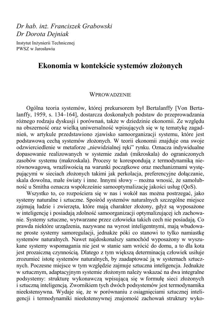 20 FRANCISZEK GRABOWSKI, DOROTA DEJNIAK Dr hab. inż. Franciszek Grabowski Dr Dorota Dejniak Instytut Inżynierii Technicznej PWSZ w Jarosławiu Ekonomia w kontekście systemów złożonych WPROWADZENIE Ogólna teoria systemów, której prekursorem był Bertalanffy [Von Bertalanffy, 1959, s. 134–164], dostarcza doskonałych podstaw do przeprowadzania różnego rodzaju dyskusji i porównań, także w dziedzinie ekonomii. Ze względu na obszerność oraz wielką uniwersalność wpisujących się w tę tematykę zagadnień, w artykule przedstawiono zjawisko samoorganizacji systemu, które jest podstawową cechą systemów złożonych. W teorii ekonomii znajduje ona swoje odzwierciedlenie w metaforze „niewidzialnej ręki” rynku. Oznacza indywidualne dopasowanie realizowanych w systemie zadań (mikroskala) do ograniczonych zasobów systemu (makroskala). Procesy te korespondują z termodynamiką nierównowagową, wrażliwością na warunki początkowe oraz mechanizmami występującymi w sieciach złożonych takimi jak perkolacja, preferencyjne dołączanie, skala dowolna, małe światy i inne. Innymi słowy – można wnosić, że samolubność u Smitha oznacza współcześnie samooptymalizację jakości usług (QoS). Wszystko to, co rozpościera się w nas i wokół nas można postrzegać, jako systemy naturalne i sztuczne. Spośród systemów naturalnych szczególne miejsce zajmują ludzie i zwierzęta, które mają charakter złożony, gdyż są wyposażone w inteligencję i posiadają zdolność samoorganizacji optymalizującej ich zachowanie. Systemy sztuczne, wytwarzane przez człowieka takich cech nie posiadają. Co prawda niektóre urządzenia, nazywane na wyrost inteligentnymi, mają wbudowane proste systemy samoregulacji, jednakże póki co stanowi to tylko namiastkę systemów naturalnych. Nawet najdoskonalszy samochód wyposażony w wyszukane systemy wspomagania nie jest w stanie sam wrócić do domu, a to dla kota jest prozaiczną czynnością. Dlatego z tym większą determinacją człowiek usiłuje zrozumieć istotę systemów naturalnych, by zaadaptować ją w systemach sztucznych. Poczesne miejsce w tym względzie zajmuje sztuczna inteligencja. Jednakże w sztucznym, adaptacyjnym systemie złożonym należy wskazać na dwa integralne podsystemy: strukturę wykonawczą wpisującą się w formułę sieci złożonych i sztuczną inteligencją. Zwornikiem tych dwóch podsystemów jest termodynamika nieekstensywna. Wydaje się, że w porównaniu z osiągnięciami sztucznej inteligencji i termodynamiki nieekstensywnej znajomość zachowań struktury wyko- Ekonomia w kontekście systemów złożonych 21 nawczej systemów złożonych jest w powijakach. Jest to o tyle istotne, że struktura wykonawcza stanowi zrąb inteligentnych systemów złożonych i bez jej znajomości nie sposób zrozumieć i budować całości w tym inteligentnych systemów agentowych. Nie sposób zarządzać czymś inteligentnie nie wiedząc, czym zarządzamy. Dlatego głównym celem naszych badań jest zrozumienie istoty systemu złożonego, którego samoorganizacja może pójść w złym lub dobrym kierunku [Ashby, 1947, s. 37, 125–128; Ashby, 1962, s. 255–278]. Wszystkim nam chodzi o to, by prowadzić system w kierunku nie tylko dobrej, ale zarazem optymalnej samoorganizacji. W tym kontekście kluczowym pojęciem jest metafora „niewidzialnej ręki”, której do opisu procesów samoorganizacji systemów użył po raz pierwszy Adam Smith dowodząc, że mechanizm samolubnych (self-love) zachowań człowieka (skala mikro) prowadzi do samoorganizacji systemu (skala makro) [Ashby, 1947, s. 37, 125– 128; Ashby, 1962, s. 255–278]. Pomimo, że w swoich dziełach Smith użył tego terminu tylko dwa razy, raz w Theory of Moral Sentiments [Bak, 1996], drugi raz w Wealth of Nations [Zabieglik, 2003] to idea tej metafory przenika wszystkie jego teorie społeczne i moralne. Godne podkreślenia jest to, że, pomimo iż teoria Smitha wyrosła w epoce postnewtonowskiej zdominowanej przez makroskopowy paradygmat redukcjonizmu, czyli systemów prostych to nosi ona prekursorskie, holistyczne znamiona systemów złożonych (man of system), które zaczęły fascynować świat nauki dwieście lat później [Albert, Barabási, 2002, s. 47–95; Bourgine, Johnson, 2006, s. 1–71; Braha i in., 2006; Goldin i in., 2006; Milgram, 1967, s. 60–67; Watts, Strogatz, 1998, s. 393, 440–442; Watts, 1999]. Smith zasygnalizował istotne kwestie, specyficzne dla powstałej w połowie XX wieku cybernetyki. Przede wszystkim wskazał, że samoorganizacja zachowań pojedynczych ludzi, czyli indywidualne dopasowanie się do ograniczonych możliwości zewnętrznych systemu prowadzi do samooptymalizacji globalnej. Patrząc z tego punktu widzenia był również prekursorem termodynamiki nierównowagowej [Tsallis, 1999, s. 1–35, 52]. Dopiero nieomalże dwa wieki później, pionier cybernetyki Ashby, jako pierwszy wskazał na dwa fundamentalne znaczenia pojęcia samoorganizacji systemów [Ashby, 1947, s. 125–128]. Pierwsze, odniósł do kontekstu systemów prostych i procesów emergencji prowadzących do systemów złożonych. M.in. pisze on: the system that starts with its parts separate (so that the behavior of each is independent of the others’ states) and whose parts then act so that they change towards forming connections of some type. Such a system is “selforganizing” in the sense, that it changes from parts separated to part joined [Ashby, 1962, s. 255–278]. Druga kwestia dotyczy pojęć dobrej i złej samoorganizacji: changing from a bad organization to good one [Ashby, 1962, s. 255– 278]. The system would be “self-organizing”, if a change were automatically made to the feedback, changing it from positive to negative; the whole would have changed from a bad organization to a good. Cleary, this type of “selforganization” is of peculiar to us. If we wish it to be a “good” one, we must first provide a cri