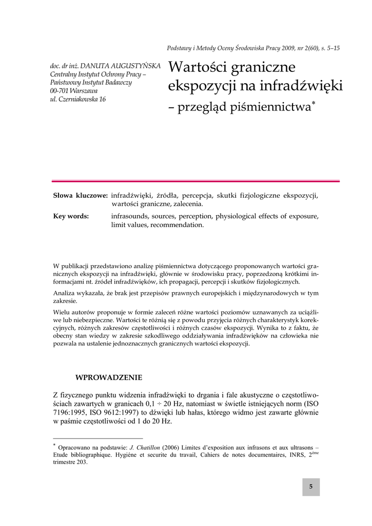 Podstawy i Metody Oceny Środowiska Pracy 2009, nr 2(60), s. 5–15 doc. dr inż. DANUTA AUGUSTYŃSKA Centralny Instytut Ochrony Pracy – Państwowy Instytut Badawczy 00-701 Warszawa ul. Czerniakowska 16 Wartości graniczne ekspozycji na infradźwięki – przegląd piśmiennictwa Słowa kluczowe: infradźwięki, źródła, percepcja, skutki fizjologiczne ekspozycji, wartości graniczne, zalecenia. Key words: infrasounds, sources, perception, physiological effects of exposure, limit values, recommendation. W publikacji przedstawiono analizę piśmiennictwa dotyczącego proponowanych wartości granicznych ekspozycji na infradźwięki, głównie w środowisku pracy, poprzedzoną krótkimi informacjami nt. źródeł infradźwięków, ich propagacji, percepcji i skutków fizjologicznych. Analiza wykazała, że brak jest przepisów prawnych europejskich i międzynarodowych w tym zakresie. Wielu autorów proponuje w formie zaleceń różne wartości poziomów uznawanych za uciążliwe lub niebezpieczne. Wartości te różnią się z powodu przyjęcia różnych charakterystyk korekcyjnych, różnych zakresów częstotliwości i różnych czasów ekspozycji. Wynika to z faktu, że obecny stan wiedzy w zakresie szkodliwego oddziaływania infradźwięków na człowieka nie pozwala na ustalenie jednoznacznych granicznych wartości ekspozycji. WPROWADZENIE Z fizycznego punktu widzenia infradźwięki to drgania i fale akustyczne o częstotliwościach zawartych w granicach 0,1 ÷ 20 Hz, natomiast w świetle istniejących norm (ISO 7196:1995, ISO 9612:1997) to dźwięki lub hałas, którego widmo jest zawarte głównie w paśmie częstotliwości od 1 do 20 Hz. Opracowano na podstawie: J. Chatillon (2006) Limites d’exposition aux infrasons et aux ultrasons – Etude bibliographique. Hygiéne et securite du travail, Cahiers de notes documentaires, INRS, 2éme trimestre 203. 5 Źródła infradźwięków występujących w środowisku są dwojakiego pochodzenia: naturalnego (niektóre zjawiska przyrody) i sztucznego (maszyny i inne urządzenia). W odniesieniu do infradźwięków sztucznego pochodzenia, którym nieodłącznie towarzyszy hałas zawierający składowe o niskich częstotliwościach słyszalnych, stosowane jest pojęcie hałas infradźwiękowy. Zgodnie z normą PN-N-01338:1986 hałasem infradźwiękowym przyjęto nazywać hałas, w którego widmie występują składowe o częstotliwościach infradźwiękowych od 2 Hz i o niskich częstotliwościach słyszalnych do 50 Hz. W nowym projekcie PN-N-01338 (norma w ustanowieniu) hałasem infradźwiękowym określa się hałas, którego widmo jest zawarte w paśmie częstotliwości 1 ÷ 20 Hz. Obecnie coraz powszechniej jest używane pojęcie „hałas niskoczęstotliwościowy” obejmujący zakres częstotliwości od około 10 do 250 Hz (niekiedy do 500 Hz). Badania nad uciążliwością i szkodliwością infradźwięków i hałasu niskoczęstotliwościowego są prowadzone od wielu lat i wielu autorów za uciążliwe lub niebezpieczne dla człowieka przyjmuje różne wartości ich poziomów. W niniejszym opracowaniu przedstawiono przegląd bibliograficzny dotyczący proponowanych wartości granicznych ekspozycji na infradźwięki, głównie w środowisku pracy, poprzedzony krótkimi informacjami nt. źródeł infradźwięków, ich propagacji, percepcji i skutków fizjologicznych. ŹRÓDŁA INFRADŹWIĘKÓW Rozróżnia się naturalne i sztuczne źródła infradźwięków. Źródłami naturalnymi są gwałtowne ruchy powietrza (wiatr, burze o poziomach ciśnienia akustycznego do 135 dB i prędkości wiatru do 100 km/h), szybkie zmiany ciśnienia atmosferycznego (o częstotliwości < 1 Hz i poziomie 100 dB), ruchy wody (fale oceaniczne o częstotliwości < 1 Hz), a także drgania ziemi wywołane erupcjami wulkanicznymi lub trzęsieniami ziemi, które z kolei są źródłami infradźwięków rozchodzących się w powietrzu. Do sztucznych źródeł infradźwięków zalicza się przede wszystkim różne maszyny i urządzenia przemysłowe, środki transportu lądowego i wodnego oraz lotnictwo. Wszystkie środki transportu (samochody osobowe i ciężarowe, helikoptery, samoloty, statki i pociągi) są źródłami hałasu słyszalnego niskoczęstotliwościowego i infradźwięków (Iwahashi, Ochiai 2001). Poziomy infradźwięków wewnątrz pojazdów wynoszą np. w samochodach ciężarowych i pociągach do 120 dB, a w helikopterach od 115 do 150 dB. W środowisku przemysłowym źródłami infradźwięków są maszyny obrotowe ciężkie: sprężarki, dmuchawy, wentylatory, pompy i młyny (poziomy infradźwięków wahają się od 90 do 110 dB), (Pawlaczyk-Łuszczyńska 1998). Rozwój elektrowni wiatrowych jako źródeł energii odnawialnej doprowadził ostatnio do polemik dotyczących możliwości wytwarzania przez nie infradźwięków uciążliwych dla środowiska. Przykładowe dane pomiarowe (British… 2005) pozwalają stwierdzić, że emitowane poziomy infradźwięków są rzędu poziomów pochodzących od źródeł naturalnych. Źródła impulsowe (wybuchy i udary) mogą także emitować składowe o wysokiej energii leżące w części infradźwiękowej widma, a ponadto niektóre źródła koherentne emitujące dwie składowe tonalne nieinfradźwiękowe o blisko leżących częstotliwościach mogą powodować pojawienie się infradźwięków przy częstotliwości różnicowej. Jako źródła infradźwięków mniej rozpowszechnione można wymienić urządzenia wytwarzające infradźwięki w celach terapeutycznych (masaże) oraz wojskowych (broń nieśmiercionośna), (Vinokur 2004). 6 PROPAGACJA INFRADŹWIĘKÓW Infradźwięki, podobnie jak dźwięki słyszalne, są falami akustycznymi rozchodzącymi się w ośrodkach sprężystych, a więc w: gazach, cieczach i ośrodkach stałych. Ich cechą charakterystyczną jest bardzo małe pochłanianie w ośrodku. Na przykład, w powietrzu poziom energii fali infradźwiękowej o częstotliwości 10 Hz zmniejsza się t