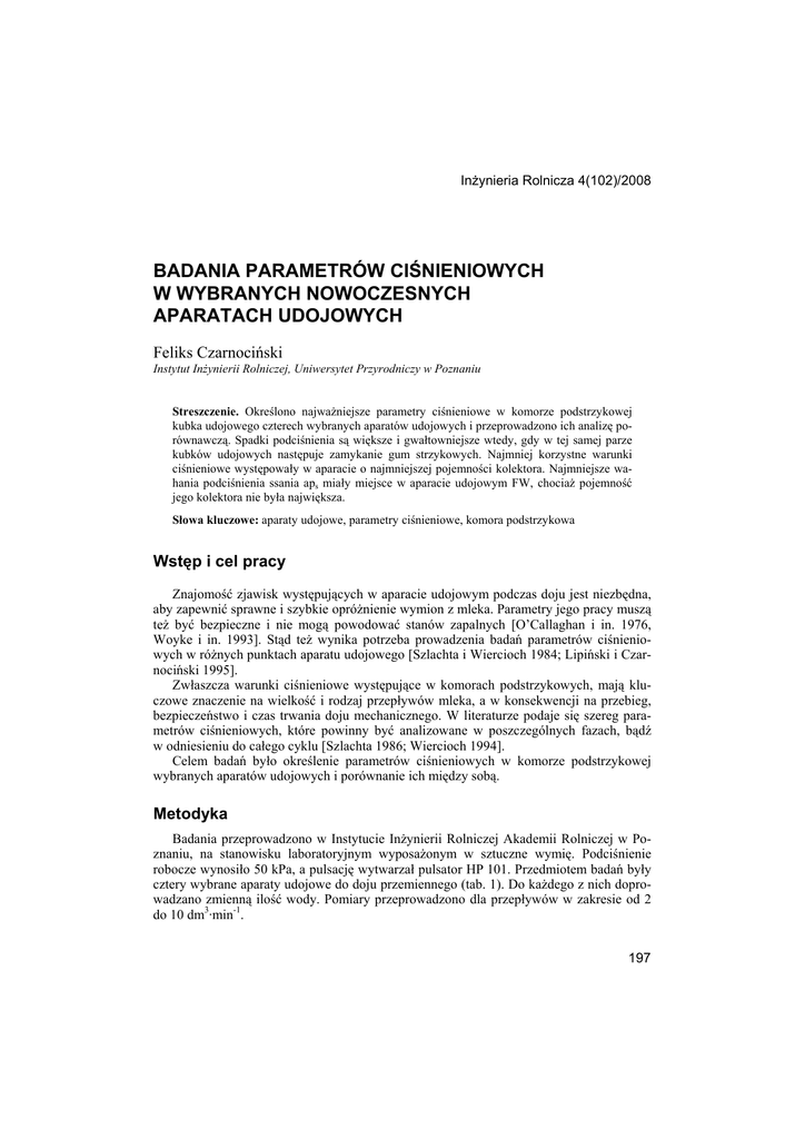 Inżynieria Rolnicza 4(102)/2008 BADANIA PARAMETRÓW CIŚNIENIOWYCH W WYBRANYCH NOWOCZESNYCH APARATACH UDOJOWYCH Feliks Czarnociński Instytut Inżynierii Rolniczej, Uniwersytet Przyrodniczy w Poznaniu Streszczenie. Określono najważniejsze parametry ciśnieniowe w komorze podstrzykowej kubka udojowego czterech wybranych aparatów udojowych i przeprowadzono ich analizę porównawczą. Spadki podciśnienia są większe i gwałtowniejsze wtedy, gdy w tej samej parze kubków udojowych następuje zamykanie gum strzykowych. Najmniej korzystne warunki ciśnieniowe występowały w aparacie o najmniejszej pojemności kolektora. Najmniejsze wahania podciśnienia ssania aps miały miejsce w aparacie udojowym FW, chociaż pojemność jego kolektora nie była największa. Słowa kluczowe: aparaty udojowe, parametry ciśnieniowe, komora podstrzykowa Wstęp i cel pracy Znajomość zjawisk występujących w aparacie udojowym podczas doju jest niezbędna, aby zapewnić sprawne i szybkie opróżnienie wymion z mleka. Parametry jego pracy muszą też być bezpieczne i nie mogą powodować stanów zapalnych [O’Callaghan i in. 1976, Woyke i in. 1993]. Stąd też wynika potrzeba prowadzenia badań parametrów ciśnieniowych w różnych punktach aparatu udojowego [Szlachta i Wiercioch 1984; Lipiński i Czarnociński 1995]. Zwłaszcza warunki ciśnieniowe występujące w komorach podstrzykowych, mają kluczowe znaczenie na wielkość i rodzaj przepływów mleka, a w konsekwencji na przebieg, bezpieczeństwo i czas trwania doju mechanicznego. W literaturze podaje się szereg parametrów ciśnieniowych, które powinny być analizowane w poszczególnych fazach, bądź w odniesieniu do całego cyklu [Szlachta 1986; Wiercioch 1994]. Celem badań było określenie parametrów ciśnieniowych w komorze podstrzykowej wybranych aparatów udojowych i porównanie ich między sobą. Metodyka Badania przeprowadzono w Instytucie Inżynierii Rolniczej Akademii Rolniczej w Poznaniu, na stanowisku laboratoryjnym wyposażonym w sztuczne wymię. Podciśnienie robocze wynosiło 50 kPa, a pulsację wytwarzał pulsator HP 101. Przedmiotem badań były cztery wybrane aparaty udojowe do doju przemiennego (tab. 1). Do każdego z nich doprowadzano zmienną ilość wody. Pomiary przeprowadzono dla przepływów w zakresie od 2 do 10 dm3·min-1. 197 Feliks Czarnociński Przebiegi podciśnienia w komorze podstrzykowej i pulsacyjnej kubka udojowego były rejestrowane równocześnie. Pomiary przeprowadzono przyrządem PULSOTESTsyncro (WestfaliaSurge) z dokładnością 0,6 kPa i częstotliwością próbkowania 100 Hz. W czasie pomiarów wyniki zapisywano w pamięci wewnętrznej przyrządu i po skończonym cyklu pomiarowym kopiowano je do komputera. Wykresy przebiegów podciśnienia przeglądano w programie Pulse Viewer wersji 1.2, a dane liczbowe przenoszono i opracowywano w arkuszu kalkulacyjnym Excel. Tabela 1. Podstawowe dane badanych aparatów udojowych Table 1. The basic data of the investigated milking apparatuses Oznaczenie Aparat udojowy DL 1 DL 2 DL 3 FW Harmony MC 53 MC 11 Clearflow Pojemność kolektora, masa aparatu udojowego 360 cm3, 1 680 g 360 cm3, 2 492 g 150 cm3, 2 693 g 310 cm3, 2 123 g Źródło: pomiary własne autora Analizowano wpływ na najważniejsze parametry ciśnieniowe w komorze podstrzykowej kubka udojowego: średnie podciśnienie ssania, masażu i w cyklu (pss, pms i ps), wahania podciśnienia ssania, masażu i w cyklu (aps, apm i dp) oraz wzrost podciśnienia w fazie otwierania dp1. Dane te poddano ocenie statystycznej, wykorzystując równania regresji i analizę wariancji dla doświadczeń jednoczynnikowych. Weryfikowano też istotność różnic między wartościami średnimi (Scheffe 0,05). Obliczenia przeprowadzono programem komputerowym Statistica 7,1 PL. Wyniki Na rysunku 1 cienką ciągłą linią zaznaczono przebieg pulsacji CH1 w kubku udojowym, w którym rejestrowano podciśnienie w komorze podstrzykowej, a linią przerywaną – pulsację w drugiej parze kubków (CH2). Wahania podciśnienia w komorze podstrzykowej znacznie różnią się w poszczególnych aparatach udojowych. Najmniejsze są w aparatach FW i DL2, nieco większe w DL1, a zdecydowanie największe w aparacie udojowym DL3, o pojemności kolektora 150 cm3). Wydaje się, że w głównej mierze są one spowodowane pracą gum strzykowych. Spadki podciśnienia występują zawsze - przy zamykaniu się gum, a wzrosty – przy ich otwieraniu się. Dzieje się tak, gdy ma to miejsce w jednym lub drugim kanale pulsacyjnym. W dużym stopniu skala wahań podciśnienia zależy też od pojemności kolektora. W tabelach 2 i 3 przedstawiono wyniki analizy wariancji najważniejszych parametrów ciśnieniowych w komorze podstrzykowej badanych aparatów udojowych przy podciśnieniu roboczym 50 kPa. Otrzymane średnie wartości porównywano dla poszczególnych przepływów cieczy. Przy dużych przepływach 6-10 dm3·min-1 otrzymano też już jednoznaczność wyników. Dla średnich podciśnień zawsze zachodzą statystycznie istotne różnice (tab. 2). Wyniki zawarte w tabeli 3 okazały się nieistotne jedynie w jednym przypadku, dla wzrostu podciśnienia w fazie otwierania dp1 przy przepływie cieczy 2,0 dm3·min-1. 198 Badania parametrów ciśnieniowych... DL1 DL2 DL3 FW CH1 CH2 60.0 Podciśnienie [kPa] 50.0 40.0 30.0 20.0 10.0 0.0 1 11 21 31 41 51 61 71 81 91 101 111 121 131 141 151 161 171 181 191 Punkty pomiarowe Przebiegi podciśnienia dla przepływu Qw=10 dm3·min-1: DL1, DL2 DL3 i FW – w komorze podstrzykowej bieżącej sekcji, CH1-2 – w komorze pulsacyjnej The course of pressure for the flow Qw=10 dm3·min-1: DL1, DL2 DL3 and FW – in the under-teat chamber of the current section, CH1-2 – in the pulsation chamber Rys. 1. Fig. 1. Tabela 2. Średnie podciśnienia pss, pms i ps w komorze podstrzykowej badanych aparatów udojowych Table 2. Mean negative pressures pss, pms and ps in the under-teat chamber of the investigated milking apparatuses
