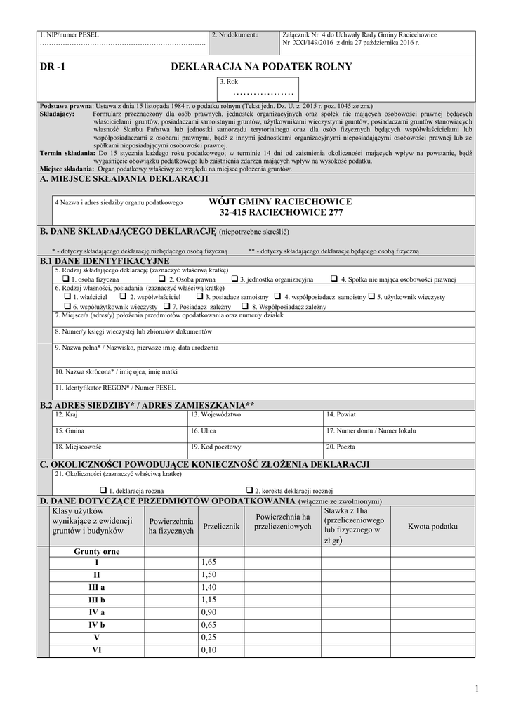 1. NIP/numer PESEL 2. Nr.dokumentu ………………………………………………………………. DR -1 Załącznik Nr 4 do Uchwały Rady Gminy Raciechowice Nr XXI/149/2016 z dnia 27 października 2016 r. DEKLARACJA NA PODATEK ROLNY 3. Rok ……………… Podstawa prawna: Ustawa z dnia 15 listopada 1984 r. o podatku rolnym (Tekst jedn. Dz. U. z 2015 r. poz. 1045 ze zm.) Składający: Formularz przeznaczony dla osób prawnych, jednostek organizacyjnych oraz spółek nie mających osobowości prawnej będących właścicielami gruntów, posiadaczami samoistnymi gruntów, użytkownikami wieczystymi gruntów, posiadaczami gruntów stanowiących własność Skarbu Państwa lub jednostki samorządu terytorialnego oraz dla osób fizycznych będących współwłaścicielami lub współposiadaczami z osobami prawnymi, bądź z innymi jednostkami organizacyjnymi nieposiadającymi osobowości prawnej lub ze spółkami nieposiadającymi osobowości prawnej. Termin składania: Do 15 stycznia każdego roku podatkowego; w terminie 14 dni od zaistnienia okoliczności mających wpływ na powstanie, bądź wygaśnięcie obowiązku podatkowego lub zaistnienia zdarzeń mających wpływ na wysokość podatku. Miejsce składania: Organ podatkowy właściwy ze względu na miejsce położenia gruntów. A. MIEJSCE SKŁADANIA DEKLARACJI WÓJT GMINY RACIECHOWICE 32-415 RACIECHOWICE 277 4 Nazwa i adres siedziby organu podatkowego B. DANE SKŁADAJĄCEGO DEKLARACJĘ (niepotrzebne skreślić) * - dotyczy składającego deklarację niebędącego osobą fizyczną ** - dotyczy składającego deklarację będącego osobą fizyczną B.1 DANE IDENTYFIKACYJNE 5. Rodzaj składającego deklarację (zaznaczyć właściwą kratkę) 1. osoba fizyczna 2. Osoba prawna 3. jednostka organizacyjna 4. Spółka nie mająca osobowości prawnej 6. Rodzaj własności, posiadania (zaznaczyć właściwą kratkę) 1. właściciel 2. współwłaściciel 3. posiadacz samoistny 4. współposiadacz samoistny 5. użytkownik wieczysty 6. współużytkownik wieczysty 7. Posiadacz zależny 8. Współposiadacz zależny 7. Miejsce/a (adres/y) położenia przedmiotów opodatkowania oraz numer/y działek 8. Numer/y księgi wieczystej lub zbioru/ów dokumentów 9. Nazwa pełna* / Nazwisko, pierwsze imię, data urodzenia 10. Nazwa skrócona* / imię ojca, imię matki 11. Identyfikator REGON* / Numer PESEL B.2 ADRES SIEDZIBY* / ADRES ZAMIESZKANIA** 12. Kraj 13. Województwo 14. Powiat 15. Gmina 16. Ulica 17. Numer domu / Numer lokalu 18. Miejscowość 19. Kod pocztowy 20. Poczta C. OKOLICZNOŚCI POWODUJĄCE KONIECZNOŚĆ ZŁOŻENIA DEKLARACJI 21. Okoliczności (zaznaczyć właściwą kratkę) 1. deklaracja roczna 2. korekta deklaracji rocznej D. DANE DOTYCZĄCE PRZEDMIOTÓW OPODATKOWANIA (włącznie ze zwolnionymi) Klasy użytków wynikające z ewidencji gruntów i budynków Grunty orne I II III a III b IV a IV b V VI Powierzchnia ha fizycznych Przelicznik Powierzchnia ha przeliczeniowych Stawka z 1ha (przeliczeniowego lub fizycznego w zł gr) Kwota podatku 1,65 1,50 1,40 1,15 0,90 0,65 0,25 0,10 1 Sady I II III a III b IV IV a IV b V (grunty orne) V (grunty zielone) VI Łąki i pastwiska I II III IV V VI Grunty rolne zabudowane I II III a III III b IV IV a IV b V VI Grunty pod stawami a) zarybione, łososiem, trocią głowacicą, palią i pstrągiem b)zarybione innymi gatunkami ryb niż w poz. a) Grunty pod rowami Grunty zadrzewione i zakrzaczone położone na UR I II III III a III b IV IV a IV b V VI Pow. Ha fiz. przelicznik Pow. Ha przel. 1,65 1,50 1,40 1,40 0,90 0,90 0,65 0,25 0,15 0,10 przelicznik 1,45 1,25 1,05 0,60 0,15 0,10 przelicznik 1,00 1,00 1,00 1,00 1,00 1,00 1,00 1,00 1,00 1,00 przelicznik Stawka Kwota podatku 1,00 0,20 0,20 przelicznik 0,20 0,20 0,20 0,20 0,20 0,20 0,20 0,20 0,20 0,20 Razem ( bez zwolnień) 2 E. INFORMACJA O PRZEDMIOTACH ZWOLNIONYCH (podać rodzaj, klasę i powierzchnię gruntów zwolnionych oraz przepis prawa - z jakiego tytułu występuje zwolnienie) F. ULGI W PODATKU ROLNYM OD GRUNTÓW Kwota ulgi 1. z tytułu nabycia lub objęcia w zagospodarowanie gruntów 2. inwestycyjne 3. górskie 4. inne Razem G. ŁĄCZNA KWOTA PODATKU Kwota podatku Różnica kwot z D – F (po zaokrągleniu do pełnych złotych) H. PODPIS SKŁADAJĄCEGO / OSOBY REPREZENTUJĄCEJ SKŁADAJĄCEGO 22. Imię 23. Nazwisko 24. Data wypełnienia (dzień - miesiąc - rok) 25. Podpis (pieczęć) składającego / osoby reprezentującej składającego I. ADNOTACJE ORGANU PODATKOWEGO 26 Uwagi organu podatkowego 27. Data i podpis przyjmującego formularz Pouczenie Niniejsza deklaracja stanowi podstawę do wystawienia tytułu wykonawczego, zgodnie z przepisami ustawy z dnia 17 czerwca 1966r o postępowaniu egzekucyjnym w administracji ( t.j. Dz. U. z 2015 r. poz. 1045 ze zm.) Obliczony w deklaracji podatek od nieruchomości należy wpłacać w ratach proporcjonalnych do czasu trwania obowiązku podatkowego, bez wezwania na rachunek Urzędu Gminy Raciechowice 277, 32-415 Raciechowice w terminie do dnia 15 marca, 15 maja, 15 września, 15 listopada. Zgodnie z art. 6 ust. 11a ustawy o podatkach i opłatach lokalnych ,, W przypadku gdy kwota podatku nie przekracza 100 zł, podatek jest płatny jednorazowo w terminie płatności pierwszej raty” 3 4