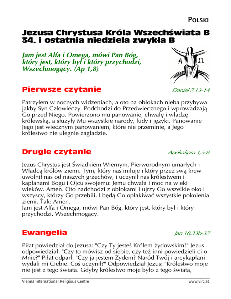 Polski Jam jest Alfa i Omega, mówi Pan Bóg, który jest, który był i który przychodzi, Wszechmogący. (Ap 1,8) Patrzyłem w nocnych widzeniach, a oto na obłokach nieba przybywa jakby Syn Człowieczy. Podchodzi do Przedwiecznego i wprowadzają Go przed Niego. Powierzono mu panowanie, chwałę i władzę królewską, a służyły Mu wszystkie narody, ludy i języki. Panowanie Jego jest wiecznym panowaniem, które nie przeminie, a Jego królestwo nie ulegnie zagładzie. Jezus Chrystus jest Świadkiem Wiernym, Pierworodnym umarłych i Władcą królów ziemi. Tym, który nas miłuje i który przez swą krew uwolnił nas od naszych grzechów, i uczynił nas królestwem i kapłanami Bogu i Ojcu swojemu: Jemu chwała i moc na wieki wieków. Amen. Oto nadchodzi z obłokami i ujrzy Go wszelkie oko i wszyscy, którzy Go przebili. I będą Go opłakiwać wszystkie pokolenia ziemi. Tak: Amen. Jam jest Alfa i Omega, mówi Pan Bóg, który jest, który był i który przychodzi, Wszechmogący. Piłat powiedział do Jezusa: "Czy Ty jesteś Królem żydowskim?" Jezus odpowiedział: "Czy to mówisz od siebie, czy też inni powiedzieli ci o Mnie?" Piłat odparł: "Czy ja jestem Żydem? Naród Twój i arcykapłani wydali mi Ciebie. Coś uczynił?" Odpowiedział Jezus: "Królestwo moje nie jest z tego świata. Gdyby królestwo moje było z tego świata, Vienna International Religious Centre www.virc.at słudzy moi biliby się, abym nie został wydany Żydom. Teraz zaś królestwo moje nie jest stąd". Piłat zatem powiedział do Niego: "A więc jesteś Królem?" Odpowiedział Jezus: "Tak, jestem królem. Ja się na to narodziłem i na to przyszedłem na świat, aby dać świadectwo prawdzie. Każdy, kto jest z prawdy, słucha mojego głosu". Gdy Poncjusz Piłat był namiestnikiem Judei, wysocy urzędnicy żydowscy przyprowadzili do niego więźnia, aby wydał na niego wyrok śmierci. Więzień wyglądał na kogoś, kto był wcześniej bardzo źle traktowany. Jego odzienie było porozrywane, ślina była na jego brodzie, a na twarzy były ślady uderzeń. Piłat spojrzał na niego i powiedział: "Powiedziano do mnie, że rościsz sobie pretensje bycia królem. Czy jesteś królem?" "Tak", odpowiedział więzień, "masz rację. Jestem królem." W określeniu "król", które stało się kluczowym pojęciem w procesie przeciwko Jezusowi, zawiera się z jednej strony największa godność, z drugiej głębokie nieporozumienie. Jak żaden król ziemski, może Jezus utworzyć królestwo, w którym ludzie znajdą ochronę, pokój i zbawienie, w którym panują prawda, sprawiedliwość i miłość oraz gdzie znajdą schronienie przed ostatecznym wrogiem ludzkości: śmiercią i zniszczeniem. Gdy określamy Jezusa jako króla, brzmi w nim także cała tęsknota człowieka za nadejściem panowania Boga. Na zakończenie rozmnożenia chleba ludzie chcą Jezusa obwołać królem. Po wskrzeszeniu Łazarza wychwalali Go zawołaniem "Hosanna" – jako króla Izraela. W tym tkwi nieporozumienie. Jezus koryguje jednak te ziemsko-polityczne oczekiwania. W odróżnieniu od wszystkich władców ziemskich, Jezus okazuje swoją władzę właśnie w rezygnacji z oznak władzy zewnętrznej i w rezygnacji z przemocy. On tworzy i rozszerza swoje królestwo przy pomocy kilku rybaków, jednego celnika, jednego marzyciela, jednego wyrabiającego namioty i kilku rewolucjonistów... oraz przez nas. W jaki sposób możemy rozszerzać królestwo Boże i panowanie Chrystusa? Poprzez to, że uczynimy Chrystusa centrum naszego życia i będziemy postępować tak, jak On: w miłości i prawdzie, ale bez stosowania władzy ziemskiej i przemocy. Taki sposób życia wymaga od nas wytrwałości, odwagi i gotowości do stałego orientowania się wokół Chrystusa w sytuacjach zwątpienia i beznadziejności. Cierpienie i łzy nie są pragnieniem Boga – nie przemkniemy się jednak obok nich. Nie ma zmartwychwstania bez śmierci, nie ma spełnienia obietnicy królestwa Bożego bez podążania drogą Jezusa ze wszystkimi jej konsekwencjami. Królestwo niebieskie nie jest w żadnym wypadku tylko królestwem pozaziemskim. Jest ono królestwem, którego pokój i sprawiedliwość rozpoczynają się tutaj i teraz na ziemi, gdyż my jesteśmy jego współtwórcami. Powinniśmy już teraz współpracować w nim z wszystkich naszych sił i służyć królowi, który nas nie gnębi lecz uzależnia siebie od naszej gotowości do współpracy. Czyż taka służba takiemu królowi nie powinna nas czynić radosnymi? Vienna International Religious Centre [email protected]