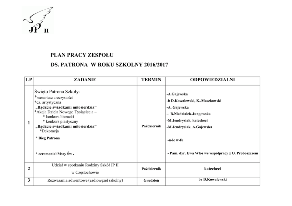 PLAN PRACY ZESPOŁU DS. PATRONA W ROKU SZKOLNY 2016/2017 LP ZADANIE TERMIN Święto Patrona Szkoły*scenariusz uroczystości 1 *cz. artystyczna „Bądźcie świadkami miłosierdzia” *Akcja Dzieła Nowego Tysiąclecia – * konkurs literacki * konkurs plastyczny „Bądźcie świadkami miłosierdzia” *Dekoracja -A.Gajewska -b D.Kowalewski, K..Maszkowski -A. Gajewska – B.Niedziałek-Jungowska -M.Jendrysiak, katecheci Październik * Bieg Patrona 3 -M.Jendrysiak, A.Gajewska -n-le w-fu - Pani. dyr. Ewa Włos we współpracy z O. Proboszczem * ceremoniał Mszy Św . 2 ODPOWIEDZIALNI Udział w spotkaniu Rodziny Szkół JP II w Częstochowie Rozważania adwentowe (radiowęzeł szkolny) Październik katecheci Grudzień br D.Kowalewski 4 5 6 I semestr A.Kasperczyk Całoroczne promowanie cytatów – nauczania Papieża Cały rok K. Maszkowski Polaka szkolny Konkurs pięknego czytania poezji Jana Pawła II Projekcja polskiego filmu fabularnego o Patronie uczniom gimnazjum w ramach II semestr -A. Gajewska zastępstw w bibliotece i czytelni Zorganizowanie i przeprowadzenie 7 IX Międzyszkolnego Konkursu Papieskiego 8 Zorganizowanie wycieczki szkolnej do Rzymu -K. Maszkowski Maj Czerwiec -A. Gajewska M.Jendrysiak Przewodnicząca: Alina Gajewska