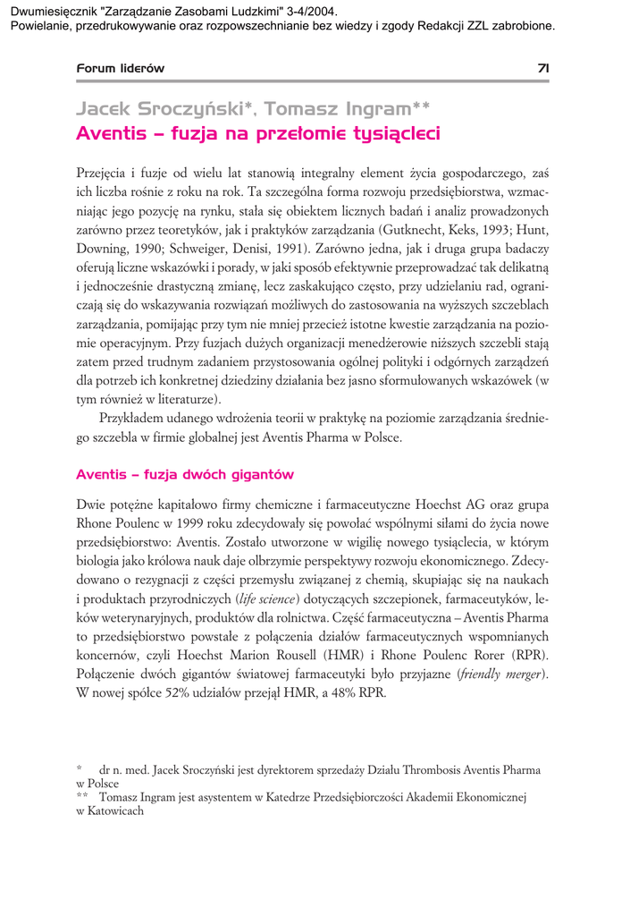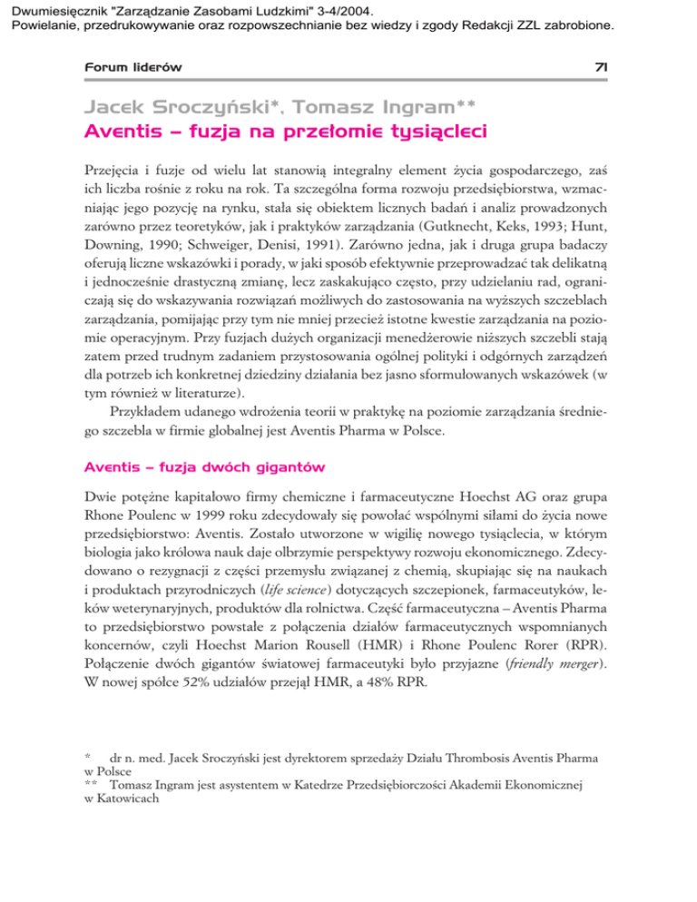 Jacek Sroczyński*, Tomasz Ingram** Aventis – fuzja na