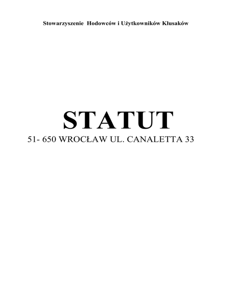 Stowarzyszenie Hodowców i Użytkowników Kłusaków STATUT 51- 650 WROCŁAW UL. CANALETTA 33 I. Postanowienia ogólne §1 1. Nazwa Stowarzyszenia brzmi : Stowarzyszenie Hodowców i Użytkowników Kłusaków i w dalszej części statutu zwane jest Stowarzyszeniem. 2. Siedzibą Stowarzyszenia jest Wrocław, ul. Canaletta 33. 3. Terenem działania Stowarzyszenia jest obszar Rzeczpospolitej Polskiej i zagranica. 4. Stowarzyszenie może tworzyć oddziały terenowe. 5. Stowarzyszenie posiada osobowość prawną. 6. Stowarzyszenie działa na podstawie obowiązującego prawa o Stowarzyszeniach i na podstawie niniejszego statutu. 7. Stowarzyszenie używa pieczęci okrągłej z nazwą, logo i adresem oraz prostokątnej z nazwą, adresem, numerami KRS, NIP i REGON. 8. Stowarzyszenie może posiadać odznakę członkowską i honorową na podstawie obowiązujących w tym zakresie przepisów prawa. 9. Stowarzyszenie może być członkiem krajowych i zagranicznych organizacji o tym samym lub podobnym zakresie i celach działania o ile pozwalają na to odpowiednie przepisy. §2 Stowarzyszenie jest dobrowolnym , samorządnym trwałym zrzeszeniem w celach niezarobkowych . §3 Stowarzyszenie opiera swą działalność na pracy społecznej, do prowadzenia swych spraw może zatrudnić pracowników. II. Cele stowarzyszenia i sposoby ich realizacji §4 Celem Stowarzyszenia jest : 1. Wprowadzanie do Polski i rozpowszechnianie hodowli koni rasy kłusak. 2. Wprowadzenie do Polski i rozpowszechnienie wyścigów kłusaków jako dyscypliny sportowej. 3. Zabezpieczenie infrastruktury niezbędnej do przeprowadzania wyścigów kłusaków w tym budowa torów. 4. Organizowanie wyścigów kłusaków stanowiących niezbędny element oceny wartości użytkowej i hodowlanej kłusaków. §5 Stowarzyszenie realizuje swoje cele przez : 1. Działanie formalno – prawne zmierzające do uzyskania rozwiązań Systemowych korzystnych dla hodowli kłusaków w Polsce. 2. Prowadzenie Polskiej Księgi Stadnej Kłusaków. 3. Reprezentowanie wspólnych interesów członków Stowarzyszenia w obszarach działania określonych w § 1 statutu w stosunku do organizacji , władz państwowych oraz środków przekazu. 4. Propagowanie hodowli koni rasy kłusak przeznaczonych do wyścigów sportowych w kraju i zagranicą. 5. Udzielanie hodowcom i użytkownikom kłusaków wszechstronnej pomocy fachowej w zakresie hodowli i użytkowania kłusaków. 6. Udzielanie pomocy w nabyciu sprzętu wymaganego w treningu i wyścigach kłusaków. 7. Promowanie wyścigów kłusaków oraz zawodów sportowych i imprez rekreacyjnych z udziałem kłusaków. 8. Prowadzenie działalności popularyzującej cele działalności Stowarzyszenia. 9. Prowadzenie własnej działalności gospodarczej : - Stowarzyszenie może prowadzić własną działalność gospodarczą według ogólnych zasad określonych w odrębnych przepisach. - Dochód z działalności gospodarczej Stowarzyszenia służy realizacji celów statutowych i nie może być przeznaczony do podziału między jego członków. 10. Dysponowanie darowiznami rzeczowymi i finansowymi od darczyńców krajowych i zagranicznych przeznaczając je, w zależności od woli darczyńcy na: 1) nagrody w próbach dzielności koni (wyścigi), 2) pokrycie kosztów organizacji wyścigów oraz imprez pokazowych z udziałem koni rasy kłusak, 3) pokrycie kosztów szkoleń dla powożących i trenerów, 4) wspieranie hodowli koni rasy kłusak, 5) finansowanie innych działań wynikających z pragr.4. 11. Praktyczną realizację wypłat środków pieniężnych na cele, o których mowa w pkt. 10. 12. Współpracę z krajowymi i zagranicznymi Stowarzyszeniami o podobnym charakterze i wymianę informacji z nimi. III. Członkostwo, prawa i obowiązki członków. §6 1. Członkami Stowarzyszenia mogą być z zastrzeżeniem ustępu 2 i 3 obywatele polscy, mający pełną zdolność do czynności prawnych i nie pozbawieni praw publicznych. 2. Członkami Stowarzyszenia mogą być również małoletni w wieku od 16 do 18 lat, którzy mają ograniczoną zdolność do czynności prawnych. Osoby te korzystają z czynnego i biernego prawa wyborczego, z tym, że w składzie Zarządu Stowarzyszenia większość stanowią osoby o pełnej zdolności do czynności prawnych. 3. Członkami Stowarzyszenia mogą być również cudzoziemcy, mający jak i nie mający zamieszkania na terytorium Rzeczpospolitej Polskiej – zgodnie z zasadami obowiązującymi obywateli polskich. 4. Członkami wspierającymi mogą być osoby prawne, gotowe wspierać działalność Stowarzyszenia i realizujące swoje prawa i obowiązki za pośrednictwem pełnomocnych obywateli. 5. Członkami honorowymi mogą być osoby fizyczne, które położyły wybitne zasługi w dziedzinach objętych zakresem działania Stowarzyszenia. §7 1. Założyciele Stowarzyszenia z chwilą jego zarejestrowania stają się członkami Stowarzyszenia. 2. Osoby ubiegające się o przyjęcie na członka Stowarzyszenia składają do Zarządu deklarację przystąpienia do Stowarzyszenia. Zarząd podejmuje uchwałę w sprawie przyjęcia na członka Stowarzyszenia w ciągu miesiąca od daty złożenia deklaracji przystąpienia na członka i zawiadamia zainteresowanego o treści uchwały. 3. Godność członka honorowego nadaje Walne Zebranie Członków na wniosek Zarządu. §8 Utrata członkostwa w Stowarzyszeniu następuje w przypadkach : 1. Zrzeczenia się członkostwa. 2. Wykluczenia z listy członków. 3. Śmierci członka. §9 1. Członek Stowarzyszenia może w każdym czasie zrzec się członkostwa. 2. W przypadku zrzeczenia się członkostwa Zarząd skreśla członka z listy członków. 3 .Wykluczenie przez Zarząd z listy członków następuje w przypadkach: - działania członka na szkodę Stowarzyszenia, - uporczywego naruszania statutu i uchwał Organów Stowarzyszenia, - po roku niepłacenia składek i dwukrotnym upomnieniu. 4. Odwołanie od uchwały o wykluczeniu z listy członków może wykluczany