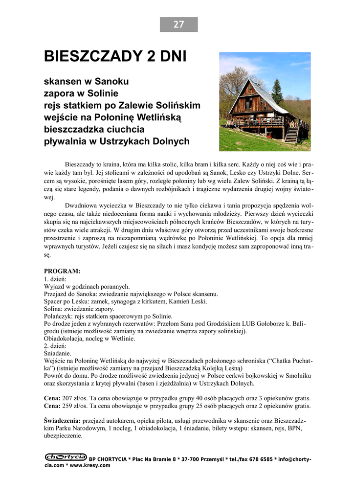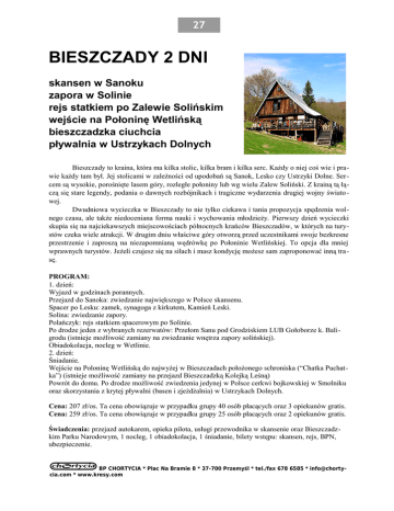 27 BIESZCZADY 2 DNI skansen w Sanoku zapora w Solinie rejs statkiem po Zalewie Solińskim wejście na Połoninę Wetlińską bieszczadzka ciuchcia pływalnia w Ustrzykach Dolnych Bieszczady to kraina, która ma kilka stolic, kilka bram i kilka serc. Każdy o niej coś wie i prawie każdy tam był. Jej stolicami w zależności od upodobań są Sanok, Lesko czy Ustrzyki Dolne. Ser cem są wysokie, porośnięte lasem góry, rozległe połoniny lub wg wielu Zalew Soliński. Z krainą tą łączą się stare legendy, podania o dawnych rozbójnikach i tragiczne wydarzenia drugiej wojny świato wej. Dwudniowa wycieczka w Bieszczady to nie tylko ciekawa i tania propozycja spędzenia wolnego czasu, ale także niedoceniana forma nauki i wychowania młodzieży. Pierwszy dzień wycieczki skupia się na najciekawszych miejscowościach północnych krańców Bieszczadów, w których na turystów czeka wiele atrakcji. W drugim dniu właściwe góry otworzą przed uczestnikami swoje bezkresne przestrzenie i zaproszą na niezapomnianą wędrówkę po Połoninie Wetlińskiej. To opcja dla mniej wprawnych turystów. Jeżeli czujesz się na siłach i masz kondycję możesz sam zaproponować inną tra sę. PROGRAM: 1. dzień: Wyjazd w godzinach porannych. Przejazd do Sanoka: zwiedzanie największego w Polsce skansenu. Spacer po Lesku: zamek, synagoga z kirkutem, Kamień Leski. Solina: zwiedzanie zapory. Polańczyk: rejs statkiem spacerowym po Solinie. Po drodze jeden z wybranych rezerwatów: Przełom Sanu pod Grodziskiem LUB Gołoborze k. Baligrodu (istnieje możliwość zamiany na zwiedzanie wnętrza zapory solińskiej). Obiadokolacja, nocleg w Wetlinie. 2. dzień: Śniadanie. Wejście na Połoninę Wetlińską do najwyżej w Bieszczadach położonego schroniska (“Chatka Puchatka”) (istnieje możliwość zamiany na przejazd Bieszczadzką Kolejką Leśną) Powrót do domu. Po drodze możliwość zwiedzenia jedynej w Polsce cerkwi bojkowskiej w Smolniku oraz skorzystania z krytej pływalni (basen i zjeżdżalnia) w Ustrzykach Dolnych. Cena: 207 zł/os. Ta cena obowiązuje w przypadku grupy 40 osób płacących oraz 3 opiekunów gratis. Cena: 259 zł/os. Ta cena obowiązuje w przypadku grupy 25 osób płacących oraz 2 opiekunów gratis. Świadczenia: przejazd autokarem, opieka pilota, usługi przewodnika w skansenie oraz Bieszczadzkim Parku Narodowym, 1 nocleg, 1 obiadokolacja, 1 śniadanie, bilety wstępu: skansen, rejs, BPN, ubezpieczenie. BP CHORTYCIA * Plac Na Bramie 8 * 37-700 Przemyśl * tel./fax 678 6585 * [email protected] * www.kresy.com