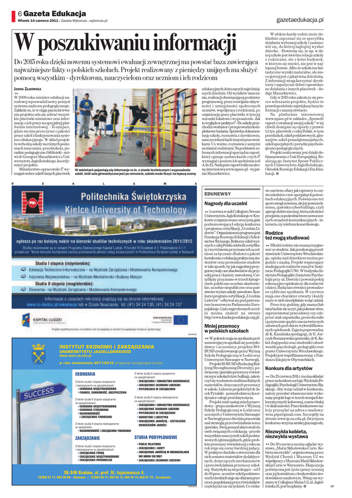 6 Gazeta Edukacja gazetaedukacja.pl Wtorek 14 czerwca 2011 Gazeta Wyborcza wyborcza.pl + + W poszukiwaniu informacji JANINA ZŁAKOWSKA W 2009 roku minister edukacji narodowej wprowadził nowy pomysł systemu nadzoru pedagogicznego. Zakłada on, że w ciągu pięciu lat trwania projektu uda się zebrać wszystkie placówki oświatowe oraz informacje o ich pracy na specjalnej platformie internetowej. – To miejsce, gdzie można przeczytać o jakości pracy szkół i funkcjonowania systemu edukacyjnego. W skład projektu wchodzą szkoły na różnych poziomach nauczania, przedszkola, poradnie pedagogiczne i biblioteki – mówi dr Grzegorz Mazurkiewicz z Uniwersytetu Jagiellońskiego, koordynator projektu. Ministerstwo opracowało 17 wymagań wobec szkół iinnych placówek R E ŁUKASZ CYNALEWSKI Do 2015 roku dzięki nowemu systemowi ewaluacji zewnętrznej ma powstać baza zawierająca najważniejsze fakty o polskich szkołach. Projekt realizowany z pieniędzy unijnych ma służyć pomocą wszystkim – dyrektorom, nauczycielom oraz uczniom i ich rodzicom W ankietach pojawiają się informacje m.in. o stanie technicznym i wyposażeniu szkół. Jeśli sala gimnastyczna jest po remoncie, szkoła może liczyć na lepszą ocenę K L A M edukacyjnych dotyczących najróżniejszych dziedzin. Od wyników nauczania, realizacji obowiązującej podstawy programowej, przez rozwijanie aktywności i umiejętności społecznych uczniów, współpracę z rodzicami, po organizację pracy placówki, w tym jej warunki lokalowe i wyposażenie. Jak to wygląda wpraktyce? – Do szkoły przychodzi ewaluator iprzeprowadza kompleksowe badania. Sprawdza dokumentację szkoły, rozmawia z dyrektorem, nauczycielami bądź innymi pracownikami. Co ważne, rozmawia z samymi uczniami irodzicami. Na podstawie zebranych informacji sporządza raport, który opisuje osobno każde z tych 17 wymagań i poziom ich spełnienia (od Ado E). Następnie raport trafia na stronę internetową www.npseo.pl – wyjaśnia Mazurkiewicz. A EDUNEWSY Nagrody dla uczelni 1 czerwca wauli Collegium Novum Uniwersytetu Jagiellońskiego w Krakowie zorganizowano uroczystą galę podsumowującą I edycję konkursu i programu certyfikacji „Uczelnia Liderów”. Organizatorem programu jest Fundacja Rozwoju Edukacji i Szkolnictwa Wyższego. Rektorzy szkół wyższych zcałej Polski odebrali certyfikaty iwyróżnienia przyznane ich uczelniom za łączenie dbałości o jakość kształcenia zedukacją praktyczną studentów oraz prowadzenie studiów w taki sposób, by jak najpełniej przygotowywały one absolwentów do przyszłej pracy i kariery zawodowej. Certyfikaty przyznano w trzech kategoriach: publiczne uczelnie akademickie, uczelnie niepubliczne oraz państwowe wyższe szkoły zawodowe. Konkurs i program certyfikacji „Uczelnia Liderów” odbywał się pod patronatem honorowym Parlamentu Europejskiego. Listę nagrodzonych uczelni można znaleźć na stronie http://www.fundacja-edukacja.org.pl/. Mniej przemocy w polskich szkołach 30836992 INSTYTUT EKONOMII I ZARZĄDZANIA UNIWERSYTETU JAGIELLOŃSKIEGO www.econ.uj.edu.pl w roku akademickim 2011/2012 proponuje następujące studia: EKONOMIA 3-letnie studia I stopnia stacjonarne i niestacjonarne na specjalnościach: l EKONOMIA MIĘDZYNARODOWA l FINANSE, BANKOWOŚĆ, UBEZPIECZENIA 2-letnie studia II stopnia stacjonarne na specjalnościach: l EKONOMIA MIĘDZYNARODOWA l EKONOMIA STOSOWANA l RACHUNKOWOŚĆ I ZARZĄDZANIE FINANSAMI 2-letnie studia II stopnia niestacjonarne na specjalności: l RACHUNKOWOŚĆ I ZARZĄDZANIE FINANSAMI ZARZĄDZANIE 2-letnie studia II stopnia stacjonarne na specjalnościach: l ZARZĄDZANIE I DORADZTWO GOSPODARCZE l ZARZĄDZANIE ZASOBAMI LUDZKIMI l PSYCHOLOGIA W ZARZĄDZANIU 2-letnie studia II stopnia niestacjonarne na specjalnościach: l ZARZĄDZANIE I DORADZTWO GOSPODARCZE l ZARZĄDZANIE ZASOBAMI LUDZKIMI l PSYCHOLOGIA W ZARZĄDZANIU l MARKETING I LOGISTYKA l ZARZĄDZANIE JAKOŚCIĄ – KSZTAŁCENIE MENEDśERÓW JAKOŚCI STUDIA PODYPLOMOWE PUBLIC RELATIONS ZARZĄDZANIE I AUDYT ZARZĄDZANIE JAKOŚCIĄ W ORGANIZACJACH WG NORM ISO 9001 l ZARZĄDZANIE ZASOBAMI LUDZKIMI l 3-letnie studia I stopnia stacjonarne i niestacjonarne na specjalnościach: l ZARZĄDZANIE FIRMĄ l ZARZĄDZANIE MIĘDZYNARODOWE l ZARZĄDZANIE PERSONELEM W efekcie każdy rodzic może dokład nie za poz nać się ze spe cy fi ką działania wybranej szkoły i zastanowić się, do któ rej naj le piej wysłać dziecko. – Dowiemy się, że np. w danej szkole jest świetna relacja szkoły z ro dzi ca mi, ale z ko lei bu dy nek, w którym się mieści, nie jest w najlepszej formie. Albo że szkoła ma fantastyczne wyniki maturalne, ale nieco gorzej jest z jakąś inną dziedziną. Z informacji mogą korzystać dyrektorzy i zapożyczać dobre i sprawdzone działania z innych placówek – dodaje Mazurkiewicz. Gdy w 2015 roku zakończy się proces wdra ża nia pro jek tu, bę dzie to prawdopodobnie największa baza informacji o naszej oświacie. Na plat for mie in ter ne towej www.npseo.pl w zakładce „Sprawdź raport z ewaluacji swojej szkoły” w tej chwili dostępne są raporty z prawie 1,3 tys. placówek z całej Polski, w tym przedszkoli, szkół podstawowych, gimnazjów, szkół ponadgimnazjalnych, szkół specjalnych i poradni psychologiczno-pedagogicznych. Projekt realizowany jest dzięki dofinansowaniu z Unii Europejskiej. Realizują go: Instytut Spraw Publicznych Uniwersytetu Jagiellońskiego, Ośrodek Rozwoju Edukacji i Era Ewaluacji. f l l 30-348 Kraków, ul. prof. St. Łojasiewicza 4, 12/664 57 77, 664 56 80 – Ekonomia | 12/664 55 71, 664 55 72, 664 55 74, 664 57 79 - Zarządzanie 30853845 Wpołowie maja na spotkaniu podsumowującym spotkali się pomysłodawcy i uczestnicy projektu ROBUSD zrealizowanego przez Wyższą Szkołę Pedagogiczną w Łodzi oraz Uniwersytet Stavanger w Norwegii. Projekt ROBUSD (Reducing Bullying Strenghtening Diversity), poświęcony zjawisku przemocy rówieśniczej ws
