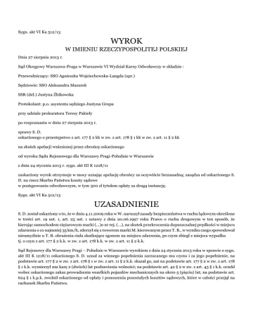 Sygn. akt VI Ka 512/13 WYROK W IMIENIU RZECZYPOSPOLITEJ POLSKIEJ Dnia 27 sierpnia 2013 r. Sąd Okręgowy Warszawa-Praga w Warszawie VI Wydział Karny Odwoławczy w składzie : Przewodniczący: SSO Agnieszka Wojciechowska-Langda (spr.) Sędziowie: SSO Aleksandra Mazurek SSR (del.) Justyna Żbikowska Protokolant: p.o. asystenta sędziego Justyna Grupa przy udziale prokuratora Teresy Pakieły po rozpoznaniu w dniu 27 sierpnia 2013 r. sprawy S. D. oskarżonego o przestępstwo z art. 177 § 2 kk w zw. z art. 178 § 1 kk w zw. z art. 11 § 2 kk na skutek apelacji wniesionej przez obrońcę oskarżonego od wyroku Sądu Rejonowego dla Warszawy Pragi-Południe w Warszawie z dnia 24 stycznia 2013 r. sygn. akt III K 1218/11 zaskarżony wyrok utrzymuje w mocy uznając apelację obrońcy za oczywiście bezzasadną; zasądza od oskarżonego S. D. na rzecz Skarbu Państwa koszty sądowe w postępowaniu odwoławczym, w tym 300 zł tytułem opłaty za drugą instancję. Sygn. akt VI Ka 512/13 UZASADNIENIE S. D. został oskarżony o to, że w dniu 4.11.2009 roku w W. naruszył zasady bezpieczeństwa w ruchu lądowym określone w treści art. 19 ust. 1, art. 25 ust. 1 ustawy z dnia 20.06.1997 roku Prawo o ruchu drogowym w ten sposób, że kierując samochodem ciężarowym marki (...)o nr rej. (...), na skutek przekroczenia dopuszczalnej prędkości w miejscu zdarzenia o co najmniej 35 km/h, zderzył się z rowerem marki M. kierowanym przez T. B., w wyniku czego spowodował nieumyślnie u T. B. obrażenia ciała skutkujące zgonem na miejscu zdarzenia, po czym zbiegł z miejsca wypadku tj. o czyn z art. 177 § 2 k.k. w zw. z art. 178 k.k. w zw. z art. 11 § 2 k.k. Sąd Rejonowy dla Warszawy Pragi – Południe w Warszawie wyrokiem z dnia 24 stycznia 2013 roku w sprawie o sygn. akt III K 1218/11 oskarżonego S. D. uznał za winnego popełnienia zarzucanego mu czynu i za jego popełnienie, na podstawie art. 177 § 2 w zw. z art. 178 § 1 w zw. z art. 11 § 2 k.k. skazał go, zaś na podstawie art. 177 § 2 w zw. z art. 178 § 1 k.k. wymierzył mu karę 2 (dwóch) lat pozbawienia wolności; na podstawie art. 42 § 2 w zw. z art. 43 § 1 k.k. orzekł wobec oskarżonego zakaz prowadzenia wszelkich pojazdów mechanicznych na okres 5 (pięciu) lat; na podstawie art. 624 § 1 k.p.k. zwolnił oskarżonego od opłaty i ponoszenia pozostałych kosztów sądowych, które w całości przejął na rachunek Skarbu Państwa. Od powyższego wyroku apelację wniósł obrońca oskarżonego, zaskarżając wyrok w części dotyczącej kary. Na podstawie art. 427 § 2 k.p.k. oraz art. 438 pkt 4 k.p.k. obrońca zarzucił rażącą niewspółmierność kary orzeczonej wyrokiem Sądu Rejonowego wobec oskarżonego, polegającą na wymierzeniu mu kary bezwzględnego pozbawienia wolności w wymiarze 2 lat, przy prawidłowym ustaleniu stanu faktycznego w zakresie znacznego przyczynienia się pokrzywdzonego do zaistnienia wypadku poprzez wymuszenia pierwszeństwa przejazdu, co w zestawieniu z innymi okolicznościami popełnienia czynu także tymi, które obciążają oskarżonego daje podstawy do wymierzenia mu kary pozbawienia wolności z warunkowym zawieszeniem jej wykonania. Obrońca wniósł o zmianę zaskarżonego orzeczenia poprzez orzeczenie wobec oskarżonego kary pozbawienia wolności w wymiarze lat 2 wraz z warunkowym zawieszeniem jej wykonania w wymiarze 5 lat próby, zakazu prowadzenia wszelkich pojazdów mechanicznych na okres 8 lat, nawiązkę na rzecz osób pokrzywdzonych w wysokości 10 000 zł płatną w terminie 3 miesięcy od dnia uprawomocnienia się wyroku, obciążenia kosztami postępowania, świadczenie pieniężne na rzecz ofiar wypadków drogowych w wysokości 2000 zł. Sąd okręgowy, zważył co następuje: Apelacja obrońcy oskarżonego jest oczywiście bezzasadna i tym samym nie zasługuje na uwzględnienie. W pierwszym rzędzie podnieść trzeba, że sąd rejonowy przeprowadził w sprawie niniejszej prawidłowe postępowanie dowodowe dążąc do wyjaśnienia wszystkich istotnych dla rozstrzygnięcia okoliczności, zebrane dowody poddał analizie zgodnej z regułami art. 7 kpk i na tej podstawie wyprowadził zasadny wniosek co do winy oskarżonego w zakresie przypisanego mu czynu. Ustalenia faktyczne poczynione przez sąd I instancji znajdują pełne oparcie w ujawnionym w toku przewodu sądowego materiale dowodowym, a w ich świetle wina i kwalifikacja prawna przypisanego oskarżonemu czynu nie budzą wątpliwości. Natomiast przechodząc do apelacji obrońcy nie sposób – w świetle zawartej w niej argumentacji – zgodzić się z poglądem, że orzeczona kara pozbawienia wolności jest rażąco niewspółmierna do stopnia zawinienia i charakteru popełnionego przez oskarżonego czynu. Niewątpliwie w sprawie niniejszej bezpośrednią przyczyną zaistnienia wypadku było nieprawidłowe postępowanie pokrzywdzonego rowerzysty, który nie ustąpił pierwszeństwa kierującemu oskarżonemu. Niemniej jednak w realiach sprawy niniejszej okoliczność ta nie może – jak chce tego skarżący - skutkować warunkowym zawieszeniem wykonania orzeczonej kary 2 lat pozbawienia wolności. Nie można bowiem zapominać, że gdyby oskarżony znacznie nie przekroczył dopuszczalnej prędkości to do wypadku by nie doszło, co jednoznacznie wynika ze sporządzonych w sprawie opinii. Jednocześnie trzeba mieć na uwadze całokształt ustalonego zachowania oskarżonego, który z pełną świadomością kierował samochodem nie mając do tego uprawnień, a co istotniejsze zbiegł z miejsca zdarzenia w celu uniknięcia odpowiedzialności karnej. W kontekście tej ostatniej okoliczności nie sposób podzielić zaprezentowanej w apelacji argumentacji usprawiedliwiającej takie zachowanie oskarżonego. Słusznie sąd rejonowy podniósł, że natychmiastowe zwiększenie prędkości, kluczenie mniejszymi uliczkami, a w końcu porzucenie pojazdu świadczą o celowym, przemyślanym działaniu oskarżonego nastawionym na uniknięci