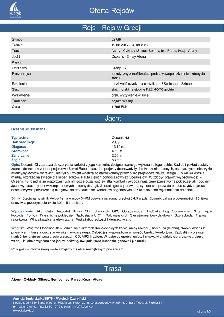 Oferta Rejsów Rejs - Rejs w Grecji Symbol 02 GR Termin 19.08.2017 - 26.08.2017 Trasa Ateny - Cyklady (Sifnos, Serifos, Ios, Paros, Kea) - Ateny Jacht Oceanis 43 - s/y Atena Kapitan Opis ceny Grecja, GT Rodzaj rejsu turystyczny z możliwością podstawowego szkolenia i zdobycia stażu Szkolenie możliwość uzyskania certyfikatu ISSA Inshore Skipper Staż staż morski na stopnie PZŻ, 40-70 godzin Wyżywienie brak, wyżywienie własne Transport dojazd własny Cena 1 795 PLN Jacht Oceanis 43 s/y Atena Typ jachtu: Oceanis 43 Rok produkcji: 2009 Długość: 13.10 m Szerokość: 4.12 m Zanurzenie: 2.00 m Żagle: 83 m2 Opis: Oceanis 43 zaprasza do czerpania radości z jego komfortu, designu i samego wykonania tego jachtu. Kadłub i pokład zostały zaprojektoane przez biuro projektowe Berret Racoupeau. Ich projekty doprowadziły do stworzenia mocnych, estetycznych i niezwykle atrakcyjny jachtów morskich i nie tylko. Projekt wnętrza został wykonany przez biuro projektowe Nauta Design. To wielka włoska marka, wzorzec na świecie dla super jachtów. Nauta Design pomogła również Oceanis-owi 43 zdobyć prawdziwą osobowość – Oceanis 43 to jedna ze współczesnych linii gdzie duża ilość światła, komfort i wygoda mają pierwszeństwo na pokładzie jak i pod nim. Jacht wyposażony jest w komplet nowych i mocnych żagli. Genual i grot są rolowane, system ten pozwala bardzo szybko i prosto dostosowywać powierzchnię ożaglowania do aktualnych warunków pogodowych bez konieczności wychodzenia na dziób. Silnik: Stacjonarny silnik Volvo-Penta o mocy 54KM pozwala osiągnąć prędkość 4.5 węzła. Zbiornik paliwa o pojemności 120 litrów umożliwia przepłynięcie około 300 mil morskich. Wyposażenie: Akumulator Autopilot Bimini CD Echosonda GPS Gorąca woda Lodówka Log Ogrzewanie Ploter map w kokpicie Ponton Prysznic na pokładzie Radiostacja UKF Rolowany grot Ster strumieniowy dziobowy Szprycbuda Tratwa ratunkowa Winda kotwiczna elektryczna Wskaźnik prędkości i kierunku wiatru Wnętrze: Wnętrze Oceanisa 43 składaja się z czterech dwuosobowych kabin, mesy (salonu), kambuza (kuchni), dwóch łazienk z prysznicem i toaletą oraz stanowiska nawigacyjnego. Całość jest wyposażona w sposób bardzo komfortowy. Zadbaliśmy o system nagłośnienia stereo wraz z odtwarzaczem CD, MP3 i radiem. W łazience oprócz toalety i umywalki znajduje się prysznic z ciepłą wodą. . Kuchnia wyposażona jest w lodówkę, dwupalnikową kuchenkę gazową i piekarnik. Po kąpieli w morzu słoną wodę zmyjemy z siebie zewnętrznym prysznicem. Trasa Ateny - Cyklady (Sifnos, Serifos, Ios, Paros, Kea) - Ateny Agencja Żeglarska KUBRYK - Wojciech Czerwiński siedziba: 05 - 830 Stara Wieś, ul. Piękna 21, biuro i adres korespondencyjny: 05 - 830 Stara Wieś, ul. Piękna 21 tel.: 22 810 00 42, fax: 22 201 07 38, email: [email protected] www.kubryk.pl strona 1/3 Oferta Rejsów Archipelag Cyklad to kwintesencja wyobrażeń o Grecji. Pomalowane na biało domy, od których oślepiająco odbija się jasne słońce, niebieskie okiennice, delikatny ciepły wiatr, lazurowe morze, piękne plaże, towarzyscy ludzie, małe wąskie uliczki, w których labiryncie czuć zapach cudownego greckiego jedzenia to tylko pobieżny opis tego, co czeka nas podczas rejsu w Grecji. Wyspy Wiatrów to najsłynniejszy i najpiękniejszy archipelag morza Egejskiego składający się z 33 zamieszkanych wysp i kilkuset mniejszych wysepek. Rejs w Grecji to doskonały sposób na odpoczynek od codzienności, to możliwość obcowania na namacalną starożytną historią i kulturą oraz szansa na zdobycie stażu żeglarskiego. Grecja oferuje malownicze wyspy z bogatą infrastrukturą, oraz bezludne wysepki z bajecznymi zatoczkami, w których kotwicząc można poczuć się jak w raju, poza czasem i rzeczywistością. Tygodniowy rejs w Grecji to niezapomniany urlop, podczas którego mają Państwo możliwość dotarcia do miejsc dostępnych jedynie z pokładu jachtu. „Ios, Sikinos, Serifos, Milos – każde to słowo jest jak jaskółka przynosząca wiosnę w środku lata”, czy w słowach greckiego poety Odidras Elitis jest prawda, najlepiej sprawdzić samemu. Ateny – miasto ogromne, oszałamiające, ekscytujące, potrafiące zachwycić i zmęczyć, miasto, któremu warto poświęcić dzień lub dwa w drodze na wyspy. Sinfos – drzewa oliwne, bugenwille i krzewy jałowca przygięte fantazyjnie przez wiatr nadają jej miano najbardziej zielonej wyspy Cyklad. Wąskie wejście do zatoki prowadzące do Kamares tworzą dwa górskie grzbiety, które wyglądają jak dinozaury, odwrócone do siebie plecami, nieświadome swojego istnienia. Sinfos słynie z ceramiki, głównie z prostych naczyń codziennego użytku, produkowanych z szarej i czerwonej gliny według tradycyjnych wzorów. Serifos – w portowym Livadi można miło i przyjemnie spędzić czas tawernach i na plaży. Powyżej króluje Chora miasto malowniczo przyklejone do górskich zboczy, do którego możemy dojechać autobusem lub podejść kamiennymi schodami. Ios – tutejszy port należy do najbardziej malowniczych na Morzu Egejskim. Położonej na wzgórzu Chorze, głównej miejscowości wyspy, w której toczy się zarówno życie dzienne, jak i nocne, uroku dodaje wiatrak i błękitne kopuły dwóch bizantyjskich Cerkwi. Paros – wyspa ta łączy w sobie wszystkie zalety Grecji: fantastyczne plaże, bujne życie nocne, przepiękne krajobrazy, tradycyjną grecką zabudowę, zabytkowe kościoły, klasztory. Kea – słynie z pięknych starych dębów oraz uprawianych tu migdałów. Na przylądku Kefala odkryto najstarszą osadę neolityczną na Cykladach, a w Otazias na północy można odpocząć na pięknych plażach. Informacje Cena: 1 795 PLN dojazd własny Bezpośrednie połączenia lotnicze z Warszawy do Aten oferują Aegan Air oraz RYANAIR. Z międzynarodowego lotniska w Atenach do mariny można dostać się autobusem komunikacji miejskiej linii X96. Przejazd trwa 
