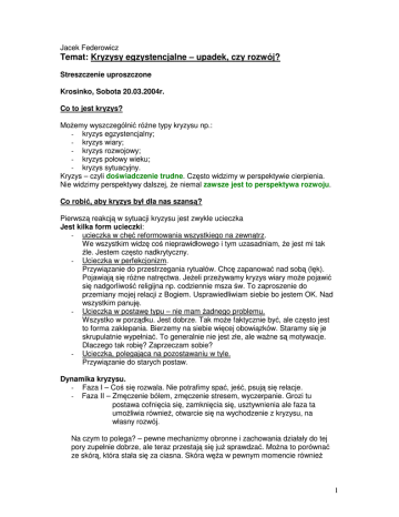 Jacek Federowicz Temat: Kryzysy egzystencjalne – upadek, czy rozwój? Streszczenie uproszczone Krosinko, Sobota 20.03.2004r. Co to jest kryzys? Możemy wyszczególnić różne typy kryzysu np.: - kryzys egzystencjalny; - kryzys wiary; - kryzys rozwojowy; - kryzys połowy wieku; - kryzys sytuacyjny. Kryzys – czyli doświadczenie trudne. Często widzimy w perspektywie cierpienia. Nie widzimy perspektywy dalszej, że niemal zawsze jest to perspektywa rozwoju. Co robić, aby kryzys był dla nas szansą? Pierwszą reakcją w sytuacji kryzysu jest zwykle ucieczka Jest kilka form ucieczki: - ucieczka w chęć reformowania wszystkiego na zewnątrz. We wszystkim widzę coś nieprawidłowego i tym uzasadniam, że jest mi tak źle. Jestem często nadkrytyczny. - Ucieczka w perfekcjonizm. Przywiązanie do przestrzegania rytuałów. Chcę zapanować nad sobą (lęk). Pojawiają się różne natręctwa. Jeżeli przeżywamy kryzys wiary może pojawić się nadgorliwość religijna np. codziennie msza św. To zaproszenie do przemiany mojej relacji z Bogiem. Usprawiedliwiam siebie bo jestem OK. Nad wszystkim panuję. - Ucieczka w postawę typu – nie mam żadnego problemu. Wszystko w porządku. Jest dobrze. Tak może faktycznie być, ale często jest to forma zaklepania. Bierzemy na siebie więcej obowiązków. Staramy się je skrupulatnie wypełniać. To generalnie nie jest złe, ale ważne są motywacje. Dlaczego tak robię? Zaprzeczam sobie? - Ucieczka, polegająca na pozostawaniu w tyle. Przywiązanie do starych postaw. Dynamika kryzysu. - Faza I – Coś się rozwala. Nie potrafimy spać, jeść, psują się relacje. - Faza II – Zmęczenie bólem, zmęczenie stresem, wyczerpanie. Grozi tu postawa cofnięcia się, zamknięcia się, usztywnienia ale faza ta umożliwia również, otwarcie się na wychodzenie z kryzysu, na własny rozwój. Na czym to polega? – pewne mechanizmy obronne i zachowania działały do tej pory zupełnie dobrze, ale teraz przestają się już sprawdzać. Można to porównać ze skórą, która stała się za ciasna. Skóra węża w pewnym momencie również 1 musi zostać zdarta aby pod nią mogła ukazać się nowa – odpowiednia skóra do nowych wyzwań. Wtedy przeciska się on przez ciernie, aby tą skórę zedrzeć. OK – ale jak reagować prawidłowo, aby wychodzić z kryzysów? Mamy w sobie instynkt zwalczania, wyrzucania, zanegowania czegoś co w sobie mamy, a nie chcemy mieć. - Jeśli pojawia się we mnie uczucie, którego nie akceptuję to szansą jest przyjęcie, zaakceptowanie tego w sobie. Przyznać sobie prawo, że nieakceptowane emocje jeśli się pojawiają, to nie przekreślają mnie w sensie moralnym. - Jeśli próbuję zdławić w sobie to co się we mnie pojawia, wtedy to uczucie staje się silniejsze – to może stać się moim błędnym kołem. Tu pojawiać się mogą różne natręctwa czy nawet spirala zachowań przymusowych. - Jak to zrobić? Jak przyjąć nie akceptowalne uczucia, emocje, pobudzenia seksualne? - W jaki sposób mam sobie pozwolić na istnienie trudnych uczuć? Zobaczenie, że nie jestem za nie odpowiedzialny za ich pojawienie się we mnie. Jeżeli tak, to spróbuję sobie trochę teraz z tym uczuciem pobyć, poprzyglądam się jemu, dam sobie przyzwolenie by pochodzić trochę pobudzonym czy rozedrganym w środku. Nie wystarczy wiedzieć jak wyjść z tej matni. Potrzeba aktu woli, pozwolić aby telepały mną emocje. Tylko jak poradzić sobie np. w pracy? Nasze hamowane emocje i tak udzielą się innym. Jeśli widzimy, że ktoś próbuje zachować wewnętrzny spokój, ale w nim coś buzuje, to w nas to rezonuje. Ważna jest umiejętność pozostawania w tyle - daję sobie czas pozostania z tym. Nie próbuję zdusić w sobie emocji tylko po to by normalnie funkcjonować. Muszę się zatrzymać, pójść na własną wewnętrzną pustynię, pobyć sam ze sobą, poprzyglądać się samemu sobie, potrzebny jest spokój i cisza ale bardziej ta wewnętrzna niż ta zewnętrzna. Musimy dostrzec swój sposób funkcjonowania do tej pory. Chcemy dostrzec swoje winy, oskarżamy się. Musimy się przyznać, że często sami siebie oskarżamy o to co się stało. Możemy pójść za bardzo w poczucie winy. Często w sobie dostrzegamy smutek. Dołuje nas to, że inni sobie świetnie radzą, a my nie. Możemy dojść do wniosku, że ten świat to nie jest miejsce dla nas. <Jacek przyznaje, że czerpie dużo z rekolekcji ignacjańskich> Jesteśmy wychowani w kulturze, która wymusza na nas radzenie sobie samemu ze sobą „weź się w garść” (jest to najbardziej niefortunne twierdzenie). Nie jesteśmy w stanie się sami usprawiedliwić, uzasadnić sensowność swojego istnienia. Nie wystarczy tylko chcieć, choć to ważne. Otworzyć się na to, że Bóg mówi mi, że razem z tymi ułomnościami, tymi cechami, wadami przyjmuje mnie, kocha i jest ze mną – i tylko to mnie usprawiedliwia. Nie zaś to, że ja sam potrafię, muszę, uporam się – to błędna postawa – to postawa pychy. Porozmawiać z kimś, szukać w relacji z kimś – aby się nie usprawiedliwiać samemu, tylko otworzyć się na miłość Boga. Tu ważą się losy dalszego rozwoju lub zastoju. Trzeba umieć zostawić przeszłość i skoncentrować się na umiejętności życia teraz, akcent należy położyć na przeżywanie dnia dzisiejszego - kolejne niebezpieczeństwo, że zacznę myśleć z lękiem o przyszłości. 2 Dlaczego tak jest, że cały czas żyjemy w smutku, myśląc o przeszłości, albo w lęku przed przyszłością? W Judaizmie (Biblia – Stary Testament) którym przesiąknięta jest kultura zachodu nie przeżywa się teraźniejszości, są tu opisy historyczne przeszłości lub proroctwa przyszłości. Przeciwnie bywa w kulturze azjatyckiej – buddyzm. Nie dręczą nas już tak permanentnie emocje. Często jest w tym czynnik mojej winy, ale nie zamierzony. Nie o to chodzi w życiu człowieka, aby być doskonałym, aby zasłużyć sobie by Bóg mni