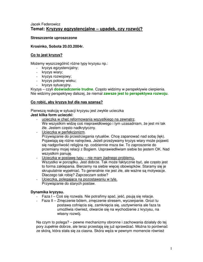 Temat: Kryzysy egzystencjalne – upadek, czy rozwój?