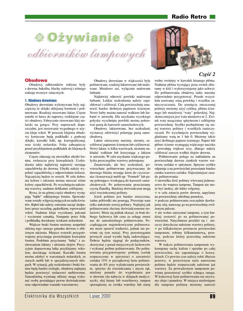 Radio Retro Część 2 Obudowa Obudowy odbiorników robione były z drewna, bakelitu, blachy stalowej i różnego rodzaju tworzyw sztucznych. 1. Obudowa drewniana Obudowy drewniane wykonywane były naj− częściej ze sklejki oklejonej fornirem i poli− turowane. Rzadziej stosowano lakier. Częste usterki to łatwe do naprawy, rozklejone czę− ści obudowy. Fabrycznie stosowano klej sto− larski na gorąco. Przy naprawach dopu− szczalne, jest stosowanie wygodnego w uży− ciu kleju wikol. W procesie klejenia obudo− wy konieczne będą podkładki z grubszej sklejki, kawałki folii, np. kserograficznej, oraz ściski stolarskie. Folia zabezpieczy przed przyklejeniem podkładek do klejonych elementów. Często zdarzają się niewielkie ubytki for− niru, zwłaszcza przy krawędziach. Uszko− dzenia takie najłatwiej naprawić stosując szpachlówkę do drewna. Ubytki należy wy− pełnić szpachlówką o odpowiednim kolorze. Najczęściej będzie to orzech. W celu dobra− nia koloru i odcienia można mieszać różne kolory szpachlówek. Po wyschnięciu nałożo− nej warstwy, nadmiar delikatnie szlifujemy. Bywa, że na górnej części obudowy wystę− pują “bąble” odklejonego forniru. Spowodo− wane zostały wilgocią stojących na radiu kwia− tów. Bąbel taki należy ostrożnie naciąć skalpe− lem i przez szczelinę, pędzelkiem, wprowadzić wikol. Nadmiar kleju wyciskamy palcami i wycierami szmatką. Następnie przez folię i podkładkę dociskamy ściskami stolarskimi. Większe braki forniru możemy uzupełnić okleiną tego samego gatunku drewna o zbli− żonym odcieniu. Miejsce wstawki przygoto− wujemy przycinając prostolinijnie krawędzie forniru. Podobnie przycinamy “łatkę” z za− chowaniem faktury i ułożenia słojów. Precy− zyjnie dopasowaną łatkę przyklejamy wiko− lem, dociskając ściskami. Kawałki forniru można zdobyć w warsztatach stolarskich, ze starych mebli lub w specjalistycznych skle− pach. W sytuacji, gdy uszkodzenie i braki for− niru będą bardzo rozległe, obudowę najlepiej będzie powierzyć stolarzowi meblowemu. Samodzielną wymianę okleiny mogą wyko− nać osoby posiadające pewne doświadczenie oraz odpowiednie warunki warsztatowe. Elektronika dla Wszystkich Obudowy drewniane w większości były politurowane, rzadziej lakierowane lub malo− wane. Metalowe zaś, wyłącznie malowane farbami. Najłatwiej odnowić powłoki malowane farbami. Lekkie uszkodzenia należy szpa− chlować i szlifować. Całą powierzchnię zma− towić bardzo drobnym papierem ściernym. Nowe farby można nanosić wałkiem lub far− bami w aerozolu. Dla uzyskania wysokiego połysku wyschnięte powłoki można polero− wać pastą do karoserii samochodowych. Obudowy lakierowane, bez uszkodzeń, wystarczy odświeżyć polerując pastą samo− chodową. Lakier zniszczony musimy, niestety, ze− szlifować papierem ściernym lub cyklinować. Nowy lakier, w kilku warstwach, możemy na− kładać wałkiem lub korzystając z lakieru w aerozolu. W celu uzyskania większego po− łysku poszczególne warstwy polerujemy. Zmatowiałe, ale bez uszkodzeń, po− wierzchnie politurowane przywracamy do dawnego blasku stosując krem do czyszcze− nia i konserwacji mebli np. “Formeb” lub pa− stę polerująco–woskującą do karoserii samo− chodowych. Po polerowaniu przecieramy czystą flanelką. Bardziej doświadczeni mogą użyć rozcieńczonej politury. Jeżeli politura jest bardzo zniszczona, żadne półśrodki nie pomogą. Pozostaje nam tylko nałożenie nowej politury. Najlepiej jak politurowanie zlecimy doświadczonemu sto− larzowi. Może się jednak okazać, że brak do− brego fachowca lub cena za usługę zmusi nas do samodzielnego politurowania. Po− czątkującym majsterkowiczom politurowa− nie może sprawić trudności, jednak nie po− winni się tym zrażać. Przy przestrzeganiu pewnych zasad wyniki będą zadowalające. Dobrze będzie sięgnąć do podręczników, skorzystać z porad miejscowych fachowców i wykonać próbne politurowanie. Do politu− rowania przygotowujemy: politurę (szelak rozpuszczony w spirytusie) o zawartości szelaku 15% w początkowej fazie polituro− wania do 8% przy wykańczaniu powierzch− ni, spirytus do rozcieńczania i mycia rąk, mielony pumeks do wypełniania por w drewnie (do nabycia w sklepach medycz− nych), olej lniany lub wazelinowy, tampon sporządzony ze zwitka watoliny lub starej wełny owinięty w kawałek lnianego płótna. Nadmiar płótna wystający poza zwitek zbie− ramy w kiść i wykorzystujemy jako uchwyt. Do politurowania obudowę radia musimy odpowiednio przygotować. Przede wszyst− kim usuwamy starą powłokę i wszelkie za− nieczyszczenia. Do usunięcia zniszczonej politury możemy użyć cykliny, płótna ścier− nego lub metalowej “waty” polerskiej. Naj− skuteczniejsza jest wata metalowa nr 2. Zwi− tek waty nasączamy spirytusem i szlifujemy powierzchnię. Szybko pozbędziemy się sta− rej warstwy politury i wszelkich zanieczy− szczeń. Po wyschnięciu powierzchnię wy− gładzamy watą nr 1 lub 0. Możemy także użyć drobnego papieru ściernego. Papier lub płótno ścierne wymagają większego nacisku i powodują większe rysy, dlatego należy szlifować zawsze wzdłuż słojów drewna. Politurowanie polega na nakładaniu na powierzchnię drewna cienkich warstw roz− tworu szelaku w spirytusie. Spirytus szybko odparuje a na powierzchni pozostanie bardzo cienka warstwa szelaku. Najważniejsze zasa− dy politurowania: ❖ niewielka ilość politury wlewanej jednora− zowo do wnętrza tamponu. Tampon nie mo− że być mokry, ale lekko wilgotny, ❖ w celu zatarcia porów drewna, napylamy na powierzchnię odrobinę pumeksu, ❖ podczas politurowania oszczędnie dawku− jemy olej, nanosząc go na powierzchnię zwil− żonym palcem, ❖ nie wolno zatrzymać tamponu, a tym bar− dziej zostawić go na politurowanej po− wierzc