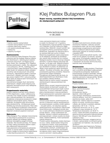 Klej Pattex Butapren Plus Super mocny, wysokiej jakości klej kontaktowy do elastycznych połączeń Karta techniczna nr 06.2005 Właściwości: • bardzo wysoka wytrzymałość • wysoka wytrzymałość na ścinanie • wysoka odporność cieplna • nie zawiera szkodliwego toluenu • elastyczny • odporny na wilgoć Zastosowanie: Klej kontaktowy Pattex Butapren Plus przeznaczony jest do trwałego klejenia materiałów drewnianych z dekoracyjnymi płytami z tworzyw sztucznych, do klejenia gumy, skóry, korka, filcu, twardego PCV, miękkich tworzyw piankowych, metalu. Nie odpowiedni do polistyrenu, PP, PE, miękkiego PCV i sztucznej skóry. Pattex Butapren Plus może także służyć do układania izolacji dźwiękoszczelnej i płyt akustycznych (nie polistyrenowych), odpowiednich płytek z tworzyw sztucznych i okładzin ściennych różnego typu (poza miękkim PCV i sztuczną skórą). Służy także do klejenia taśm fornirowych na krawędziach i łukach. Uszczelnianie brzegów litych elementów drewnianych i sklejek przed wilgocią oraz wpływami atmosferycznymi oraz naklejania taśm izolacyjnych. Przygotowanie materiału: Klejony materiał musi być suchy (drewno 8-12% wilgotności), czysty i odtłuszczony. Laminaty oraz metale oczyścić standardowym rozpuszczalnikiem (np. benzenem). Dodatkowe zmatowienie powierzchni metali zwiększa wytrzymałość spoiny. Klejone materiały, szczególnie płyty laminowane, płyty akustyczne itp., klimatyzować przed obróbką wg instrukcji producenta. Kleić tylko na nie obrabianych podłożach (naturalnych nośnikach). Powierzchnie lakierowane przed klejeniem zmatowić papierem ściernym. Wykonanie: Pattex Butapren Plus nakładać równomiernie na obie klejone powierzchnie za pomocą szpachli zębatej lub krótkiego pędzla. Zwracać szczególną uwagę na brzegi materiału. Nie rozcieńczać kleju. Po nałożeniu kleju należy pozostawić klejone części, aby odparował rozpuszczalnik. Czas parowania w temperaturze pokojowej (18-25 °C) wynosi około 15 minut. Należy zwrócić uwagę na równomierne odparowanie z całej klejonej powierzchni. Po upływie czasu parowania klejenie jest możliwe w czasie nie dłuższym niż 1,5 godziny. Po odparowaniu rozpuszczalnika na powierz chni materiału musi być widoczna ciągła warstwa kleju. Materiał o dużych porach lub szczególnie chłonny posmarować klejem kilkakrotnie. Sygnałem do złączenia jest to, że warstwa kleju jest sucha w dotyku. Starannie przygotować części przeznaczone do sklejania, ponieważ po kontakcie obu warstw kleju korekta jest nie możliwa. Następnie bardzo mocno docisnąć sklejane elementy. O jakości klejenia decyduje siła docisku, a nie jego czas. Większe powierz chnie, płyty laminowane i metale powinny być dociskane w prasie. W zależności od detalu może wystarczyć także dociskanie wałkiem. Dociskać od środka, aby uniknąć powstawania pęcherzy powietrza. Starannie posmarować klejem krawędzie. Początkowa siła klejenia jest tak duża, że detal bezpośrednio po dociśnięciu może być poddany dalszej obróbce. Natychmiast po użyciu czyścić narzędzia standardowymi rozpuszczalnikami lub benzenem. Świeże plamy usuwać nasączoną benzyną. Starsze plamy na tkaninach usuwać rozpuszczalnikiem benzynowym bądż czyścić chemicznie. Z innych materiałów usuwać plamy standardowymi rozpuszczalnikami. Przed zastosowaniem sprawdzić odporność podłoża na działanie rozpuszczalnika. Zalecenia: Chronić przed dziećmi, przechowywać pojemnik w miejscach dobrze wentylowanych, nie przechowywać w pobliżu żródeł zapłonu – nie palić tytoniu, nie wdychać oparów, zanieczyszczone oczy przemyć natychmiast dużą ilością wody i zasięgnąć porady lekarza, w razie połknięcia niezwłocznie zasięgnij porady lekarza – pokaż opakowanie lub etykietę. Używać w dobrze wentylowanych pomieszczeniach. Unikać zrzutów do środowiska. Zawiera kalafonię, może wywoływać reakcje alergiczne. Produkt wysoce łatwopalny, działa drażniąco na oczu i skórę, działa bardzo toksycznie na organizmy wodne, może powodować długo utrzymujące się niekorzystne zmiany w środowisku wodnym, powtarzające się narażenie może powodować wysuszanie lub pękanie skóry, opary mogą wywoływać uczucie senności i zawroty głowy. Uwaga: Niniejsza karta techniczna określa zakres stosowania materiału i zalecany sposób prowadzenia robót, ale nie może zastąpić zawodowego przygotowania wykonawcy. Oprócz podanych zaleceń prace należy wykonywać zgodnie ze sztuką budowlana i zasadami BHP. Producent gwarantuje jakość wyrobu, natomiast nie ma wpływu na warunki i sposób jego użycia. W przypadku wątpliwości należy wykonać własne próby stosowania. Wraz z ukazaniem się tej karty technicznej tracą ważność karty wcześniejsze. Składowanie: Do 24 miesięcy od daty produkcji. Przechowywać w szczelnie zamkniętych opakowaniach w temperaturze pokojowej. Opakowania przechowywać szczelnie zamknięte, również w trakcie krótkotrwałych przerw w pracy, aby zapobiec parowaniu rozpuszczalnika. Temperatura składowania od +5 °C do + 35 °C. Opakowania: Puszka metalowa 800 ml, tuba 50 ml Dane techniczne: Baza: polichlorobutadien Kolor: kremowy Konsystencja: płynna Gęstość: około 0,86 g/cm3 Czas pełnego utwardzenia: powierzchnie chłonne (drewno, mur) 24 h, powierzchnie niechłonne (metal, szkło) 48 h Odporność: skleina odporna w wysokim stopniu na wodę, rozcieńczone kwasy i alkalia, jak również w szerokim zakresie temperatur (-40 °C do +110 °C) Odporność termiczna: do 70 °C i wraz z upływem czasu wzrasta do 110 °C Temperatura stosowania: od 18-25 °C, sucha i ciepła atmosfera przyśpiesza, zimno opóżnia proces parowania rozpuszczalnika Zużycie: 250-350 g/m² przy dwustronnym nakładaniu kleju Wytrzymałość końcowa: osiągana jest po 3 dniach, wytrzymałość na ścinanie wynosi w zależności od materiału i siły nacisku