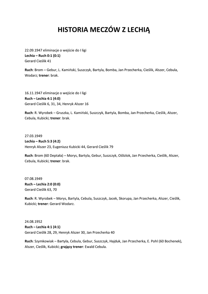 HISTORIA MECZÓW Z LECHIĄ 22.09.1947 eliminacje o wejście do I ligi Lechia – Ruch 0:1 (0:1) Gerard Cieślik 41 Ruch: Brom – Gebur, L. Kamiński, Suszczyk, Bartyla, Bomba, Jan Przecherka, Cieślik, Alszer, Cebula, Wodarz; trener: brak. 16.11.1947 eliminacje o wejście do I ligi Ruch – Lechia 4:1 (4:0) Gerard Cieślik 6, 31, 34, Henryk Alszer 16 Ruch: R. Wyrobek – Gruszka, L. Kamiński, Suszczyk, Bartyla, Bomba, Jan Przecherka, Cieślik, Alszer, Cebula, Kubicki; trener: brak. 27.03.1949 Lechia – Ruch 5:3 (4:2) Henryk Alszer 23, Eugeniusz Kubicki 44, Gerard Cieślik 79 Ruch: Brom (60 Deptała) – Morys, Bartyla, Gebur, Suszczyk, Oślizlok, Jan Przecherka, Cieślik, Alszer, Cebula, Kubicki; trener: brak. 07.08.1949 Ruch – Lechia 2:0 (0:0) Gerard Cieślik 63, 70 Ruch: R. Wyrobek – Morys, Bartyla, Cebula, Suszczyk, Jacek, Skorupa, Jan Przecherka, Alszer, Cieślik, Kubicki; trener: Gerard Wodarz. 24.08.1952 Ruch – Lechia 4:1 (4:1) Gerard Cieślik 28, 29, Henryk Alszer 30, Jan Przecherka 40 Ruch: Szymkowiak – Bartyla, Cebula, Gebur, Suszczyk, Hajduk, Jan Przecherka, E. Pohl (60 Bochenek), Alszer, Cieślik, Kubicki; grający trener: Ewald Cebula. 12.10.1952 Lechia – Ruch 0:3 (0:1) Jan Przecherka 5, Eugeniusz Kubicki 70, Gerard Cieślik 90 Ruch: R. Wyrobek – Bartyla, Cebula, Hajduk, Suszczyk, Siemierski, Jan Przecherka, Pieda, Alszer, Cieślik, Kubicki; grający trener: Ewald Cebula. 29.03.1953 Lechia – Ruch 0:1 (0:1) Gerard Cieślik 14 Ruch: R. Wyrobek – Gebur, Bartyla, Bomba, Suszczyk, Siemierski, Mateja, E. Pohl, O. Breiter, Cieślik, Kubicki; trener: Ewald Cebula. 23.08.1953 Ruch – Lechia 3:0 (0:0) Gerard Cieślik 67, 85, Hubert Pala 75 Ruch: R. Wyrobek – Gebur, Bartyla, J. Pohl, Suszczyk, Siemierski, Mateja, Pieda (62 E. Pohl), Alszer, Cieślik, Pala; trener: Ewald Cebula. 12.06.1955 Lechia – Ruch 2:2 (1:0) Gerard Cieślik 62, 66 Ruch: R. Wyrobek – Gebur, Bartyla, Bomba, Suszczyk, Tim (46 Mateja), E. Pohl, J. Pohl, Alszer, Cieślik, Wiśniewski; trener: Adam Niemiec. 13.11.1955 Ruch – Lechia 0:0 Ruch: R. Wyrobek – Gebur (71 Kubicki), Bartyla, Bomba, Suszczyk, J. Pohl, E. Pohl, Cieślik, Alszer, Tim, Wiśniewski; trener: Adam Niemiec. 29.04.1956 Lechia – Ruch 2:2 (1:1) Hubert Pala 41, Jan Wiśniewski 75 Ruch: R. Wyrobek – Ksol, Bartyla, Bomba, Suszczyk, Nieroba, Pala, Droździok, Alszer, Cieślik, Wiśniewski; trener: Adam Niemiec. 19.09.1956 Ruch – Lechia 1:1 (0:1) Hubert Pala 60 Ruch: Breguła – Gebur, Bartyla, Bomba, Suszczyk, Nieroba, E. Pohl, Tim, Pala, Cieślik, Wiśniewski; trener: Adam Niemiec. 30.06.1957 Lechia – Ruch 1:0 (1:0) Ruch: Breguła – E. Pohl, Smołka, Bomba, Siemierski, Pieda, Prutek, Nieroba, Cieślik, Polok, Bochenek; trener: Mikołaj Beljung. 10.11.1957 Ruch – Lechia 4:1 (2:1) Gerard Cieślik 18, 19, Kazimierz Polok 62, Eugeniusz Lerch 86 Ruch: R. Wyrobek – E. Pohl, Bomba, Nieroba, Siemierski, Pieda, Bochenek, Polok, Cieślik, Lerch, Droździok; trener: Czesław Suszczyk. 08.06.1958 Lechia- Ruch 2:1 (1:1) Gerard Cieślik 25 Ruch: R. Wyrobek – E. Pohl, Siemierski, Bomba, Suszczyk, Pieda, Bem, Nieroba, Lerch, Cieślik, H. Pala; trener: János Steiner. 19.10.1958 Ruch – Lechia 0:2 (0:1) Ruch: R. Wyrobek – E. Pohl, Siemierski, H. Pala, Suszczyk, Pieda, Bochenek, Gasz, Lerch, Cieślik, E. Piechaczek; trener: János Steiner. 15.03.1959 Ruch – Lechia 0:0 Ruch: : R. Wyrobek – E. Pohl, Siemierski, H. Pala, Suszczyk, Nieroba, Bochenek, Pieda, Lerch, Cieślik, Łysko; trener: Ewald Cebula. 02.08.1959 Lechia – Ruch 1:3 (1:1) Bernard Bem 3, Eugeniusz Lerch 60, Gerard Cieślik 63 Ruch: R. Wyrobek – E. Pohl, Siemierski, H. Pala, Nieroba, Pieda, Gasz (46 J. Pohl), Polok, Lerch, Cieślik, Bem; trener: Ewald Cebula. 22.05.1960 Lechia – Ruch 2:0 (1:0) Ruch: R. Wyrobek – E. Pohl, Siemierski, H. Pala, Nieroba, Pieda, Łysko, Bem, Lerch, Schmidt, E. Faber; trener: János Steiner. 25.08.1960 Ruch – Lechia 2:1 (1:1) Jan Schmidt 29, Alojzy Łysko 60 Ruch: R. Wyrobek – E. Pohl, Manowski, H. Pala, Siemierski, Pieda, Polok, Łysko, Schmidt, Gasz, E. Faber; trener: Lajos Szolár. 15.04.1961 Lechia – Ruch 0:0 Ruch: R. Wyrobek – E. Pohl, Siemierski, H. Pala, Nieroba, Pieda, Polok, Bem, Lerch, J. Pohl, Łysko (46 Schmidt); trener: Gerard Cieślik. 19.08.1961 Ruch – Lechia 2:1 (1:0) Eugeniusz Lerch 15, Jan Schmidt 65 Ruch: R. Wyrobek – E. Pohl, Siemierski, Łysko, Nieroba, Pieda, Polok, Lerch, Schmidt, Gasz, E. Faber; trener: Sándor Tatrai. 18.11.1962 Lechia – Ruch 1:3 (0:2) Eugeniusz Faber 18, 19, Antoni Nieroba 68 Ruch: Pietrek (82 Barow) – E. Pohl, Janduda, H. Pala, Nieroba, Bem, Polok, Buchacz, Lerch, Kasprzyk, E. Faber; trener: Sándor Tatrai. 16.06.1963 Ruch – Lechia 1:0 (1:0) Eugeniusz Lerch 42 Ruch: Barow – Kempka, Janduda, Łysko, Nieroba, Pieda, Polok, Bem, Lerch, Kasprzyk, E. Faber; trener: Sándor Tatrai. 08.06.1983 ½ finału Pucharu Polski Lechia – Ruch 0:0 pd. karne 3-1 Ruch: Jojko – Curyło, K. Gawara, Walot, Wrona, Nowak, Szewczyk, Benigier (58 Grzybowski), Lorens (91 Jaworski), Mikulski, M. Bąk; trener: Orest Lenczyk. 15.09.1984 Lechia – Ruch 2:1 (1:1) Albin Mikulski 39 Ruch: Jojko – Pałka, E. Kamiński, Walot, Szewczyk (85 W. Fornalik), K Szuster, Jaworski, Nowak, Warzycha, Waliczek, Mikulski; trener: Alojzy Łysko. 20.04.1985 Ruch – Lechia 1:0 (1:0) Krzysztof Warzycha 10 Ruch: Jojko – Fornalak, Waleszczyk, E. Kamiński, W. Fornalik, Nowak, Walot, Szewczyk (73 Jaworski), Warzycha, K. Szuster (46 Sermak), Mikulski; trener: Władysław Żmuda. 06.10.1985 Lechia – Ruch 2:0 (0:0) Ruch: Jojko – Pałka, Waleszczyk, Walot, W. Fornalik, Nowak, Warzycha, Szewczyk, Kapica (46 Jaworski), Mikulski, M. Bąk (68 K. Szuster); trener: Władysław Żmuda. 06.04.1986 Ruch – Lechia 0:1 (0:1) Ruch: Jojko – Pałka, Waleszczyk, Walot (70 Chorzewski), W. Fornalik, Nowak (46 Waliczek), Warzycha, Szewczyk, Fornalak, Kapica, M. Bąk; trener: Władysław Żmuda. 20.09.1986 Lechia – Ruch 0:1 (0