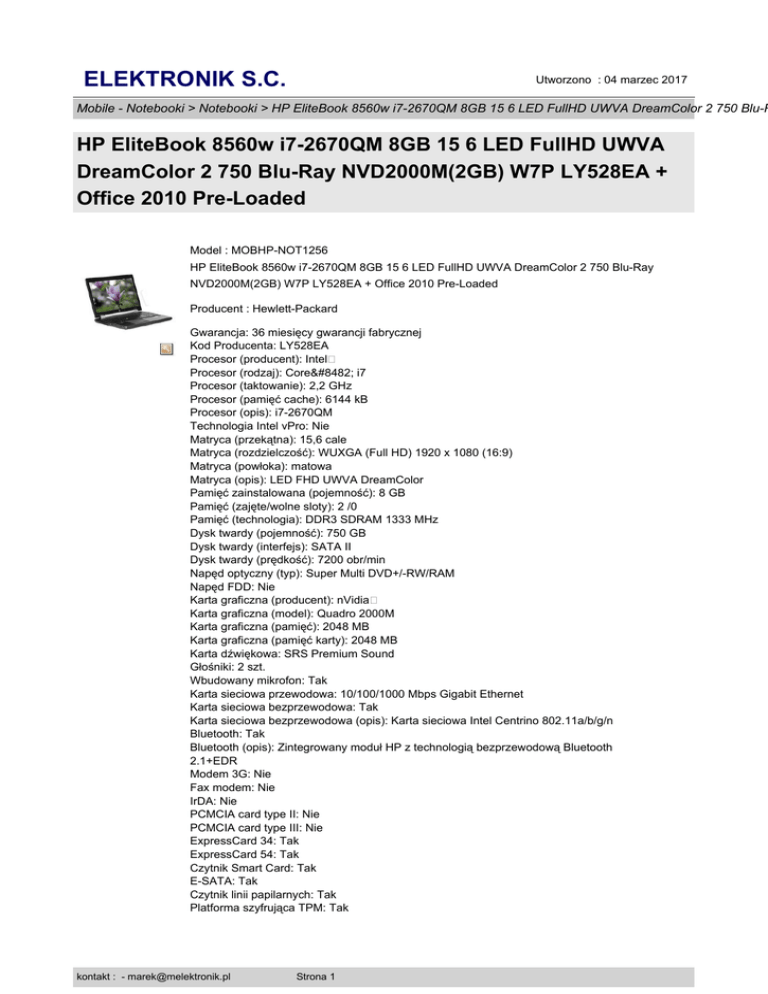 ELEKTRONIK S.C. Utworzono : 04 marzec 2017 Mobile - Notebooki > Notebooki > HP EliteBook 8560w i7-2670QM 8GB 15 6 LED FullHD UWVA DreamColor 2 750 Blu-R HP EliteBook 8560w i7-2670QM 8GB 15 6 LED FullHD UWVA DreamColor 2 750 Blu-Ray NVD2000M(2GB) W7P LY528EA + Office 2010 Pre-Loaded Model : MOBHP-NOT1256 HP EliteBook 8560w i7-2670QM 8GB 15 6 LED FullHD UWVA DreamColor 2 750 Blu-Ray NVD2000M(2GB) W7P LY528EA + Office 2010 Pre-Loaded Producent : Hewlett-Packard Gwarancja: 36 miesięcy gwarancji fabrycznej Kod Producenta: LY528EA Procesor (producent): Intel� Procesor (rodzaj): Core™ i7 Procesor (taktowanie): 2,2 GHz Procesor (pamięć cache): 6144 kB Procesor (opis): i7-2670QM Technologia Intel vPro: Nie Matryca (przekątna): 15,6 cale Matryca (rozdzielczość): WUXGA (Full HD) 1920 x 1080 (16:9) Matryca (powłoka): matowa Matryca (opis): LED FHD UWVA DreamColor Pamięć zainstalowana (pojemność): 8 GB Pamięć (zajęte/wolne sloty): 2 /0 Pamięć (technologia): DDR3 SDRAM 1333 MHz Dysk twardy (pojemność): 750 GB Dysk twardy (interfejs): SATA II Dysk twardy (prędkość): 7200 obr/min Napęd optyczny (typ): Super Multi DVD+/-RW/RAM Napęd FDD: Nie Karta graficzna (producent): nVidia� Karta graficzna (model): Quadro 2000M Karta graficzna (pamięć): 2048 MB Karta graficzna (pamięć karty): 2048 MB Karta dźwiękowa: SRS Premium Sound Głośniki: 2 szt. Wbudowany mikrofon: Tak Karta sieciowa przewodowa: 10/100/1000 Mbps Gigabit Ethernet Karta sieciowa bezprzewodowa: Tak Karta sieciowa bezprzewodowa (opis): Karta sieciowa Intel Centrino 802.11a/b/g/n Bluetooth: Tak Bluetooth (opis): Zintegrowany moduł HP z technologią bezprzewodową Bluetooth 2.1+EDR Modem 3G: Nie Fax modem: Nie IrDA: Nie PCMCIA card type II: Nie PCMCIA card type III: Nie ExpressCard 34: Tak ExpressCard 54: Tak Czytnik Smart Card: Tak E-SATA: Tak Czytnik linii papilarnych: Tak Platforma szyfrująca TPM: Tak kontakt : - [email protected] Strona 1 ELEKTRONIK S.C. Utworzono : 04 marzec 2017 Mobile - Notebooki > Notebooki > HP EliteBook 8560w i7-2670QM 8GB 15 6 LED FullHD UWVA DreamColor 2 750 Blu-R HP EliteBook 8560w i7-2670QM 8GB 15 6 LED FullHD UWVA DreamColor 2 750 Blu-Ray NVD2000M(2GB) W7P LY528EA + Office 2010 Pre-Loaded Kensington Lock: Tak Display Port: Tak DVI-D: Nie HDMI: Nie VGA (RGB): Tak S-video/TV-out: Nie AV-in (Tuner TV): Nie Line-in: Nie Line-out: Tak Wejście mikrofonu: Tak S/PDIF: Nie LPT (równoległy): Nie RS232 (szeregowy): Nie Moduł GPS: Nie Czytnik kart pamięci: Tak Czytnik kart pamięci (opis): SD, MMC Panel klawiszy multimedialnych: Nie Złącze replikatora portów: Tak Fire-Wire (IEEE1394): Tak USB 2.0: 3 szt. USB 3.0: 2 szt. System operacyjny: Windows 7 Professional 64 bit System operacyjny (wer. Językowa): polski Dodatkowe oprogramowanie: Roxio My DVD 2010 SE, Fabrycznie zainstalowany pakiet Microsoft Office 2010 (aktywacja całego pakietu Office 2010 wymaga zakupienia klucza produktu), Norton Internet Security 2011 (z 60-dniową subskrypcją) Wbudowana kamera: Tak Wbudowana kamera (opis): Kamera internetowa HD Wbudowana kamera obrotowa: Nie Urządzenie wskazujące: Tabliczka dotykowa z przyciskiem wł./wył., przewijanie w dwóch kierunkach, sterowanie palcami, trzy przyciski wyboru Wskaźnik pointstick z trzema dodatkowymi przyciskami Akumulator (technologia): 8-ogniwowy akumulator litowy HP Long Life (75 Wh) Akumulator (czas pracy): 5 h Wymiary (wysokość): 35 mm Wymiary (szerokość): 382 mm Wymiary (głębokość): 258 mm Waga: 3 kg Gwarancja: 36 mies Gwarancja międzynarodowa: Tak Gwarancja baterii: 36 mies Wyposażenie: Zasilacz zewnętrzny Smart 200 W Opis: Obsługa technologii Intel AT, Śruba zabezpieczająca dolną pokrywę, Gniazdo zabezpieczeń, HP Disk Sanitizer, One-Step Logon, HP SpareKey, Enhanced Pre-Boot Security (Multiuser / Multifactor)Przenośna i wydajna stacja robocza. Najbardziej wszechstronna przenośna stacja robocza HP stanowi połączenie dużej mocy obliczeniowej i profesjonalnej grafiki oferowane w artystycznej obudowie.Specjaliści, którzy potrzebują cienkiego i lekkiego komputera zapewniającego maksymalnie długi czas pracy, znakomitą wydajność oraz profesjonalną kartę graficzną z certyfikatami niezależnych producentów kontakt : - [email protected] Strona 2 ELEKTRONIK S.C. Utworzono : 04 marzec 2017 Mobile - Notebooki > Notebooki > HP EliteBook 8560w i7-2670QM 8GB 15 6 LED FullHD UWVA DreamColor 2 750 Blu-R HP EliteBook 8560w i7-2670QM 8GB 15 6 LED FullHD UWVA DreamColor 2 750 Blu-Ray NVD2000M(2GB) W7P LY528EA + Office 2010 Pre-Loaded oprogramowaniaSpełnia wytrzymałościowe normy Armii Amerykańskiej (MIL-STD 810G) Adres www producenta: Link na stronę opisu technicznego Podświetlana klawiatura: Nie Cena : 9.007,10 zł Brutto ( 7.382,87 zł Netto) Dostępność: Produkt dostępny w naszym sklepie od 13 styczeń 2012 kontakt : - [email protected] Strona 3