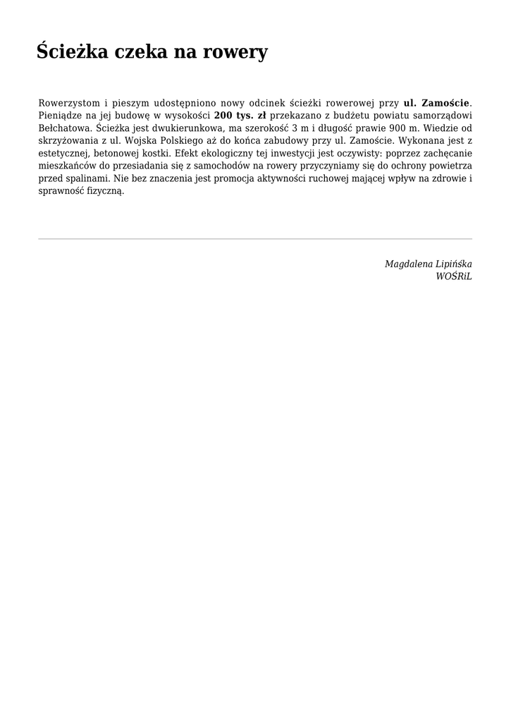 Ścieżka czeka na rowery Rowerzystom i pieszym udostępniono nowy odcinek ścieżki rowerowej przy ul. Zamoście. Pieniądze na jej budowę w wysokości 200 tys. zł przekazano z budżetu powiatu samorządowi Bełchatowa. Ścieżka jest dwukierunkowa, ma szerokość 3 m i długość prawie 900 m. Wiedzie od skrzyżowania z ul. Wojska Polskiego aż do końca zabudowy przy ul. Zamoście. Wykonana jest z estetycznej, betonowej kostki. Efekt ekologiczny tej inwestycji jest oczywisty: poprzez zachęcanie mieszkańców do przesiadania się z samochodów na rowery przyczyniamy się do ochrony powietrza przed spalinami. Nie bez znaczenia jest promocja aktywności ruchowej mającej wpływ na zdrowie i sprawność fizyczną. Magdalena Lipińśka WOŚRiL