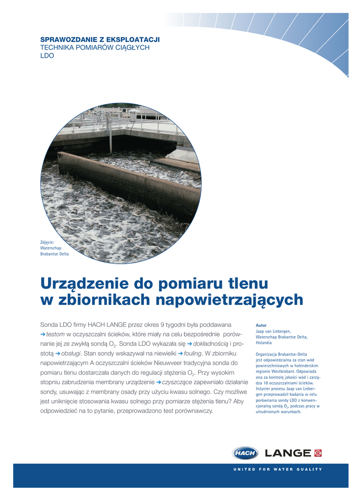 SPRAWOZDANIE Z EKSPLOATACJI TECHNIKA POMIARÓW CIĄGŁYCH LDO Zdjęcie: Waterschap Brabantse Delta Urządzenie do pomiaru tlenu w zbiornikach napowietrzających Sonda LDO firmy HACH LANGE przez okres 9 tygodni była poddawana ➔ testom w oczyszczalni ścieków, które miały na celu bezpośrednie porów- nanie jej ze zwykłą sondą O2. Sonda LDO wykazała się ➔ dokładnością i prostotą ➔ obsługi. Stan sondy wskazywał na niewielki ➔ fouling. W zbiorniku napowietrzającym A oczyszczalni ścieków Nieuwveer tradycyjna sonda do pomiaru tlenu dostarczała danych do regulacji stężenia O2. Przy wysokim stopniu zabrudzenia membrany urządzenie ➔ czyszczące zapewniało działanie sondy, usuwając z membrany osady przy użyciu kwasu solnego. Czy możliwe jest uniknięcie stosowania kwasu solnego przy pomiarze stężenia tlenu? Aby odpowiedzieć na to pytanie, przeprowadzono test porównawczy. Autor Jaap van Liebergen, Waterschap Brabantse Delta, Holandia Organizacja Brabantse-Delta jest odpowiedzialna za stan wód powierzchniowych w holenderskim regionie Westbrabant. Odpowiada ona za kontrolę jakości wód i zarządza 18 oczyszczalniami ścieków. Inżynier procesu Jaap van Liebergen przeprowadził badania w celu porównania sondy LDO z konwencjonalną sondą O2, podczas pracy w utrudnionych warunkach. LDO_TLEN Test: Znalezienie odpowiedniego urządzenia do pomiaru tlenu w zbiorniku A Pożądany wynik: Rezygnacja z użycia kwasu solnego Dziewięciotygodniowy program testowy dla dwóch sond O2 Fotodioda LED Dioda referencyjna LED Wzbudzenie Emitowane czermateriału niebie- wone światło skim światłem Proces pomiarowy LDO www.hach-lange.pl Przedstawienie problemu W zbiorniku A (pierwszy etap z dużym obciążeniem) oczyszczalni ścieków Nieuwveer do regulacji zawartości tlenu jest stosowane konwencjonalne urządzenie do pomiaru tlenu. Urządzenie pomiarowe funkcjonuje bez zarzutu. Jest ono wyposażone w urządzenie czyszczące dla utrzymania membrany w czystości oraz zapewnienia prawidłowej pracy. Do czyszczenia stosuje się kwas solny. Pożądane byłoby urządzenie do pomiaru tlenu pracujące bez stosowania kwasu solnego. Dlatego zdecydowano przetestować inne urządzenie do pomiaru tlenu. Jest nim urządzenie do pomiaru tlenu w technologii LDO firmy HACH LANGE. LDO – sposób działania Stężenie tlenu jest zasadniczo oznaczane za pomocą pomiaru emisji światła. Światło niebieskie o dużej energii zostaje skierowane na powierzchnię sondy, która jest pokryta materiałem luminescencyjnym. Elektrony materiału luminescencyjnego przechodzą na wyższy poziom energetyczny i emitują czerwone światło podczas powrotu na energetyczny poziom wyjściowy. Światło to jest rejestrowane przez fotodiodę. Cząsteczki tlenu w roztworze w zetknięciu z materiałem luminescencyjnym przejmują energię od wzbudzonych elektronów, powodując spadek intensywności światła emitowanego przez materiał luminescencyjny. W materiale luminescencyjnym powstają dodatkowo drgania. W ten sposób skraca się czas, w którym elektrony wracają do stanu wyjściowego. Zmiana ta jest mierzona i korelowana ze stężeniem tlenu w roztworze. Rozplanowanie próby Sonda do pomiaru tlenu do zostaje zamontowana na tej samej głębokości, na której znajduje się konwencjonalne urządzenie do pomiaru tlenu, w jego pobliżu. Sygnały z obydwu urządzeń pomiarowych są wysyłane do urządzenia rejestrującego i co minutę zapisywane. Program testowy jest następujący: 1. Pomiary kontrolne są wykonywane dwa razy w tygodniu (zawsze w poniedziałki i czwartki). 2. Pomiary kontrolne są wykonywane za pomocą urządzenia do pomiarów polowych na tej samej głębokości i w tym samym miejscu, w którym znajduje się zamontowane na stałe urządzenie do pomiaru tlenu. Urządzenie do pomiarów polowych jest kalibrowane przed każdym użyciem. 3. Wskazywane wartości wszystkich urządzeń do pomiaru tlenu są zapisywane podczas pomiarów kontrolnych. Obok wartości tlenu zapisywane są również wartości temperatury. 4. W trakcie przeprowadzania pomiarów kontrolnych w urządzeniu rejestrującym zapisywany jest również czas. 5. Wyniki są zapisywane w protokole. 6. Urządzenia do pomiaru tlenu są czyszczone dopiero wtedy, jeżeli pomiary kontrolne wykazują różnicę powyżej 1 mg/l. Próba trwa dziewięć tygodni. Pierwszy tydzień po zainstalowaniu jest traktowany jako tydzień testowy. Pomiary zostają przeprowadzone i zapisane. Próba trwała od 10 listopada 2003 do 12 stycznia 2004. Porównanie sond O2 Zapisane dane zostały wydrukowane i porównane. Próba udowodniła, że urządzenia pomiarowe wykazują podobne zmiany wartości pomiarowych w czasie. Przykład kształtu krzywej pomiarowej uzyskanej na obu urządzeniach przedstawiono na ilustracji 1. Znaczne różnice można stwierdzić jedynie sporadycznie. Są one spowodowane ręcznym usuwaniem osadów zanieczyszczeń z istniejących urządzeń pomiarowych. Odzwierciedla to charakterystyczny peak na wykresie (patrz ilustracja 2). Wyniki pomiarów polowych pokazano w tabeli 1. Na ilustracji 3 zestawiono pomiary dwóch pracujących w sposób nieprzerwany urządzeń w porównaniu z pomiarami polowymi. Współczynniki regresji urządzeń do pomiaru tlenu wynoszą w konwencjonalnym i alternatywnym urządzeniu pomiarowym 0,63 oraz 0,93. Współczynnik R2 w przypadku konwencjonalnego urządzenia pomiarowego jest przeciętny, w przypadku alternatywnego urządzenia pomiarowego dobry. O2 [mg/l] 8 7 6 5 4 3 2 1 0 25-12-03 26-12-03 26-12-03 26-12-03 26-12-03 27-12-03 27-12-03 27-12-03 27-12-03 28-12-03 28-12-03 28-12-03 28-12-03 29-12-03 29-12-03 29-12-03 18:00 0:00 6:00 12:00 18:00 0:00 6:00 12:00 18:00 0:00 6:00 12:00 18:00 0:00 6:00 12:00 Niebieski = konwencjonalne urządzenie do pomiaru O2 Czerwony = alternatywne urządzenie do pomiaru O2 LDO Data Ilustracja 1: Krzywa pomiaru O2 konwencjonalnego urządzenia i LDO O2 [mg/l] 10 9 8 Czyszczenie urządzen