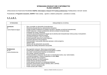 WYMAGANIA EDUKACYJNE Z INFORMATYKI KLASA CZWARTA OPRACOWANO NA PODSTAWIE PROGRAMU KlikPlik. Informatyka w klasach IV-VI szkoły podstawowej I PODRĘCZNIKA O NR DOP. 58/09/S Przewidziane w Programie nauczania „KlikPlik” treści zostały, - zgodnie z układem podręcznika – podzielone na działy. START OSIĄGNIĘCIA UCZNIA WYMAGANIA Konieczne K ocena dopuszczająca Podstawowe K+P ocena dostateczna – – – – – – – – – – – – – – Dba o porządek na stanowisku komputerowym. Wymienia przynajmniej trzy zastosowania komputera. Podaje przykład urządzenia ze swojego otoczenia, opartego na technice komputerowej. Potrafi rozpoznać i nazwać podstawowe elementy zestawu komputerowego. Posługuje się myszą i klawiaturą. Z pomocą nauczyciela poprawnie loguje się do szkolnej sieci komputerowej i kończy pracę z komputerem. Określa podstawowe elementy pulpitu. Uruchamia programy z ikony na pulpicie. Potrafi poprawnie zakończyć pracę programu. RozróŜnia elementy okna programu. Pod kierunkiem nauczyciela wykonuje operacje w oknie programu. Zakłada folder. Otwiera plik wg wskazówek nauczyciela. Zapisuje plik według wskazówek nauczyciela. – – – – – – – – – – – – – Zna regulamin pracowni. Stara się go przestrzegać. Potrafi podać przykłady wykorzystania komputerów w szkole. Zna układ i przeznaczenie klawiszy na klawiaturze. Zna rodzaje pamięci komputera. Potrafi prawidłowo zalogować się do sieci na indywidualne konto, oraz konto lokalne. Uruchamia programy z wykazu programów w menu Start. Nazywa elementy okna programu. Wykonuje operacje na oknie programu. Potrafi utworzyć strukturę folderów. Potrafi zapisać dokument we wskazanej lokalizacji. RozróŜnia zastosowanie poleceń ZAPISZ JAKO i ZAPISZ. Potrafi otworzyć wskazane pliki. Potrafi usuwać pliki i foldery. SZKOŁA PODSTAWOWA KLASA IV Rozszerzające (K + P) + R ocena dobra – – – – – – – – – – – – – – Omawia zasady zachowania się w pracowni komputerowej i przestrzega je. Potrafi podać przykłady wykorzystania komputerów w Ŝyciu codziennym. Wie, jakie urządzenia moŜna podłączyć do komputera. Potrafi wymienić rodzaje nośników pamięci zewnętrznej. Wie, czym jest pamięć operacyjna. Zna podstawowe skróty klawiaturowe. Potrafi utworzyć bezpieczne hasło. Zna, rozumie i stosuje zasady prawa. Potrafi zmienić nazwę istniejącego pliku. Zna pojęcie „rozszerzenie pliku". Potrafi wyjaśnić pojęcia plik, folder. Potrafi samodzielnie kopiować, przenosić i usuwać foldery. Potrafi zapisać dokument w róŜnych lokalizacjach. Potrafi modyfikować strukturę folderów (utworzyć strukturę dostosowaną do swoich potrzeb). Dopełniające (K + P + R) + D ocena bardzo dobra – – – – – – – – – – – – Wie, jakie zagroŜenia zdrowotne przynosi zbyt długa praca z komputerem. Wskazuje uŜyteczność zastosowania komputera do usprawnienia uczenia się. Korzysta z programów edukacyjnych. Potrafi wymienić rodzaje urządzeń zewnętrznych i objaśnić ich zastosowanie. Omawia elementy komputera znajdujące się w jednostce centralnej. Wie, czym jest system operacyjny. Zna jednostki pamięci. Sprawnie obsługuje klawiaturę. Odszukuje pliki w strukturze folderów. Rozpoznaje zawartość pliku po rozszerzeniu. Tworzy folder podczas zapisywania dokumentu w pliku. Potrafi odzyskać przypadkowo usunięty plik lub folder. – – – – Omawia przyczyny chorób związanych z obsługą komputera. Omawia działanie przykładowych urządzeń ze swojego otoczenia, opartych na technice komputerowej Tworzy skróty do plików i folderów; Omawia zasadę działania „Schowka” Ponadprogramowe (K + P + R + D) + PP ocena celująca SZKOŁA PODSTAWOWA KLASA IV TWORZYMY OSIĄGNIĘCIA UCZNIA WYMAGANIA Konieczne K ocena dopuszczająca Podstawowe K+P ocena dostateczna Rozszerzające (K + P) + R ocena dobra Dopełniające (K + P + R) + D ocena bardzo dobra Ponadprogramowe (K + P + R + D) + PP ocena celująca – – – – – – – – Nazywa poznany edytor grafiki. Uruchamia program graficzny wykorzystywany na lekcji z pomocą nauczyciela. Wypełnia kolorem gotowe elementy w edytorze grafiki. Rysuje proste elementy graficzne z wykorzystaniem narzędzia linia, krzywa, ołówek, pędzel. Rysuje figury geometryczne z wykorzystaniem dostępnych narzędzi w PRZYBORNIKU. Kopiuje pojedyncze elementy w obszarze rysunku. Potrafi cofnąć ostatnio wykonane operacje. Zapisuje prace z pomocą nauczyciela. – – – – – – – – Wskazuje elementy okna edytora grafiki. Wykonuje samodzielnie proste rysunki według określonego wzoru. Operuje kolorem rysowania i tła. Rysuje odcinki równoległe, prostopadłe oraz kwadraty i koła. Potrafi usunąć z rysunku drobne usterki. Potrafi zmieniać rozmiary elementów rysunku, usuwać RozróŜnia i potrafi zastosować kopiowanie z tłem i bez tła. Potrafi dołączyć tekst do obrazka. – – – – – – – – – Objaśnia zastosowanie elementów okna edytora grafiki. Korzysta z LUPY do likwidowania przerw (szczelin) w konturze rysunku Pobiera z rysunku kolory rysowania Potrafi ustalić atrybuty rysunku. Zna i rozumie pojęcie kompozycji. Korzysta ze Schowka do kopiowania elementów rysunku. Przekształca elementy rysunku (np. obraca, pochyla, tworzy lustrzane odbicie). Potrafi tworzyć ozdobne napisy według własnego projektu Świadomie podejmuje decyzję o zapisywaniu lub rezygnacji z zapisu zmian w pliku na dysku. – – Potrafi wybrać i zastosować właściwe, odpowiadające celowi pracy narzędzie. Potrafi stworzyć kompozycję według wzoru (samodzielnie wykonuje operacje na fragmencie rysunku: zaznacza, wycina, kopiuje i wkleja go do innego rysunku) Tworzy prace graficzne na zadany temat z wykorzystaniem poznanych narzędzi i funkcji poznanego programu graficznego. – – – – Zna nazwy popularnych edytorów grafiki. Wykorzystuje inny od poznanego program graficzny. Projektu