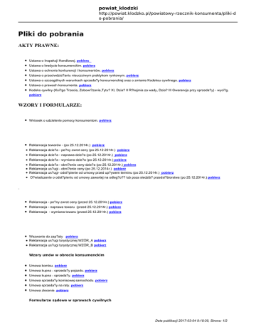 powiat_klodzki http://powiat.klodzko.pl/powiatowy-rzecznik-konsumenta/pliki-d o-pobrania/ Pliki do pobrania AKTY PRAWNE: Ustawa o Inspekcji Handlowej. pobierz Ustawa o kredycie konsumenckim. pobierz Ustawa o ochronie konkurencji i konsumentów. pobierz Ustawa o przeciwdzia?aniu nieuczciwym praktykom rynkowym. pobierz Ustawa o szczególnych warunkach sprzeda?y konsumenckiej oraz o zmianie Kodeksu cywilnego. pobierz Ustawa o prawach konsumenta. pobierz Kodeks cywilny (Ksi?ga Trzecia, Zobowi?zania,Tytu? XI, Dzia? II R?kojmia za wady, Dzia? III Gwarancja przy sprzeda?y) - wyci?g. pobierz WZORY I FORMULARZE: Wniosek o udzielenie pomocy konsumentom. pobierz Reklamacja towarów - (po 25.12.2014r.) pobierz Reklamacja dzie?a - pe?ny zwrot ceny (po 25.12.2014r.) pobierz Reklamacja dzie?a - naprawa dzie?a (po 25.12.2014r.) pobierz Reklamacja dzie?a - wymiana dzie?a (po 25.12.2014r.) pobierz Reklamacja dzie?a - obni?enie ceny dzie?a (po 25.12.2014r.) pobierz Reklamacja us?ugi - obni?enie ceny (po 25.12.2014r.) pobierz Reklamacja us?ugi- odst?pienie od umowy przed up?ywem terminu (po 25.12.2014r.) pobierz O?wiadczenie o odst?pieniu od umowy zawartej na odleg?o?? lub poza siedzib? przedsi?biorstwa (po 25.12.2014r.) pobierz Reklamacja - pe?ny zwrot ceny (przed 25.12.2014r.) pobierz Reklamacja - naprawa towaru (przed 25.12.2014r.) pobierz Reklamacja - wymiana towaru (przed 25.12.2014r.) pobierz Wezwanie do zap?aty pobierz Reklamacja us?ugi turystycznej WZÓR_A pobierz Reklamacja us?ugi turystycznej WZÓR_B pobierz Wzory umów w obrocie konsumenckim Umowa komisu. pobierz Umowa kupna - sprzeda?y pojazdu. pobierz Umowa kupna - sprzeda?y. pobierz Umowa sprzeda?y komisowej samochodu. pobierz Umowa sprzeda?y na raty. pobierz Umowa zlecenie. pobierz Formularze sądowe w sprawach cywilnych Data publikacji 2017-03-04 9:18:30, Strona: 1/2 powiat_klodzki http://powiat.klodzko.pl/powiatowy-rzecznik-konsumenta/pliki-d o-pobrania/ Pozew pobierz Pozew wzajemny pobierz Sprzeciw od wyroku zaocznego zarzuty od nakazu zap?aty i sprzeciw od nakazu zap?aty pobierz Odpowied? na pozew pobierz Data publikacji 2017-03-04 9:18:30, Strona: 2/2